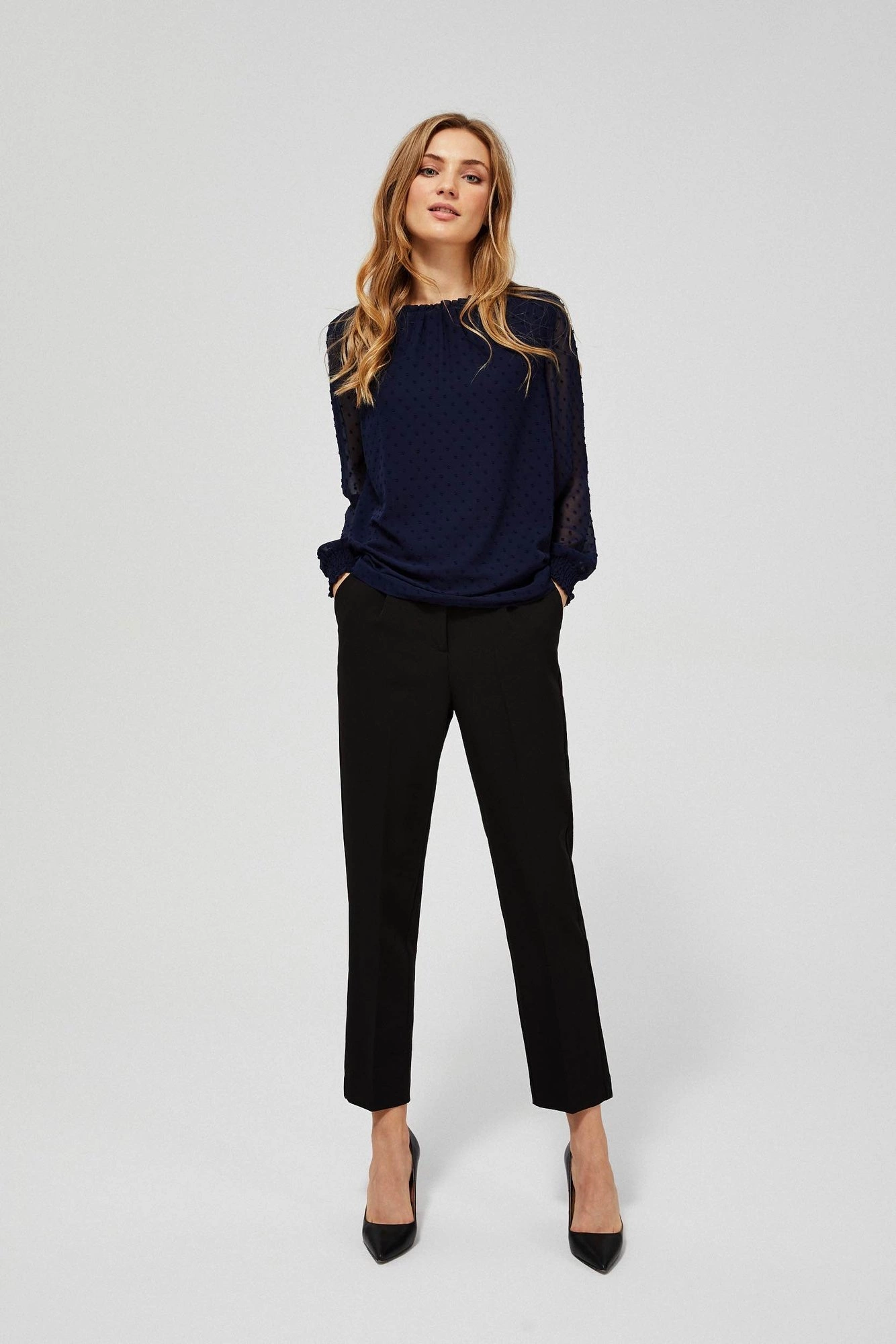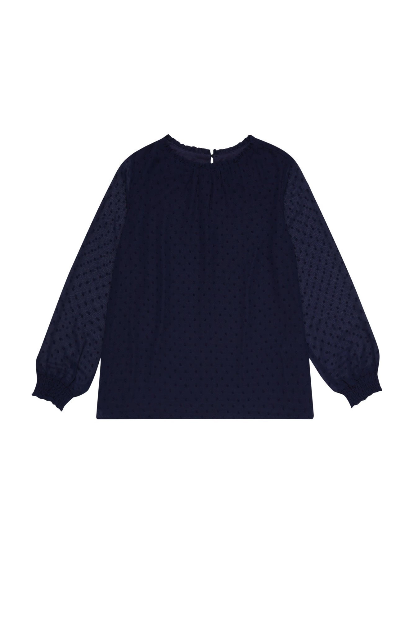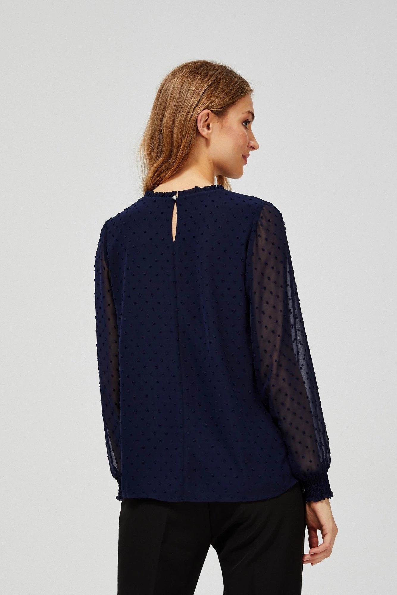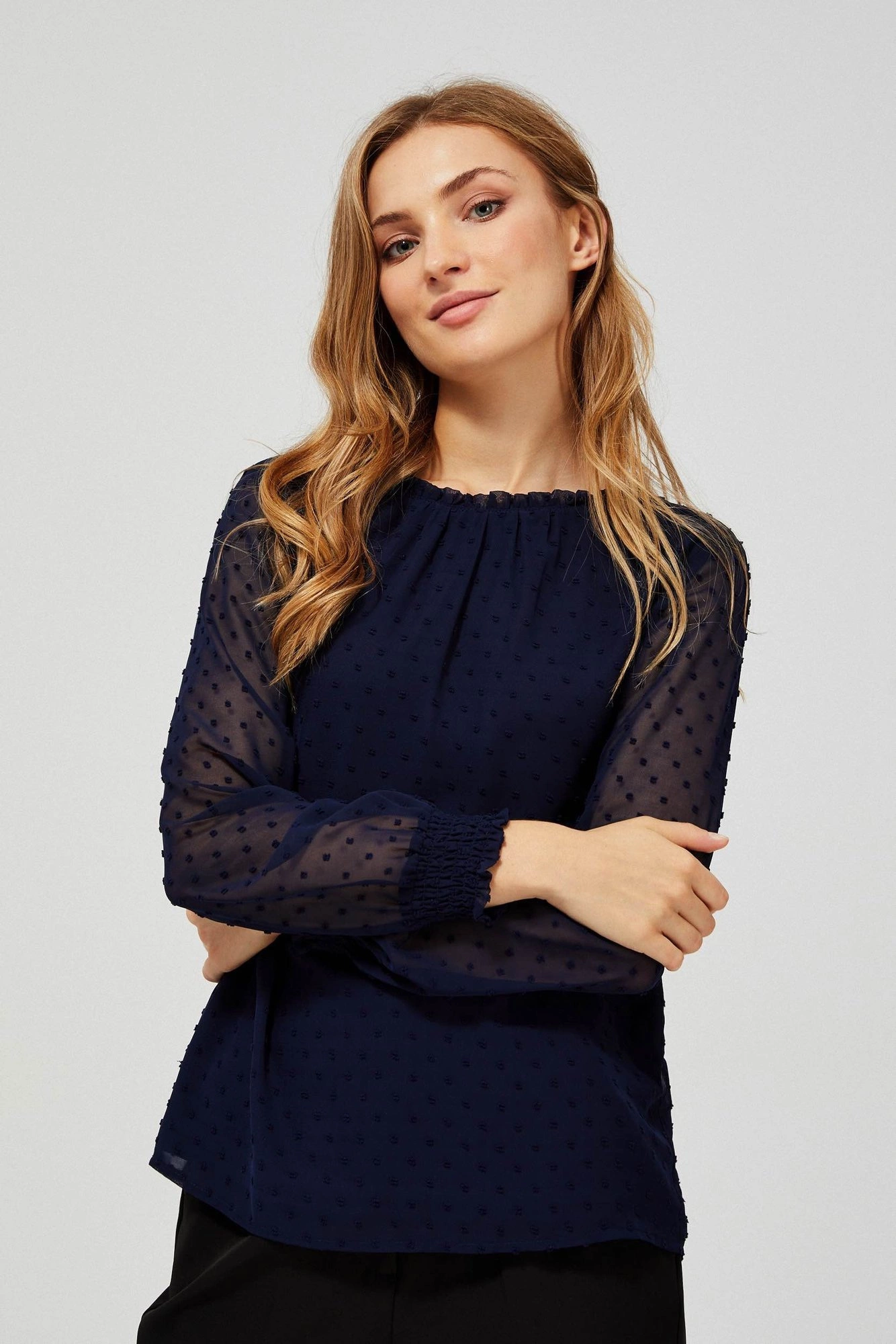 100% POLIESTER Urocza koszula z granatowego, przezroczystego poliestru. W całości pokryta groszkami. Przód i tył z marszczeniami, podszyte drugą warstwą materiału. Dekolt okrągły wykończony falbanką. Z tyłu zapięcie na guzik oraz niewielka łezka. Długie, transparentne rękawy zakończone marszczonym mankietem. Luźniejszy fason z łatwością dopasuje się do każdego typu sylwetki. Koszula idealnie sprawdzi się w eleganckich stylizacjach.