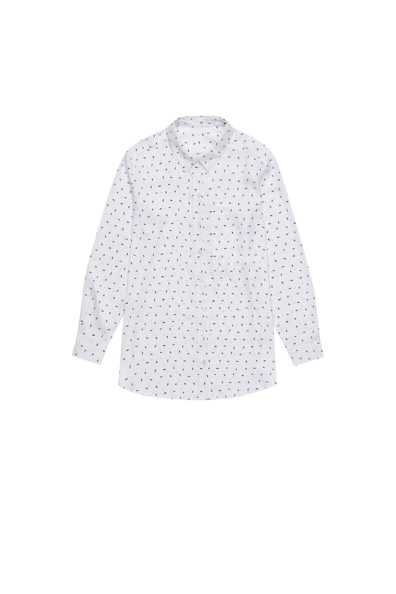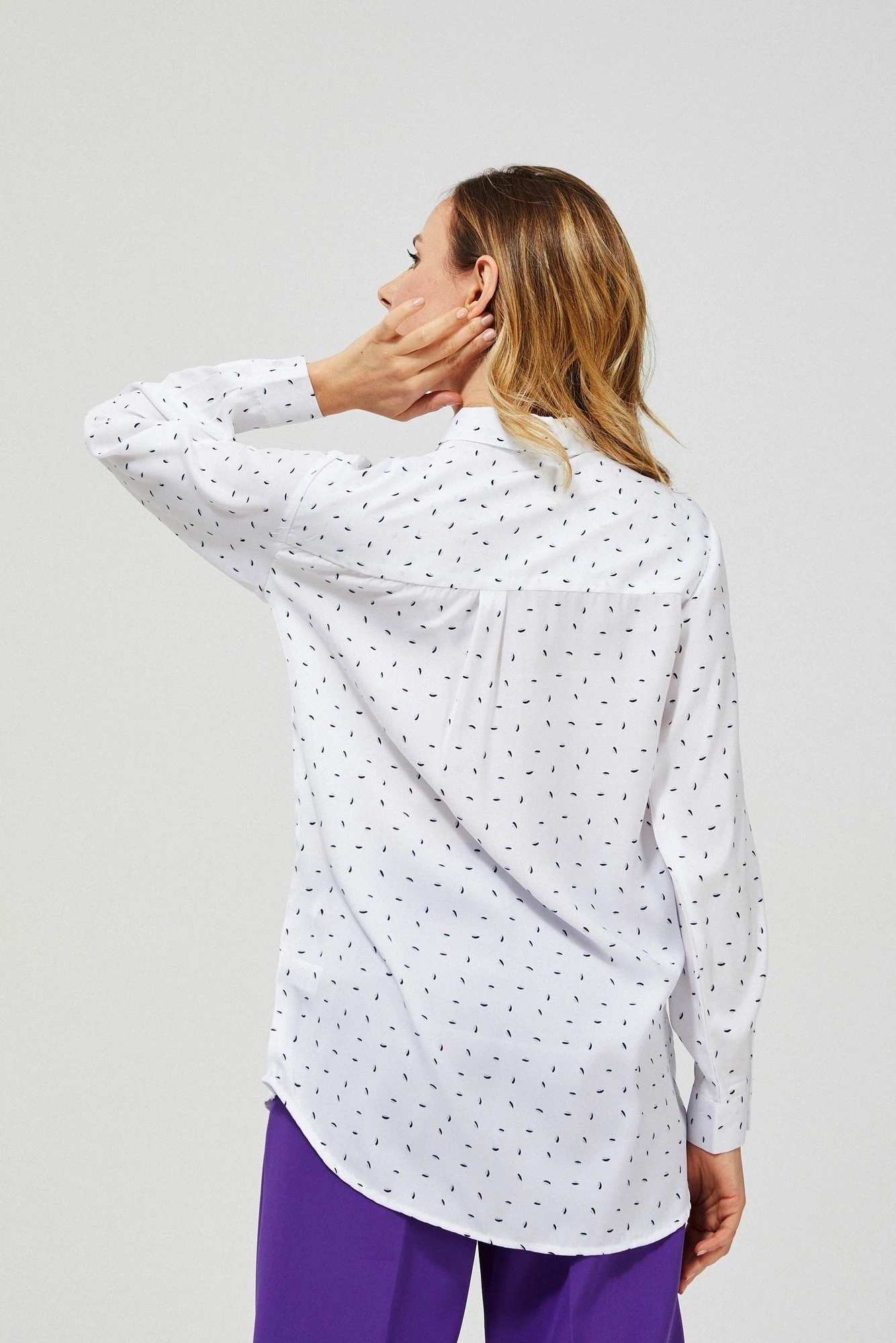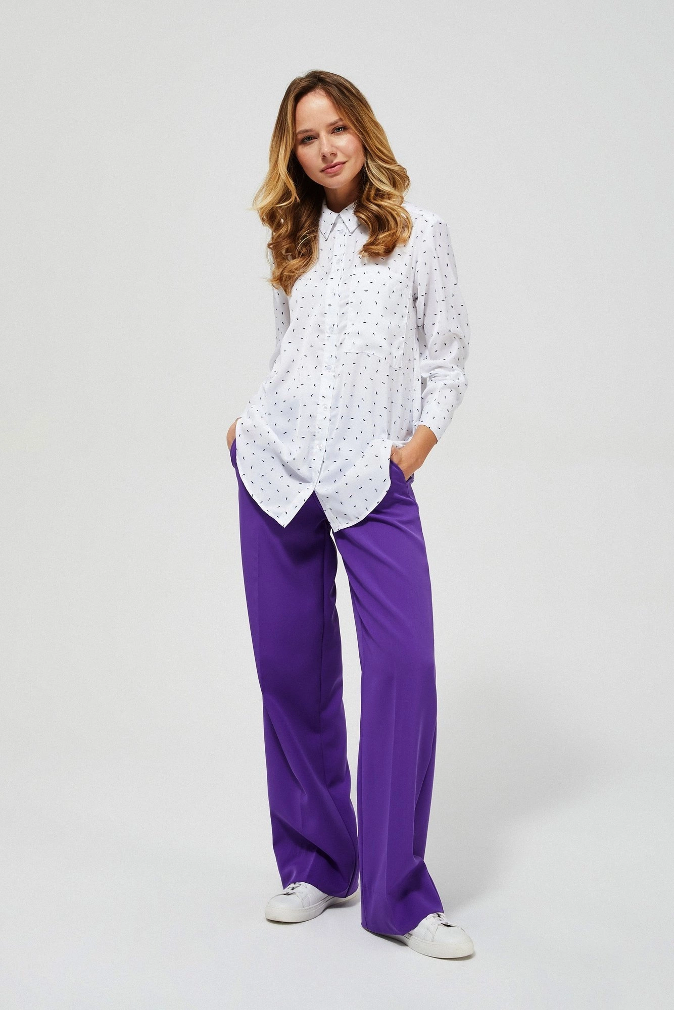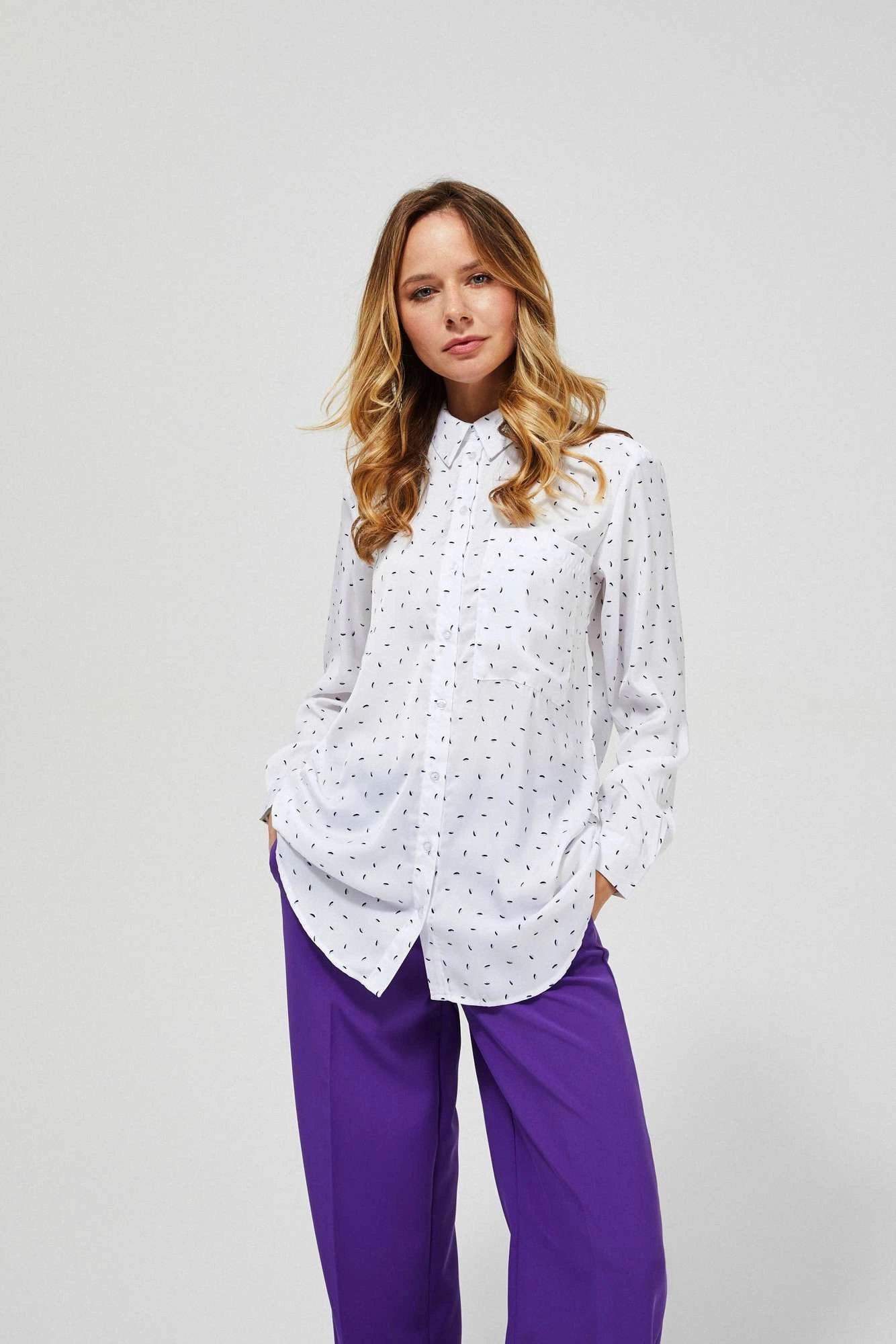 100% POLIESTER Damska koszula z klasycznym kołnierzykiem zapinanym na guzik. Uszyta z tkaniny w białym kolorze z gęsto nadrukowanymi czarnymi, drobnymi łezkami. Zapinana z przodu na guziki. Na wysokości piersi jedna kieszeń. Prosty, luźny krój z lekko zaokrąglonym dołem z przodu i tyłu. Na plecach ozdobna plisa. Długi rękaw z mankietem zapinanym na guzik. Doskonale pasuje do modnych, szerokich spodni w intensywnym fioletowym kolorze: L-SP-3400 D.VIOLET.