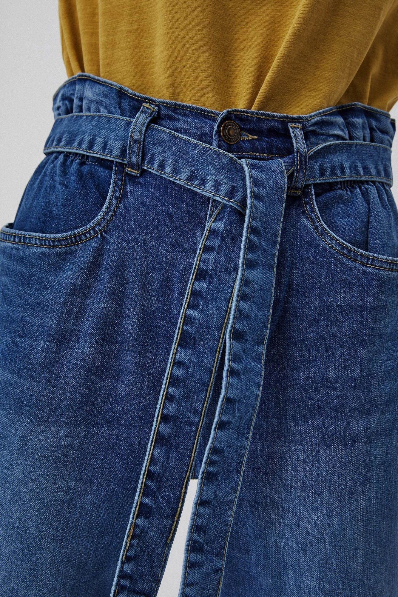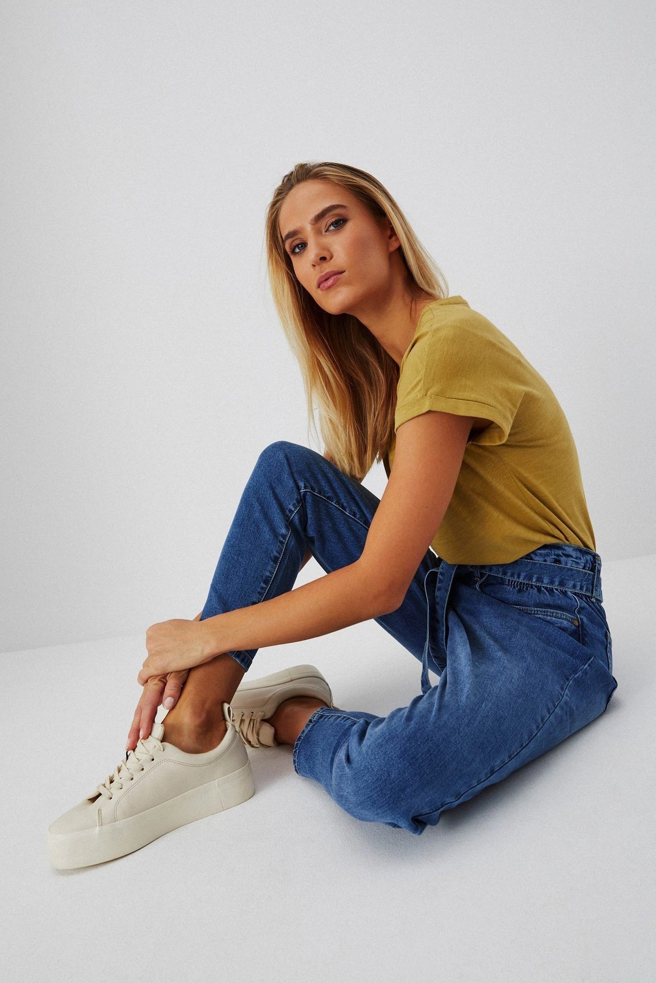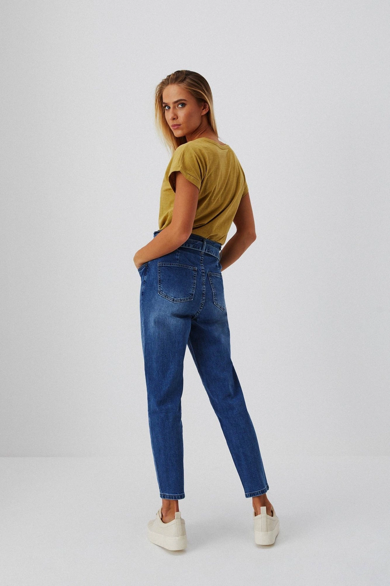 65% BAWEŁNA 30% POLIESTER 2% WISKOZA 3% ELASTAN Wygodne, niebieskie spodnie typu paperbag. Wysoki stan i gładki wzór. W pasie guma oraz szlufki. Materiałowy pasek do wiązania podkreślający talię. Zapięcie na guzik oraz zamek błyskawiczny. Wsuwane kieszenie na biodrach i pośladkach. Długie nogawki pumpy o nieco luźniejszym kroju, zwężane na dole. Jeansy paperbag to absolutny must-have w Twojej szafie! Muszisz je mieć.