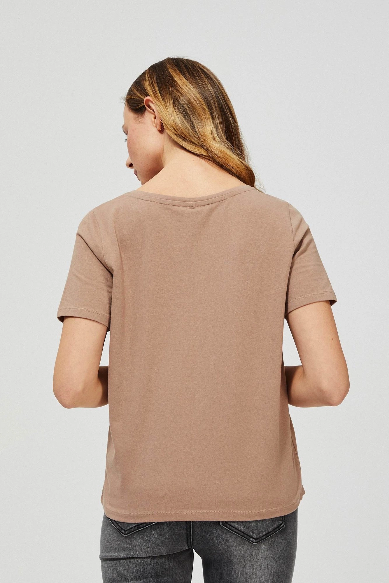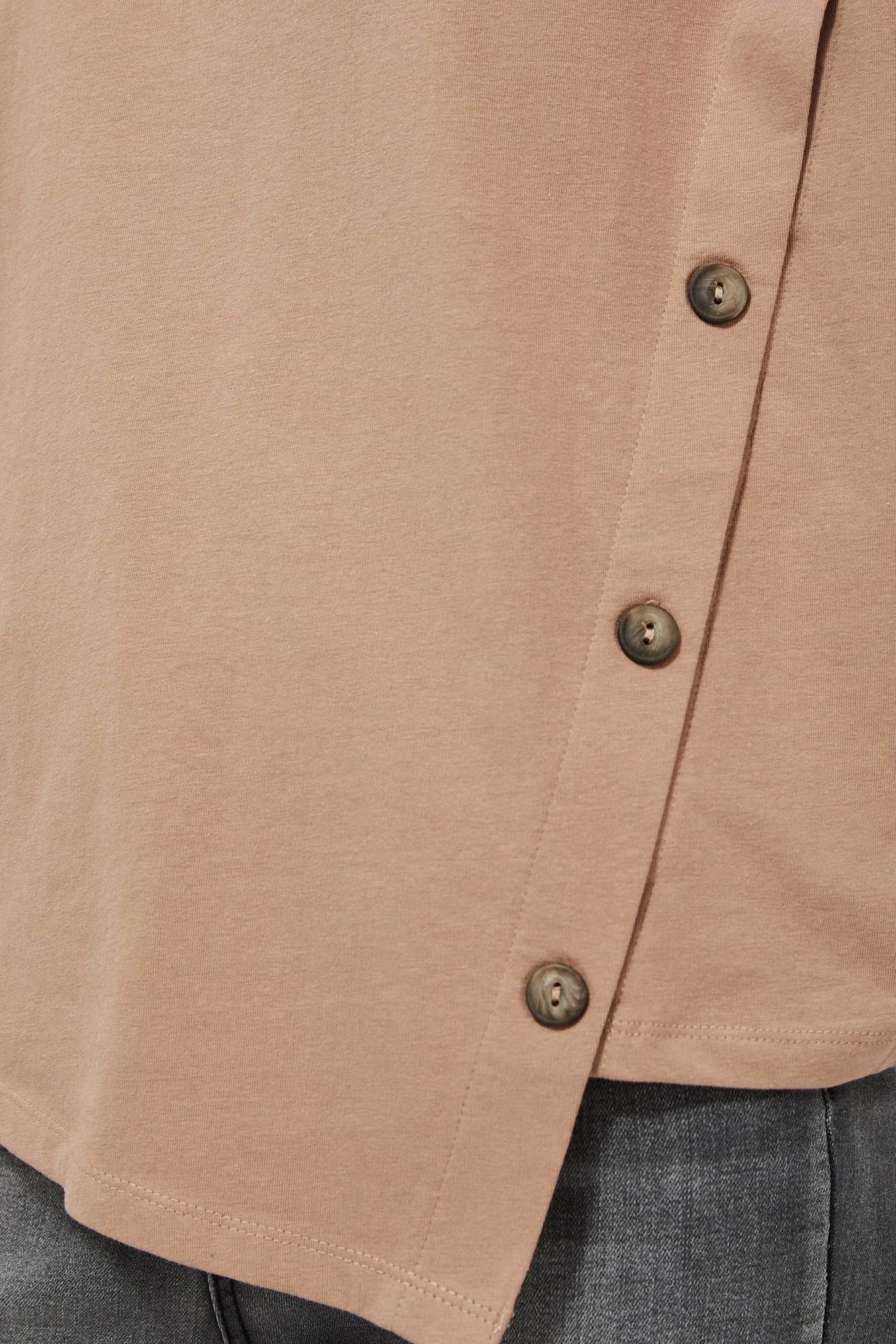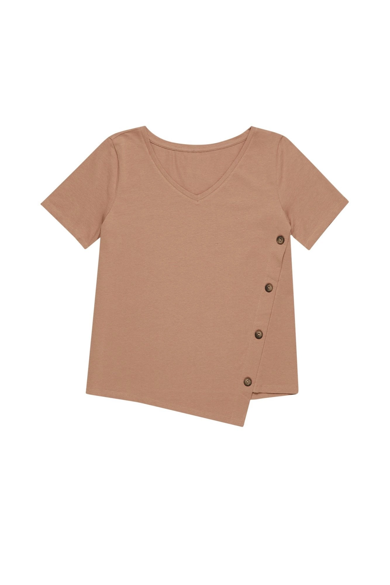 95% BAWEŁNA 5%ELASTAN Beżowa bluzka o oryginalnym kroju z asymetrycznym dołem. Gładka, bez wzoru. Krótki rękaw. Dekolt w serek. Z przodu, po skosie imitacja zapięcia na guziki. Prosty fason pasuje do każdego rodzaju sylwetki.