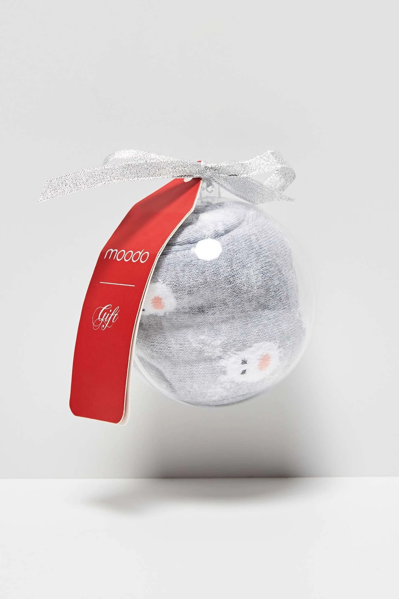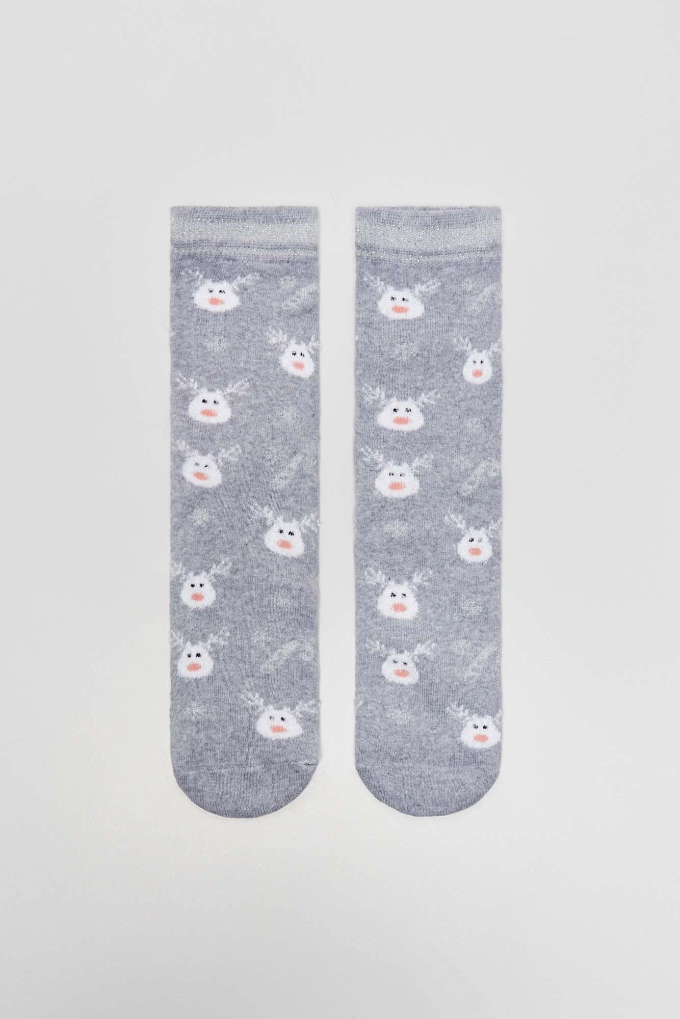 80% BAWEŁNA 13% POLIESTER 5% WŁÓKNO METALIZOWANE 2% ELASTAN Świąteczne, damskie skarpety w szarym kolorze. Na całości wzór reniferów. Ściągacz ozdobiony metaliczną nitką. Pięknie zapakowane w przezroczystą bombkę ze srebrną tasiemką u góry. Spraw prezent bliskiej osobie i wybierz ten model. Radość gwarantowana. Rozmiar uniwersalny: 37-40