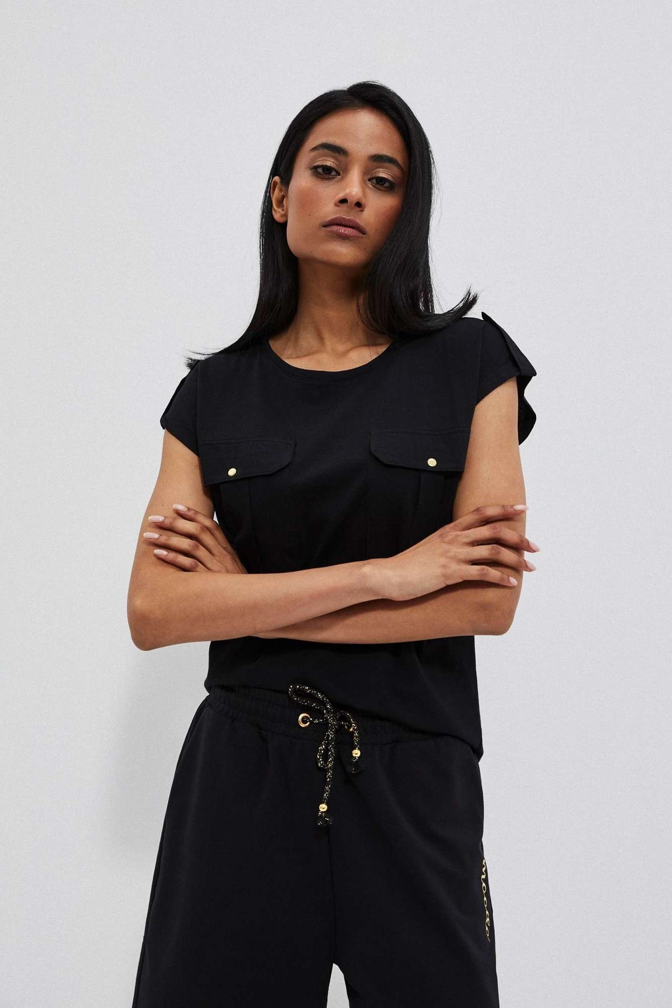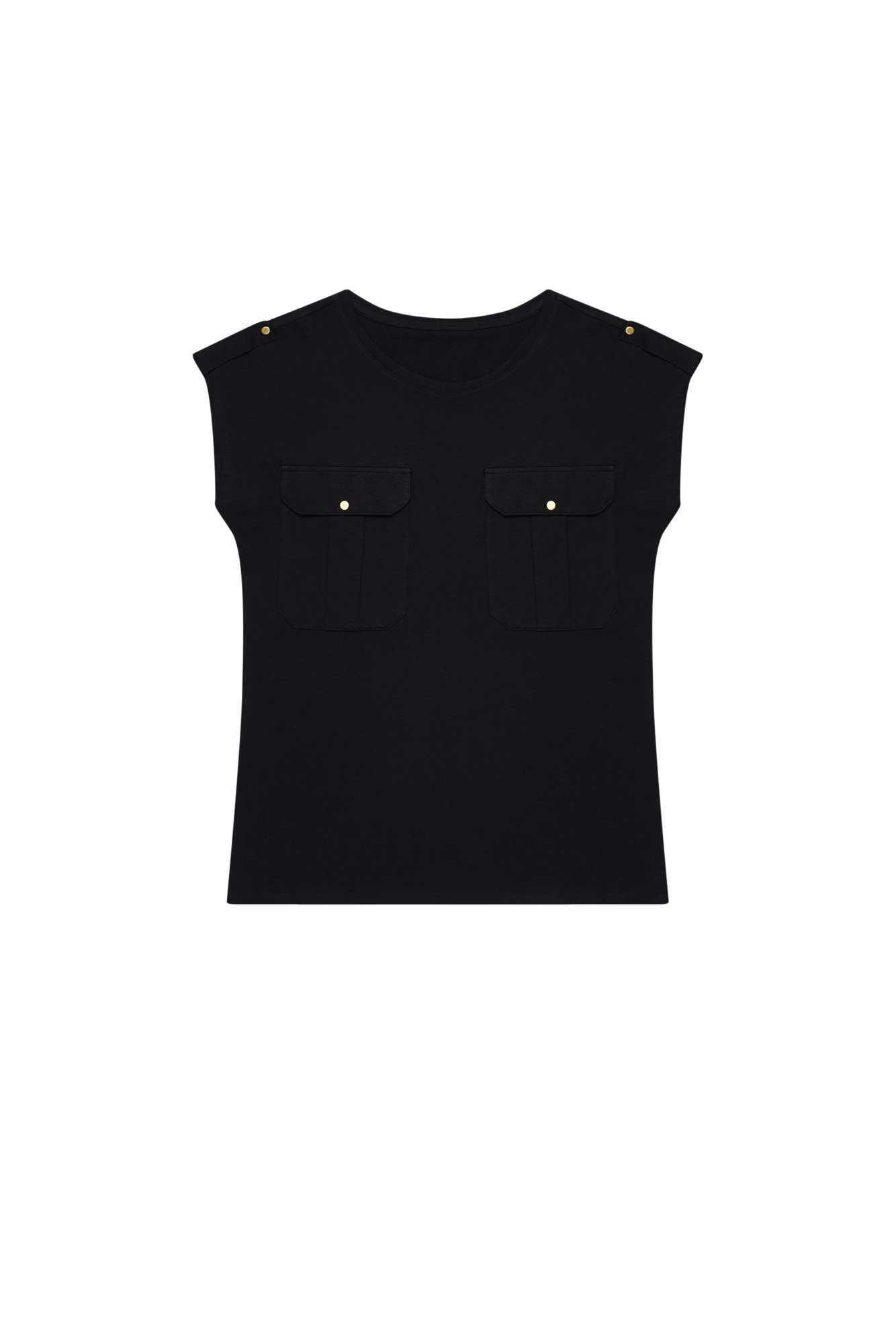 100% BAWEŁNA Bluzka do zadań specjalnych? Oto ona. Gładka, czarna, bez wzorów. Z krótkim rękawem i okrągłym dekoltem. Na ramionach patki z guzikiem. Lekko dopasowany krój, podkreślający sylwetkę. Na biuście ozdobne kieszenie z klapkami na guzik. Dobra propozycja na co dzień do długich lub krótkich spodni.