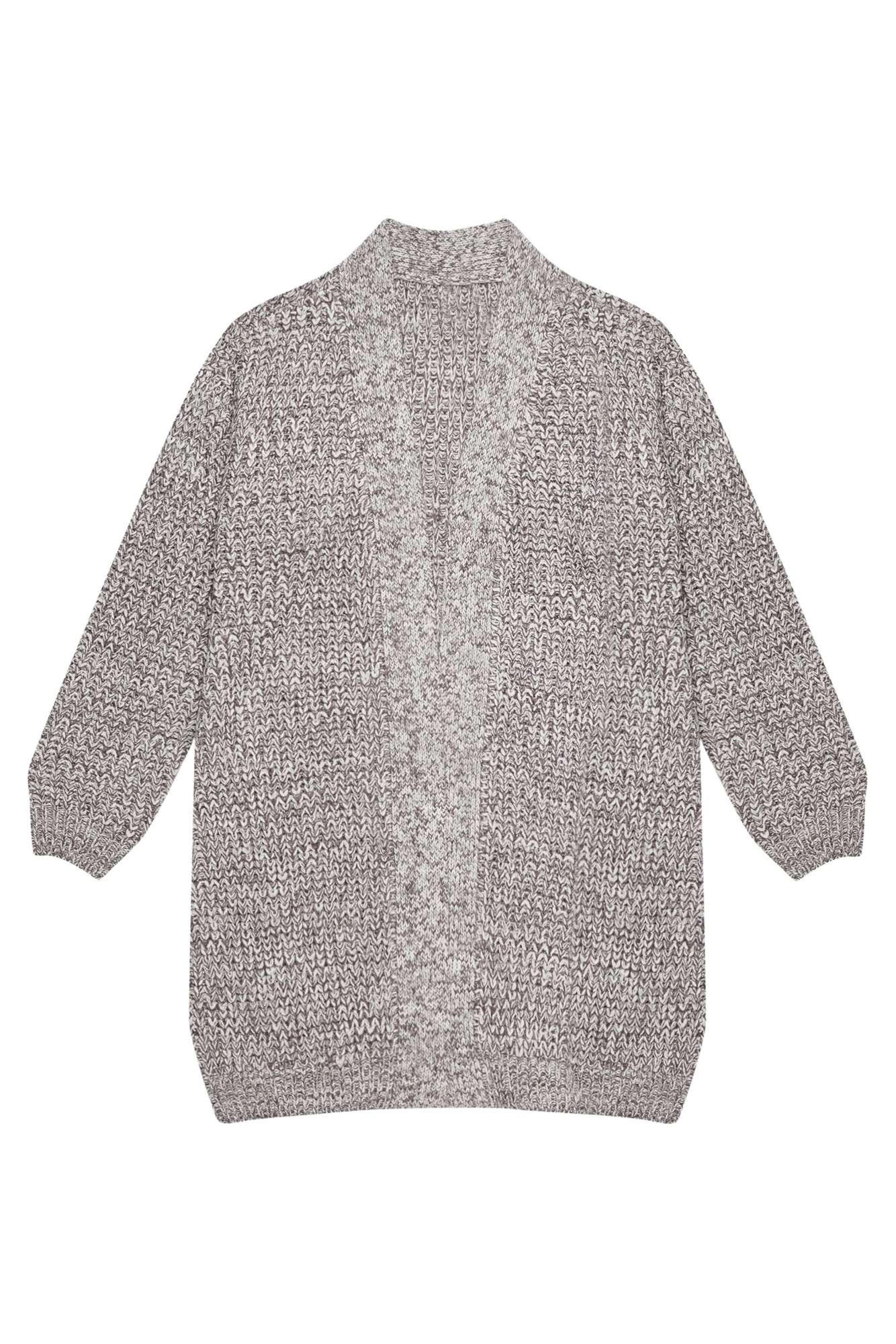 100%AKRYL. Luźny kardigan o długości do połowy uda. Długi rękaw, dekolt w serek, nie posiada zapięcia ani kieszeni. Kolor szary melanż. Doskonały zarówno do eleganckich, jak i sportowych stylizacji.