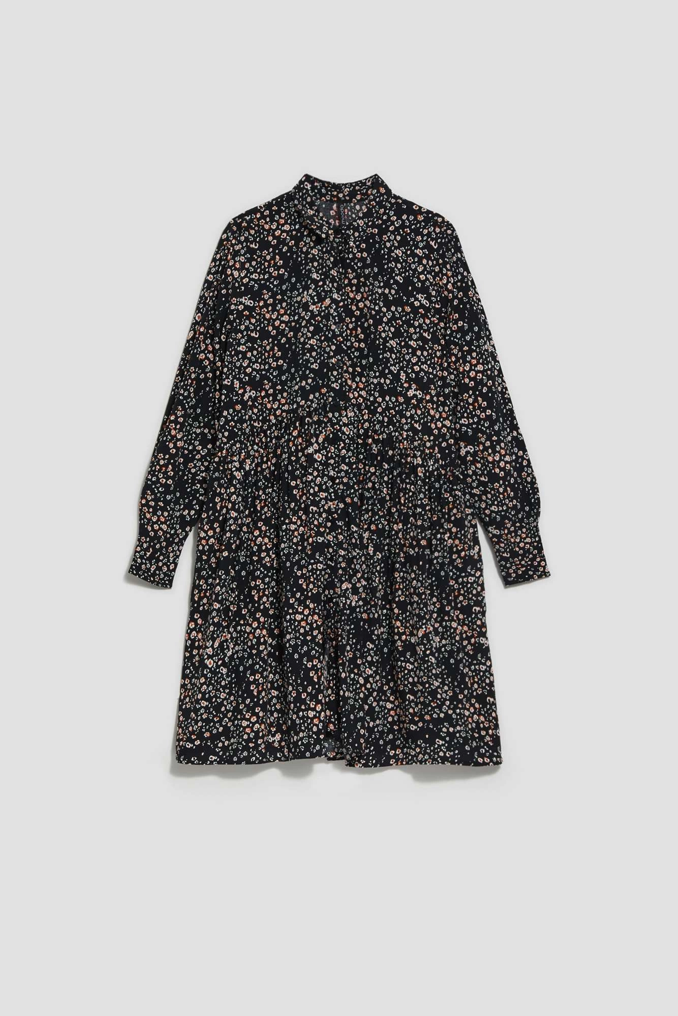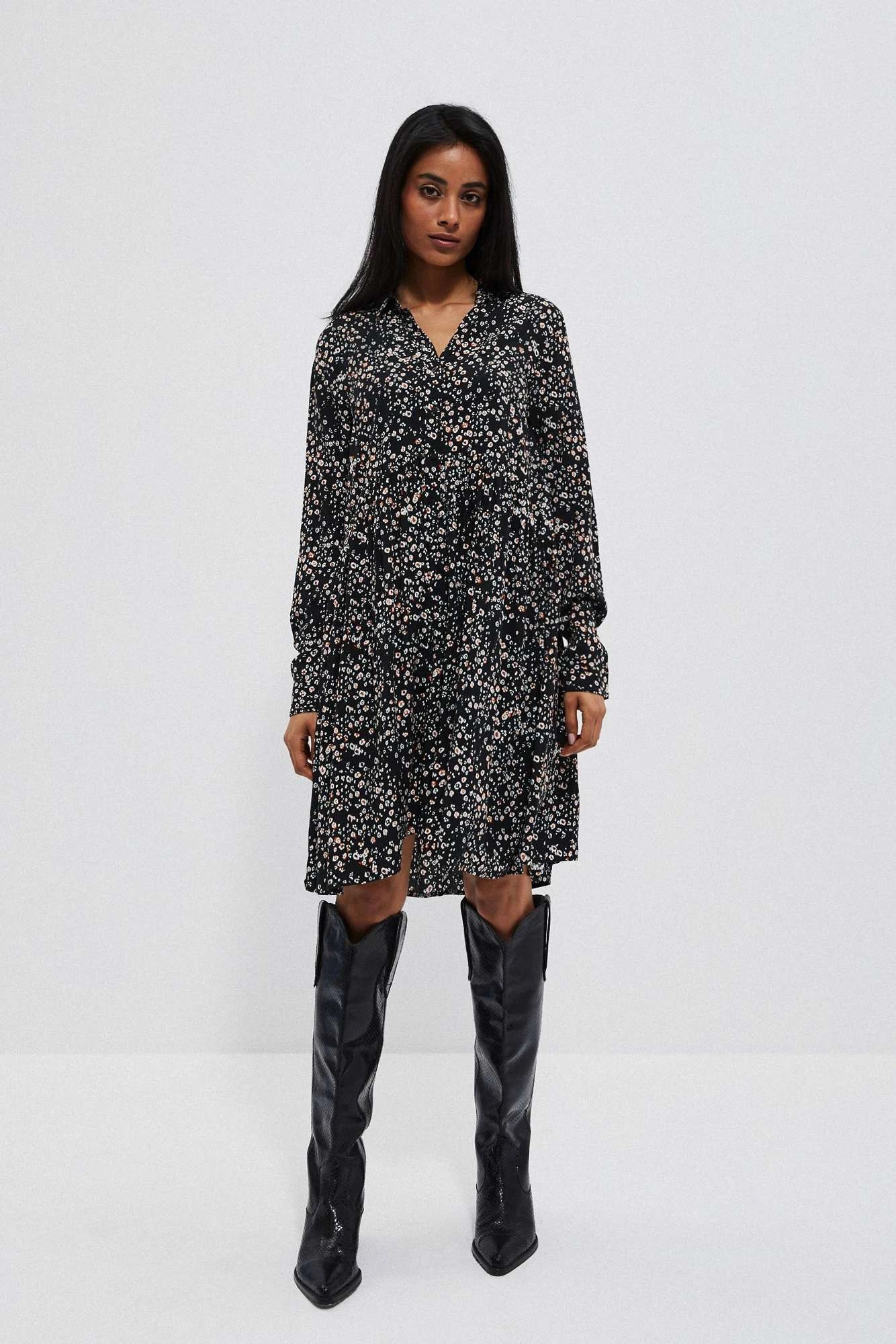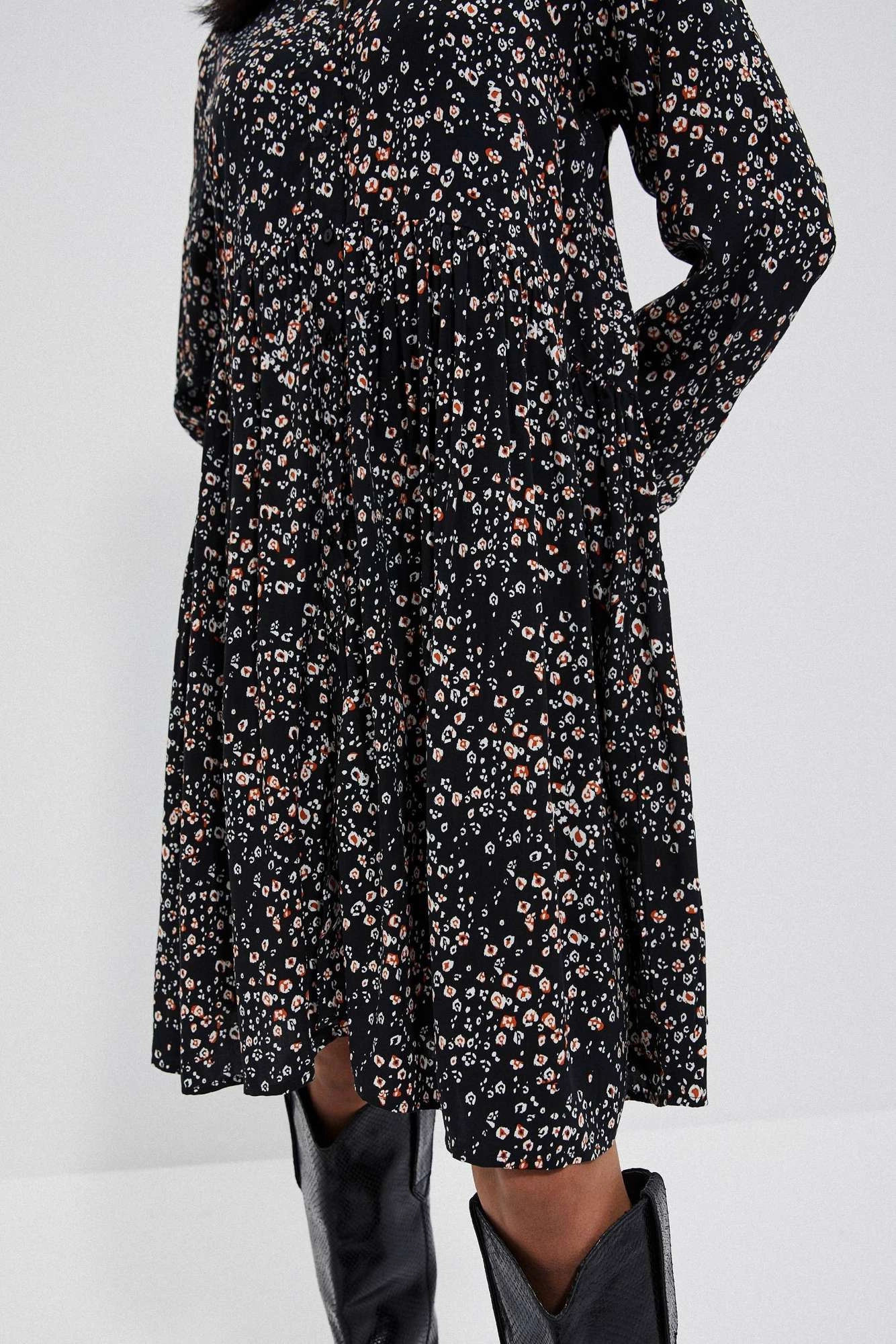 100%WISKOZA. Czarna sukienka z nadrukiem w jasne kropki o nierównych brzegach. Dekolt z kołnierzykiem, zakończony w szpic. Marszczenie materiału pod biustem. Całość zapinana na guziki. Długość przed kolano. Rozkloszowany fason. Wygodna i niekrepująca ruchów. Na co dzień i do pracy.