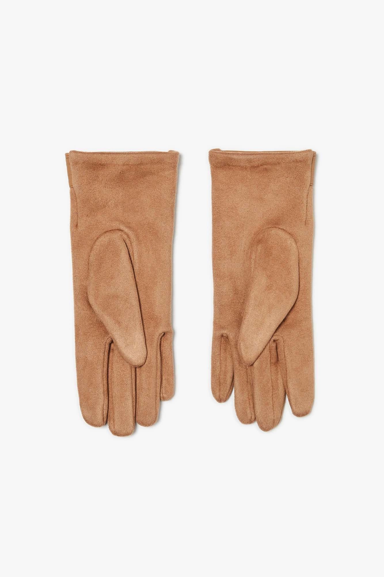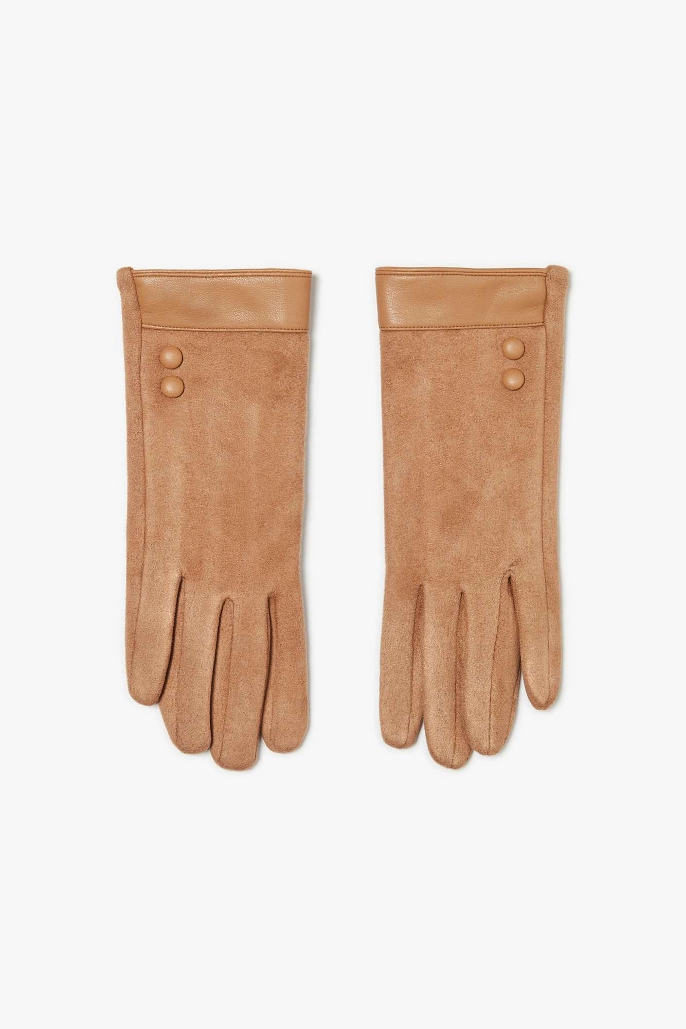 100%POLIESTER. Damskie rękawiczki w kolorze beżowym. Wykonane z miękkiego i komfortowego w noszeniu zamszu. Na wierzchniej stronie na wysokości nadgarstka pasek z imitacji skóry w kolorze beżowym, powyżej dwa guziki również w tym kolorze. Ciepłe i wygodne. Rozjaśnią zimowe stylizacje. Świetnie pasują do szalika i czapki w odcieniach brązu.