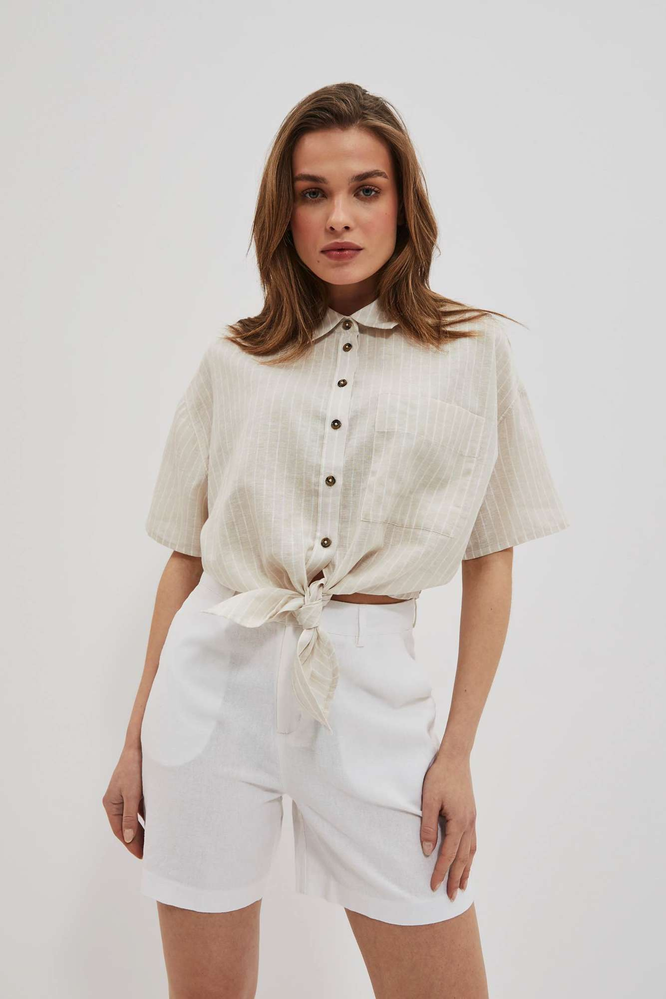 85%POLIESTER, 10%LEN, 5%BAWEŁNA Eleganckie szorty w kolorze białym. Wysoki stan, bardzo komfortowy w noszeniu. Krótkie i proste nogawki, do połowy uda. W talii zapinane na guzik oraz zamek błyskawiczny. Dodatkowo wszyte szlufki na pasek. Idealne na lato w zestawie z bluzkami lub koszulami.