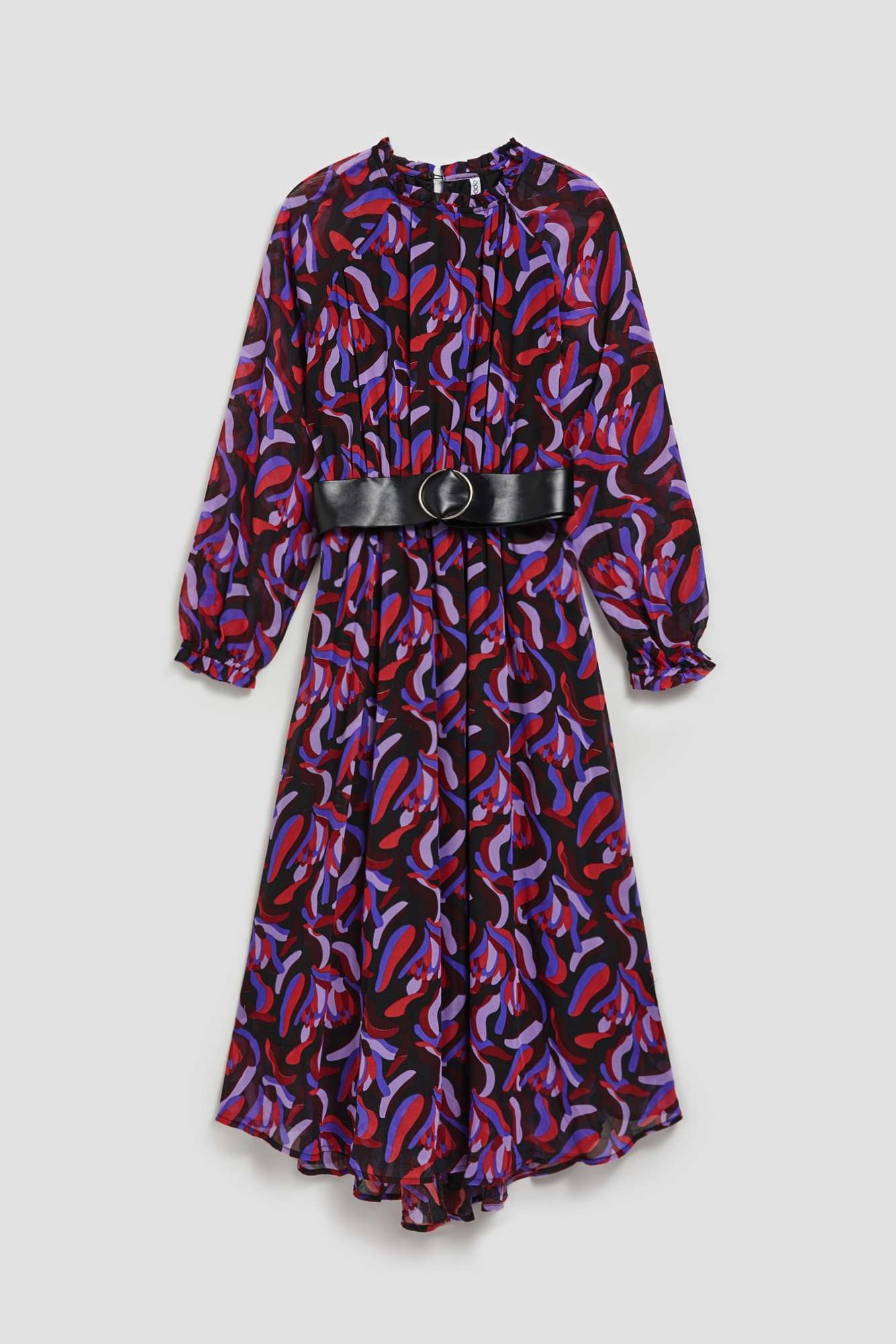 100% POLIESTER Elegancka sukienka będzie doskonałym dodatkiem do Twojej garderoby. Na całości nieregularny wzór w odcieniach fioletu. Wykonana jest z wysokiej jakości poliestru. Rozkloszowany dół sukienki z krótszymi bokami, w talii pasek podkreślający sylwetkę. Sukienka posiada marszczony dekolt i zapięcie z guzikiem z tyłu, co dodaje jej wyjątkowego charakteru. Jej długość do połowy łydki sprawia, że jest idealna zarówno na specjalne okazje, jak i na codzienne wyjścia. Możesz ją zestawić zarówno z eleganckimi szpilkami, jak i z casualowymi sneakersami. Sukienka ta zapewni Ci modny i stylowy wygląd bez względu na okazję.