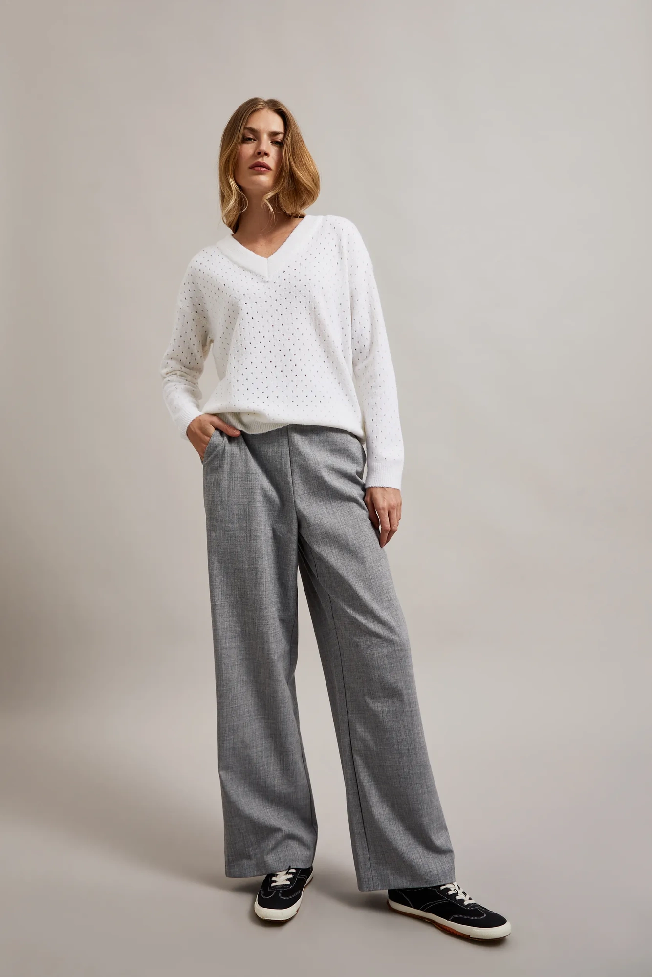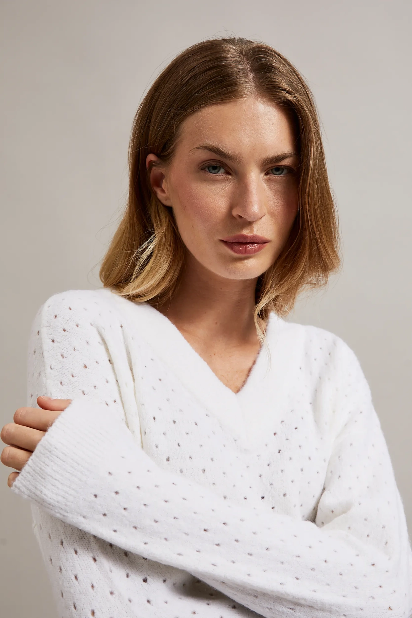 76%AKRYL, 21%POLIAMID, 3%ELASTAN Sweter damski w kolorze kremowym wykonany z miękkiego akrylu, gładki i luźny model z obniżoną linią ramion zapewni Ci wygodę i komfort noszenia. Dzięki swojemu minimalistycznemu designowi bez wzoru świetnie sprawdzi się jako uniwersalny element różnorodnych stylizacji. Długi rękaw oraz dekolt w serek dodają elegancji i sprawią, że poczujesz się wyjątkowo. Ten uroczy sweter w kolorze ecru doskonale sprawdzi się na wiele różnych okazji. Możesz nosić go zarówno na co dzień, do pracy, jak i na spotkanie ze znajomymi. Doskonale będzie pasować zarówno do spodni, jak i do spódnicy, tworząc stylowe i kobiece zestawienia. Dzięki swojej uniwersalności, możesz go nosić przez wiele sezonów, dodając klasyki i elegancji każdej stylizacji.