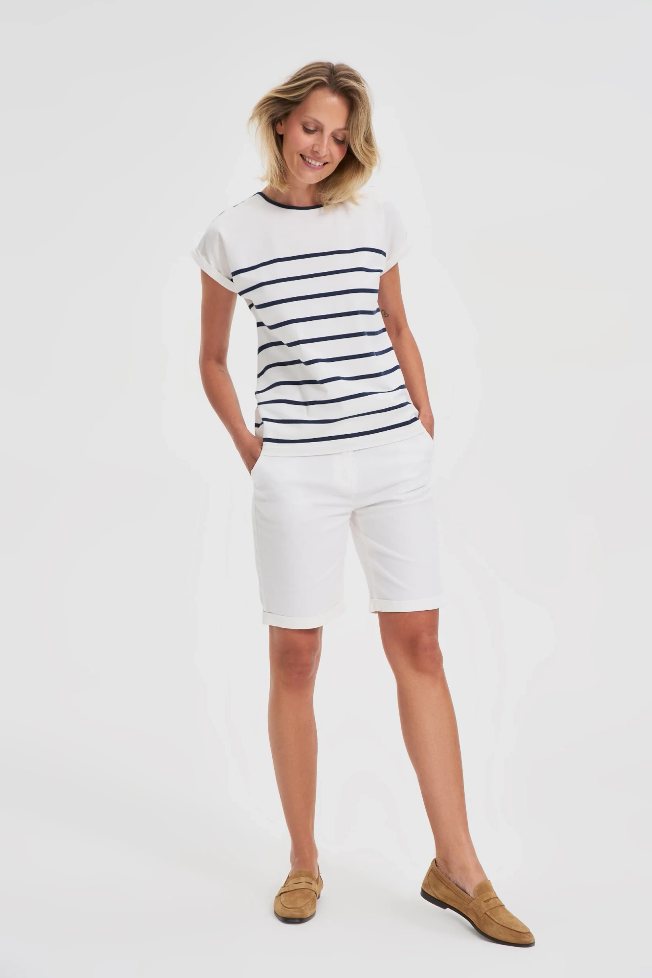 98% BAWEŁNA, 2% ELASTAN Szorty w kolorze białym. Wykonane z przyjemnej w dotyku bawełny, posiadają ozdobny pasek oraz praktyczne kieszenie na zamek. Ich gładka powierzchnia oraz podwinięta nogawka nadają im wyjątkowego uroku. Idealne na letnie, ciepłe dni. Pasują do letnich topów, bawełnianych bluzek oraz sandałów. To niezwykle stylowy element garderoby, który doda lekkości każdej letniej stylizacji.