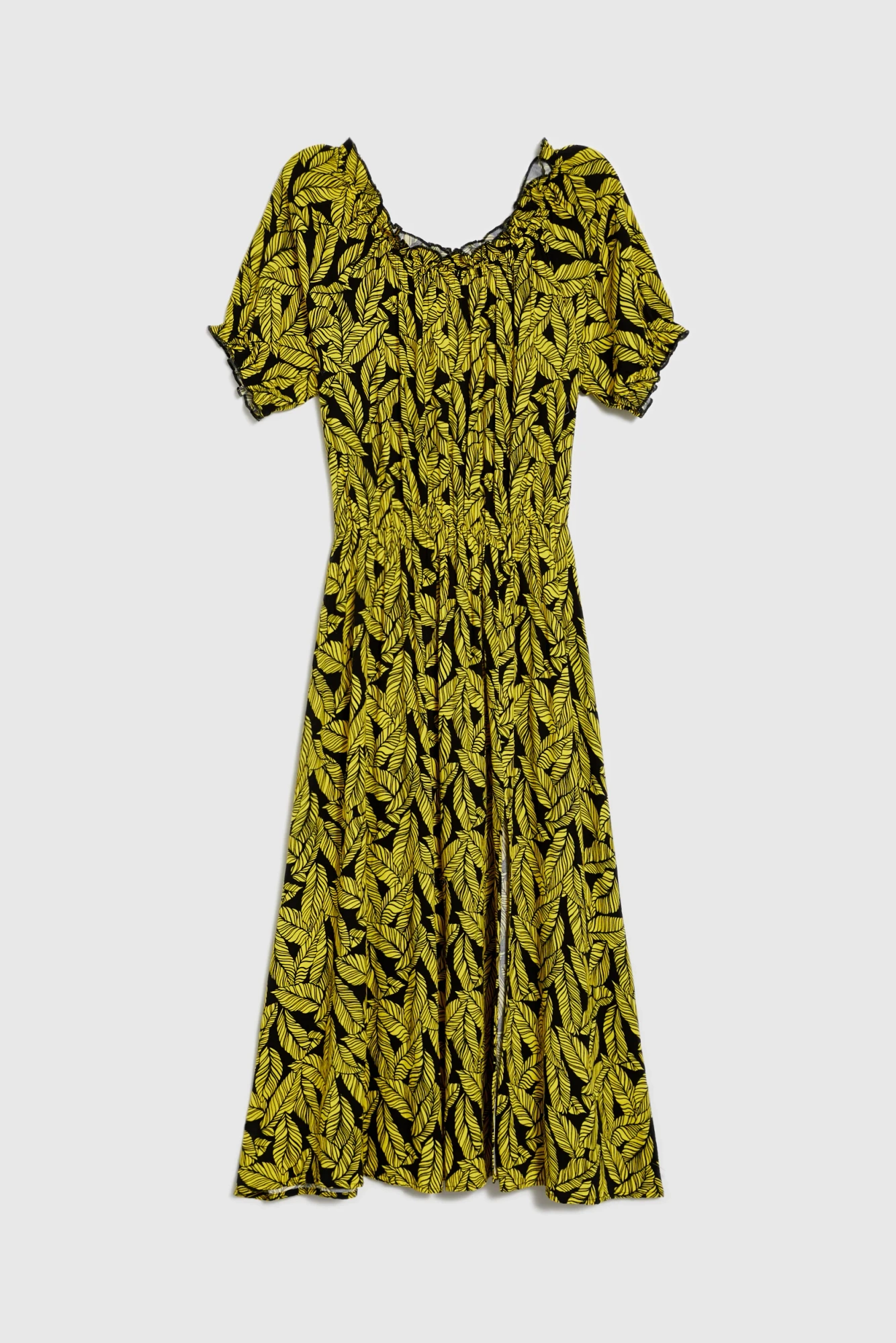 100% WISKOZA Żółta sukienka w liście przyciąga wzrok oryginalnym wzorem i świeżą kolorystyką, podkreślając energię każdej stylizacji. Rozkloszowany, taliowany fason pięknie modeluje sylwetkę, a bufki, marszczenia oraz wykończenie falbaną dodają lekkości i dziewczęcego uroku. Odkryte ramiona nadają całości subtelnej zmysłowości, a długość do połowy łydki zapewnia komfort i swobodę ruchów. Brak zapięcia pozwala na szybkie i wygodne zakładanie. Sukienka wykonana z przewiewnej, miłej w dotyku wiskozy, która doskonale sprawdza się w cieplejsze dni. Idealna propozycja na co dzień, do pracy, na plażę czy specjalną okazję. Doskonale komponuje się z sandałami, balerinami lub espadrylami, a także z lekką jeansową kurtką czy delikatnym kardiganem, tworząc modne stylizacje casualowe i klasyczne. Świetny wybór dla miłośniczek kobiecych, wygodnych i stylowych ubrań.