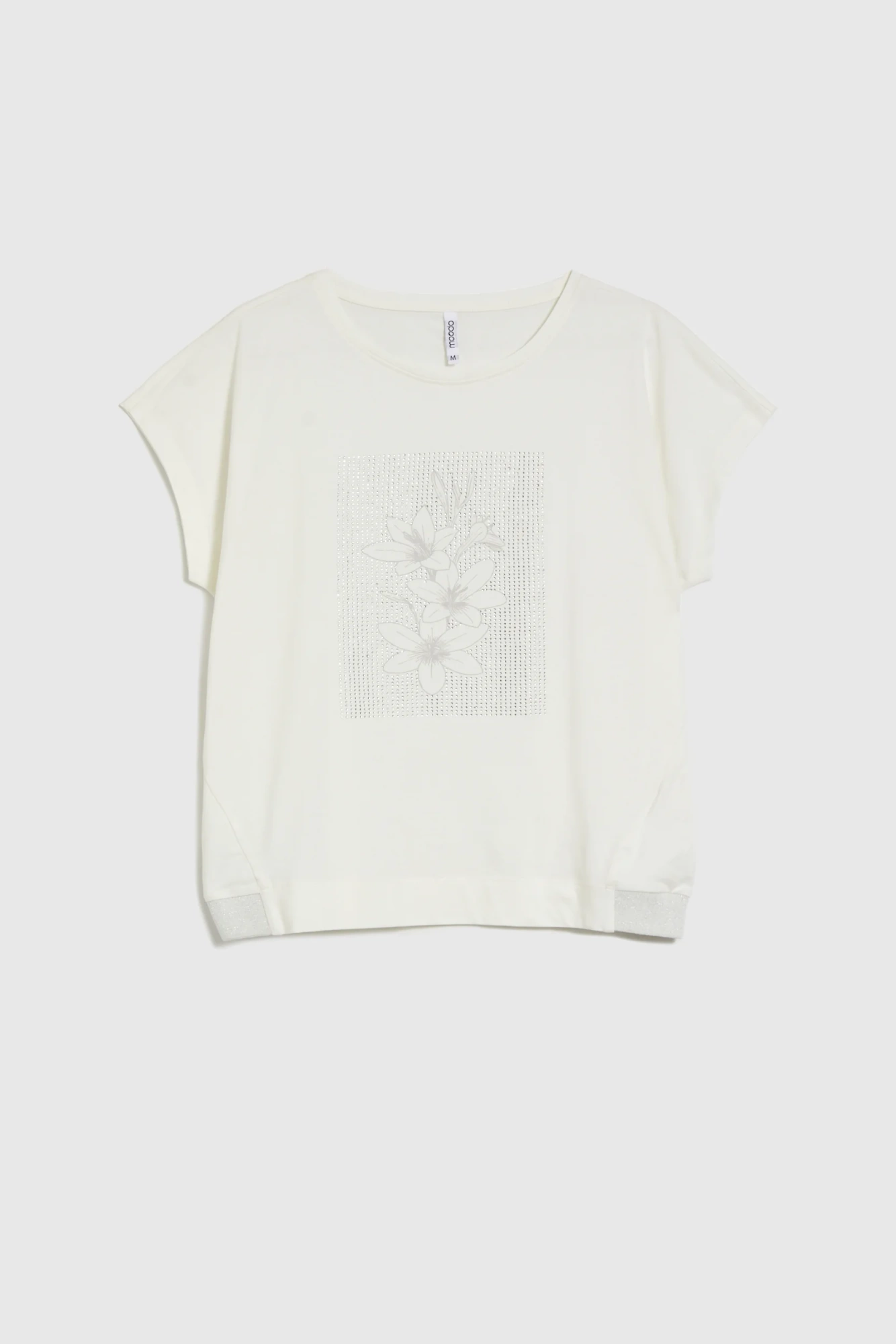 95% BAWEŁNA, 5% ELASTAN Bluzka w kolorze kremowym, bez wzoru, wykonana z gładkiej bawełny. Posiada nadruk, ściągacz i okrągły dekolt. Model z krótkimi rękawami i z opuszczonymi ramionami. Idealna na letnie dni, nadaje się zarówno na co dzień, jak i na spotkania ze znajomymi. Doskonale komponuje się zarówno z jeansami, spódniczką jak i szortami.