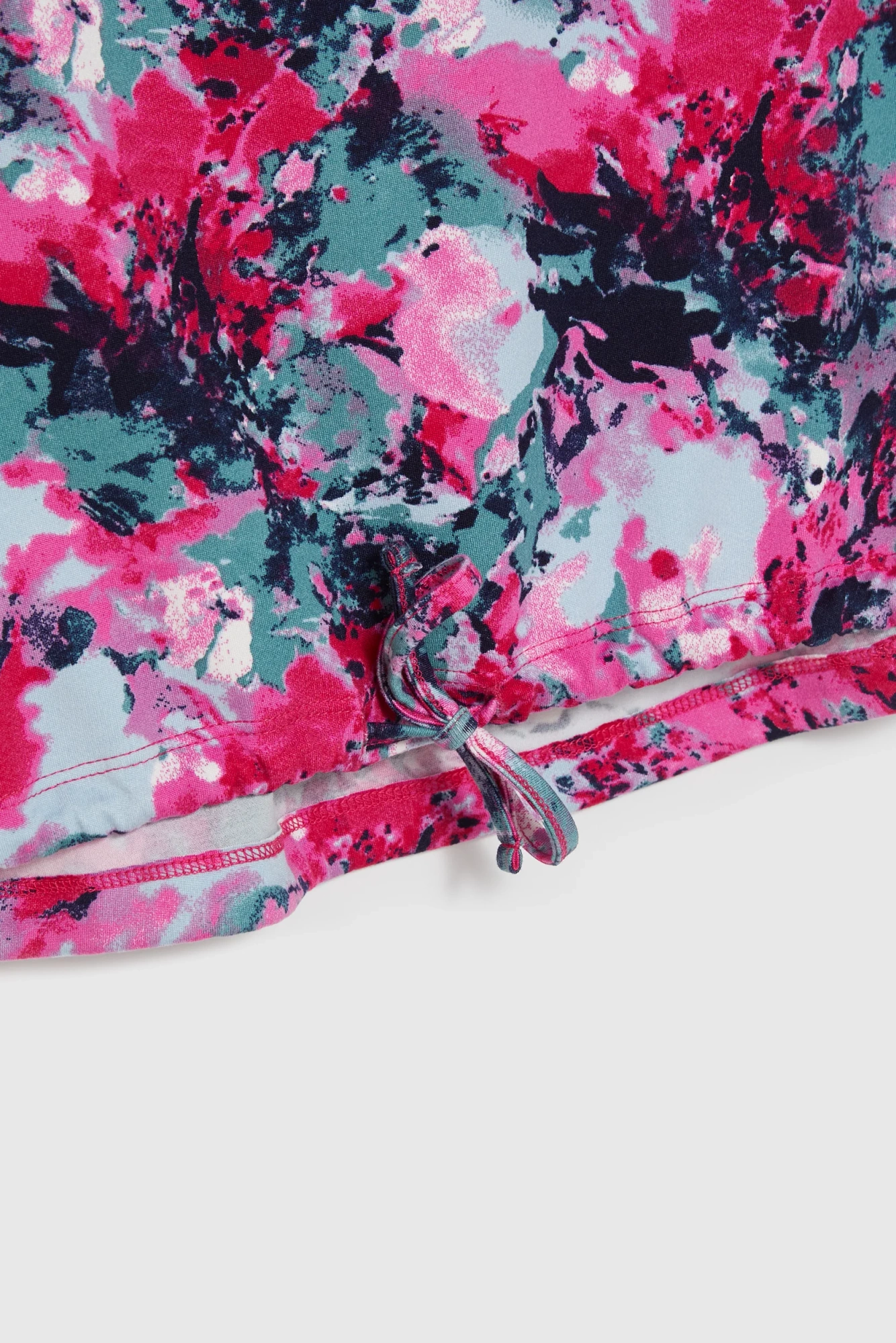 95% POLIESTER, 5% ELASTAN Bluzka w kolorze różowym z roślinnym wzorem przyciąga uwagę niebanalnym designem i wygodnym krojem. Luźny fason zapewnia swobodę ruchów, a dekolt okrągły podkreśla subtelność i lekkość stylizacji. Krótki rękaw idealnie sprawdzi się podczas cieplejszych dni, natomiast wiązanie na dole oraz ściągacz dodają całości nowoczesnego charakteru i pozwalają na indywidualne dopasowanie do sylwetki. Idealny wybór na letnie spotkania, spacery po mieście, wyjścia ze znajomymi czy casualowe przyjęcia w ogrodzie. Doskonale współgra zarówno z klasycznymi jeansami, krótkimi szortami, jak i spódnicami midi.