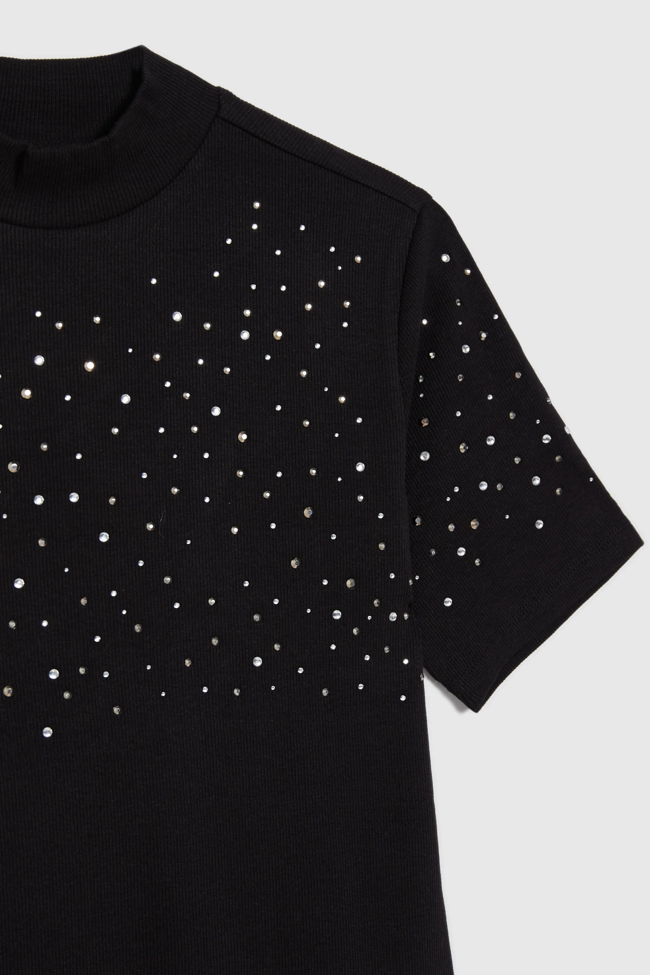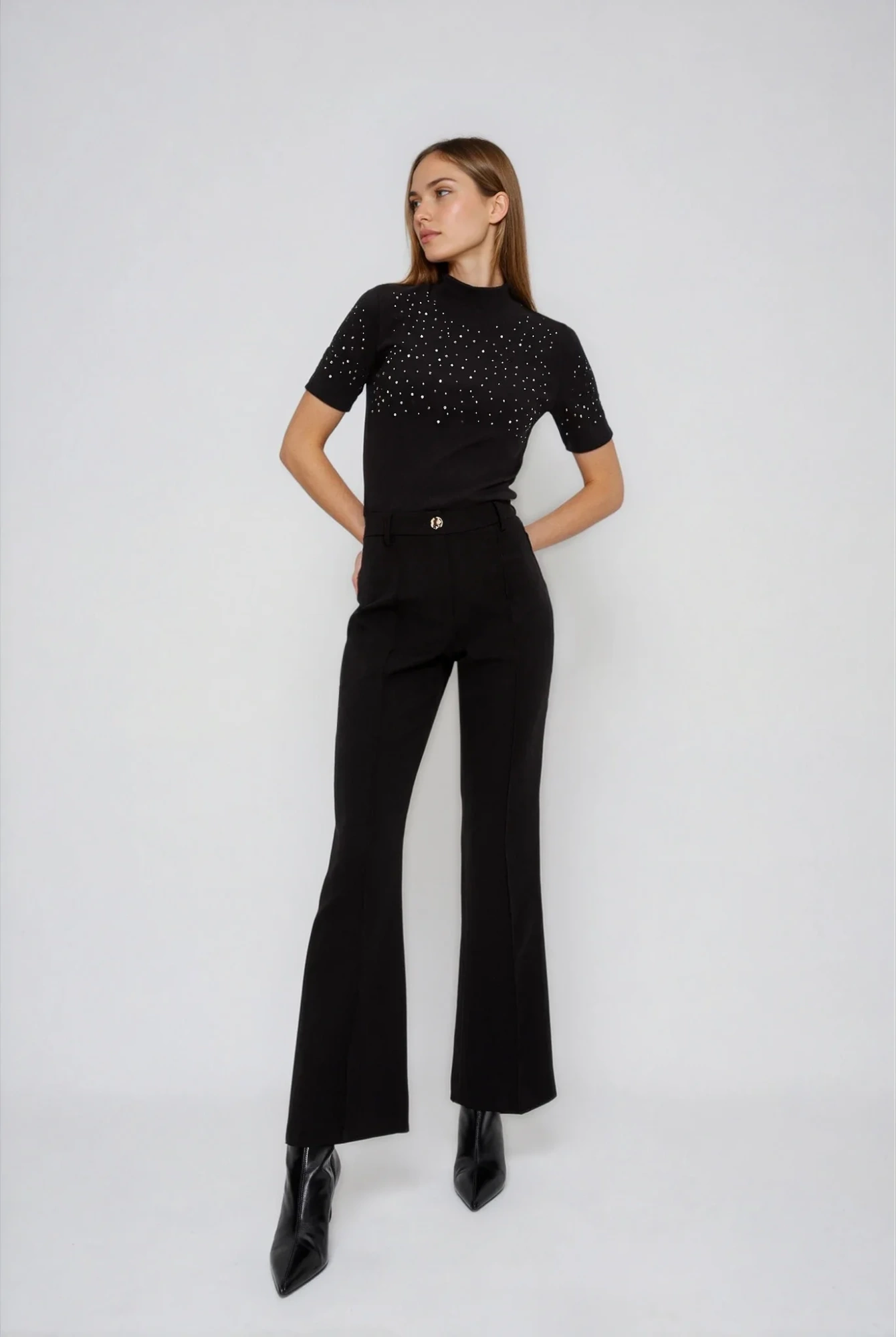 96%BAWEŁNA,4%ELASTAN Bluzka z bawełny o strukturalnym wykończeniu to propozycja dla kobiet, które cenią wygodę i subtelny blask na co dzień. Dopasowany fason miękko układa się na sylwetce, podkreślając kobiece kształty, a elegancki półgolf dodaje całości wyrafinowanego charakteru. Czarny odcień tworzy uniwersalną bazę stylizacji, a delikatne zdobienia z cyrkonii wprowadzają wyjątkowy akcent, który przyciąga spojrzenia, ale nie dominuje całości. Bluzka pasuje zarówno w biurowych stylizacjach, jak i podczas luźniejszych spotkań czy spacerów po mieście. Doskonale komponuje się ze spodniami o klasycznym kroju, elegancką spódnicą, a także ulubionymi jeansami i marynarką. Jej casualowy, a zarazem kobiecy styl pozwala tworzyć stylizacje pełne swobody i lekkości, zachowując przy tym nutę elegancji na każdą okazję.
