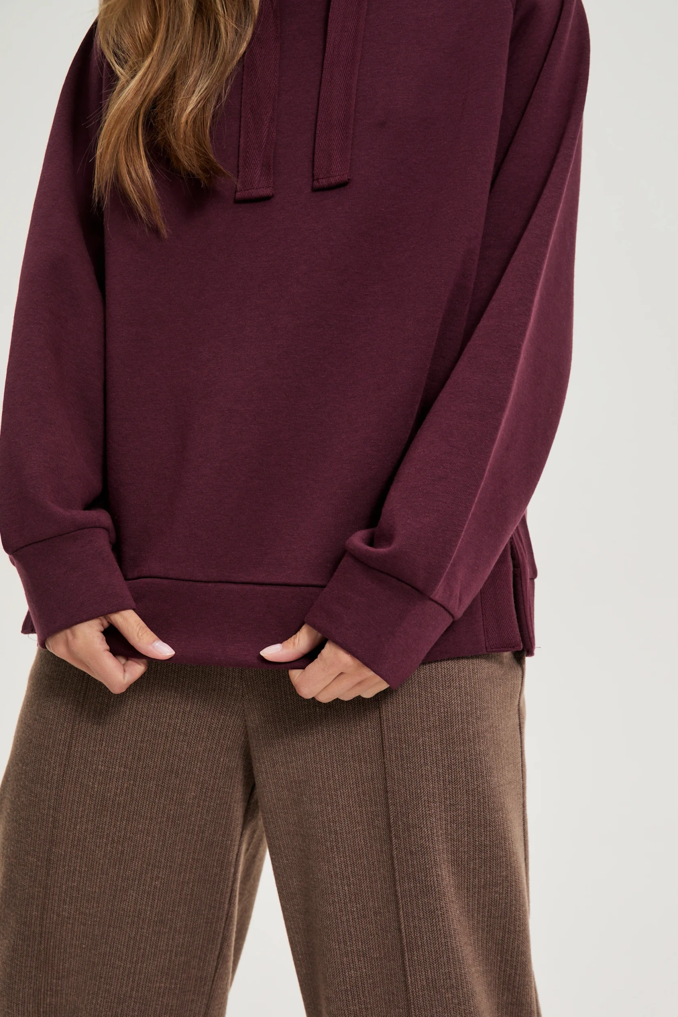 65%BAWEŁNA,35%POLIESTER Bluza damska w odcieniu burgundowym zachwyca gładką, jednolitą powierzchnią bez wzorów, która podkreśla nowoczesny, minimalistyczny styl. Starannie wyselekcjonowana bawełna gwarantuje miękkość oraz przewiewność, zapewniając komfort noszenia przez cały dzień. Praktyczny kaptur z regulowanym wiązaniem chroni przed chłodem, a elastyczne ściągacze na rękawach oraz u dołu zapewniają idealne dopasowanie. Idealna na spacer, spotkanie ze znajomymi czy weekendowy wyjazd. Doskonale komponuje się z jeansami, legginsami lub spódnicą sportową, tworząc wygodny i modny zestaw na każdą nieformalną okazję. Świetnie pasuje do sneakersów, botków lub sportowych trampek, podkreślając miejski, swobodny look.