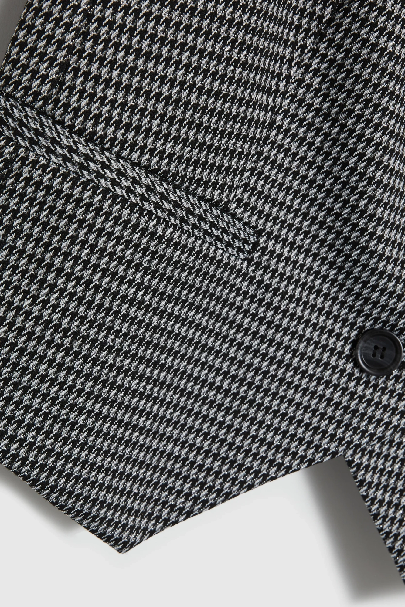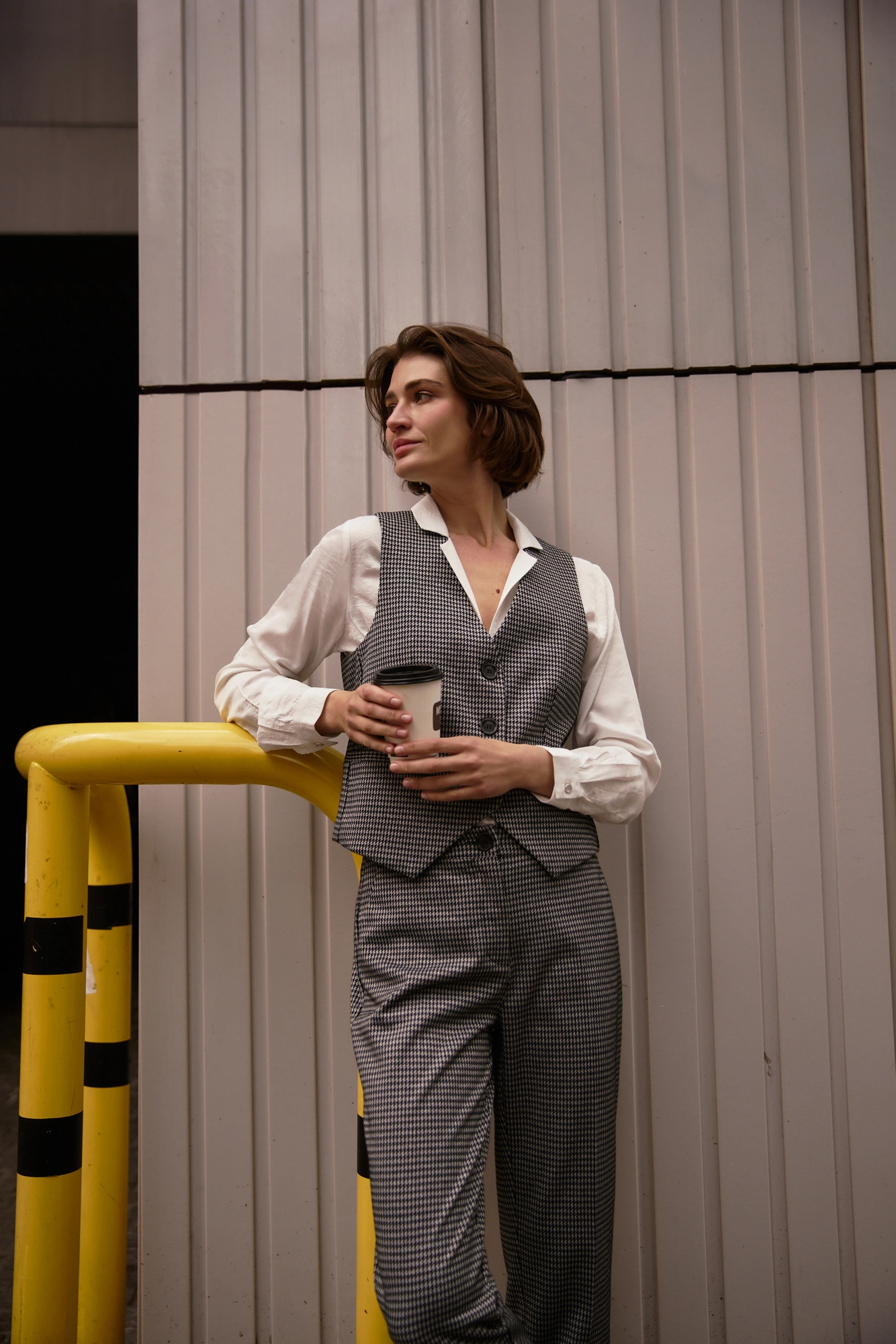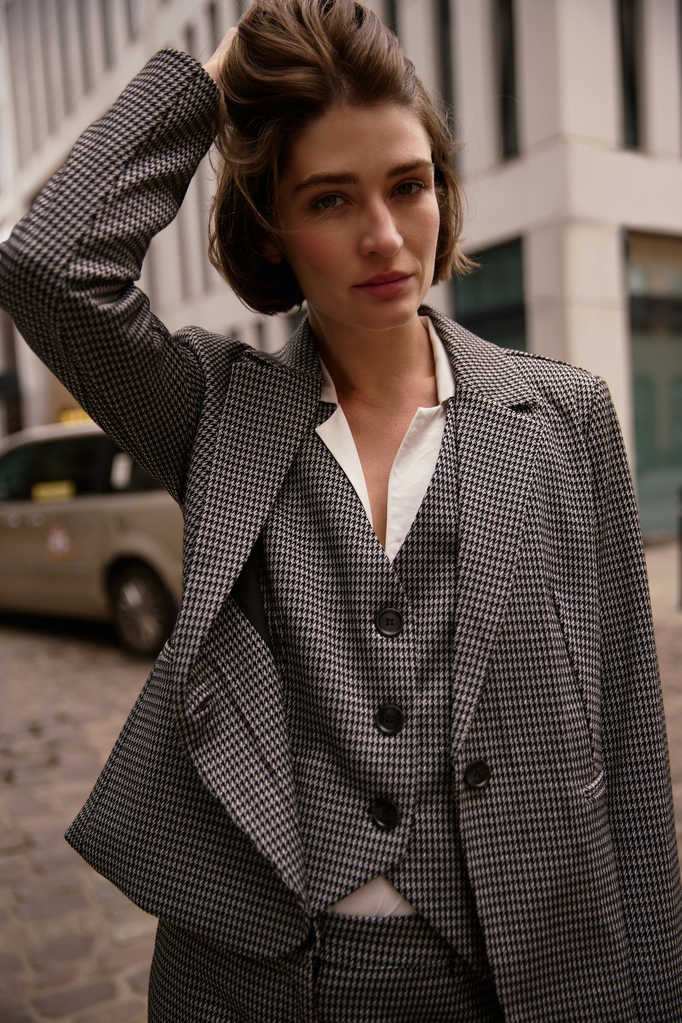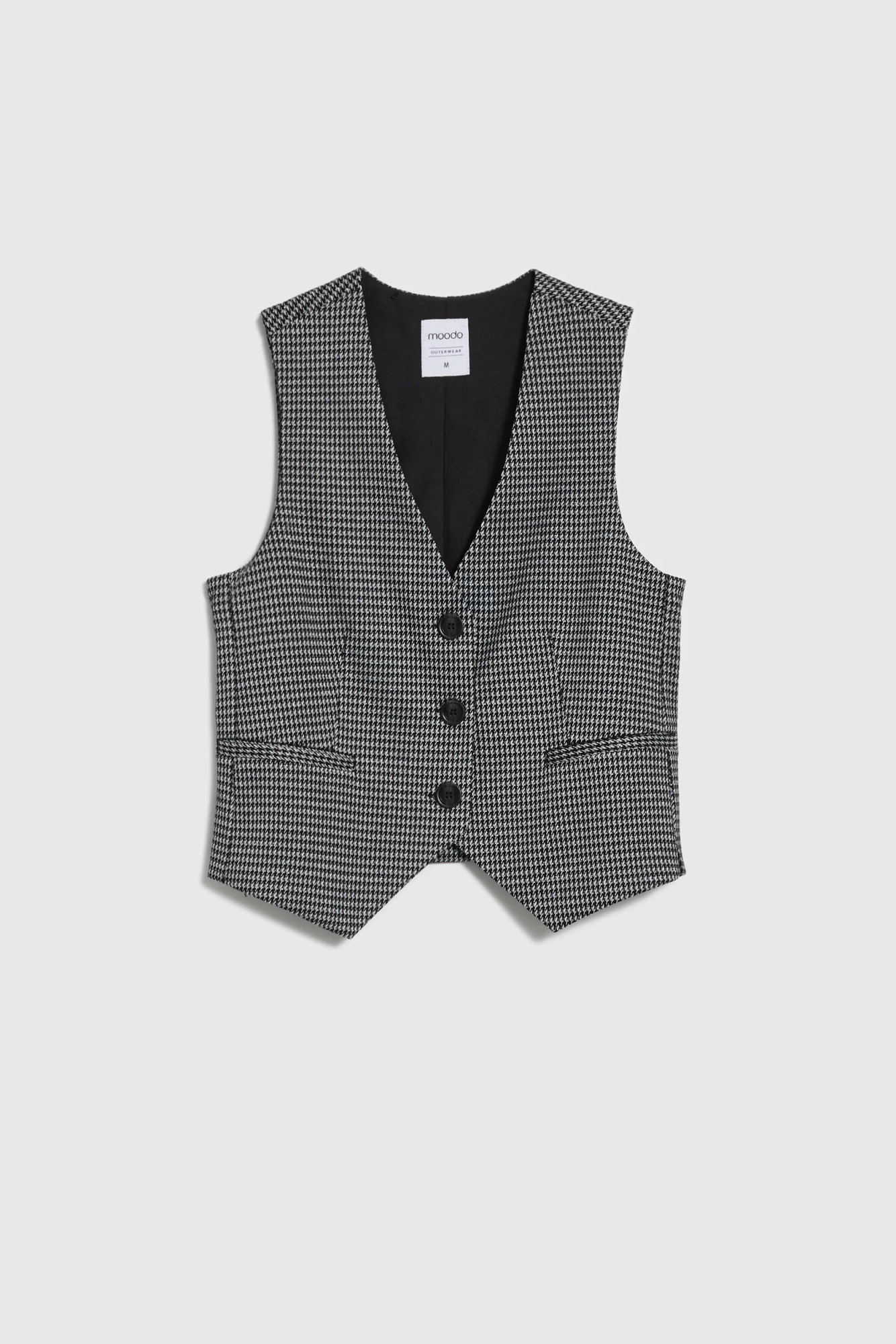 72.8% POLIESTER 15.2% METALIZOWANA NITKA 10% WISKOZA 2% ELASTAN, PODSZEWKA: 100% POLIESTER Kamizelka w odcieniu szarości z ponadczasowym wzorem pepitki przyciąga spojrzenia i podkreśla wyczucie stylu. Klasyczne guziki oraz praktyczne kieszenie dodają funkcjonalności, a starannie dobrany materiał z poliestru wraz z podszewką gwarantuje komfort przez cały dzień. Lekko dopasowany krój subtelnie modeluje sylwetkę, zapewniając elegancki wygląd zarówno podczas codziennych wyzwań, jak i wyjątkowych okazji. Idealnie sprawdzi się na co dzień, do pracy czy podczas spotkań o bardziej eleganckim charakterze. Doskonale komponuje się z klasycznymi spodniami, ołówkową spódnicą, a także jeansami i prostym topem, tworząc modne stylizacje casualowe i biznesowe.
