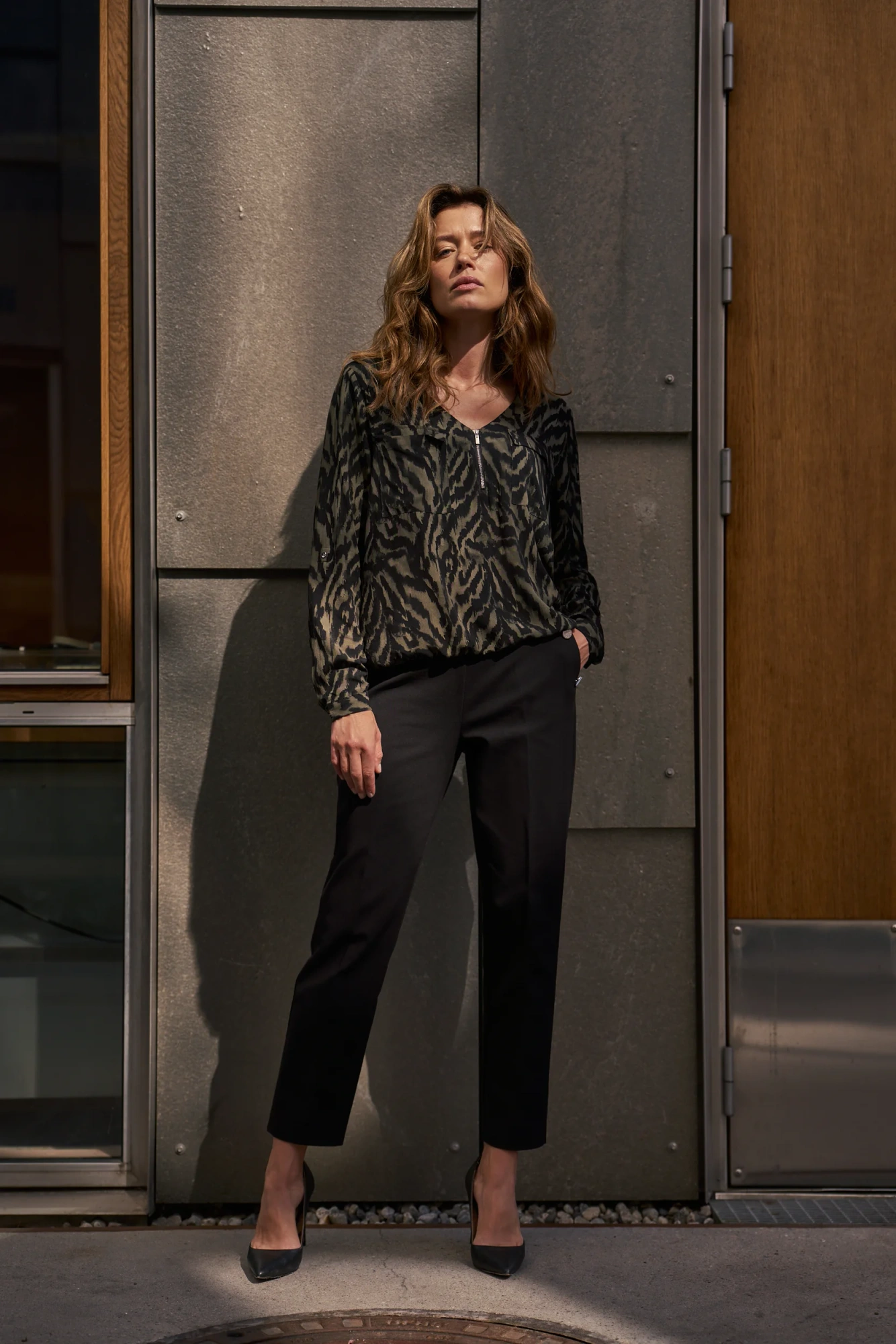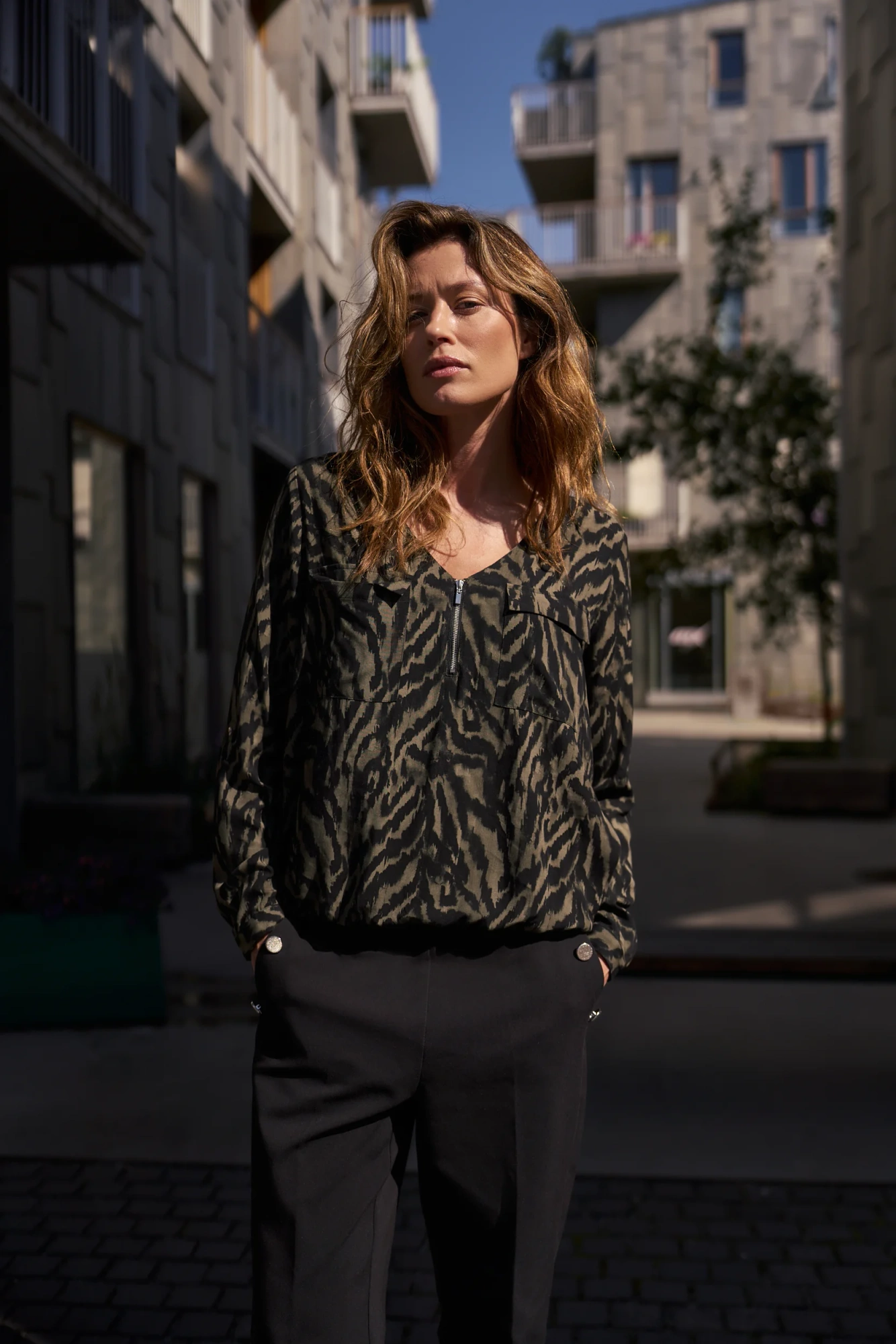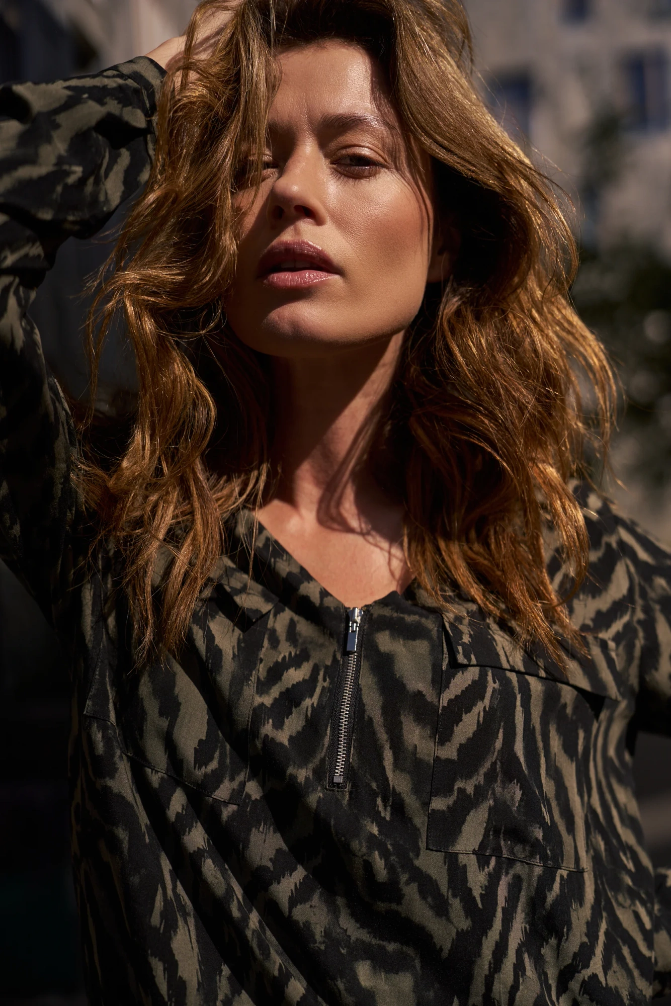 100% WISKOZA Koszula damska w modnym oliwkowym odcieniu to propozycja dla osób ceniących wygodę oraz stylowy wygląd. Lekka wiskoza sprawia, że materiał doskonale układa się na sylwetce i zapewnia przewiewność przez cały dzień.  Posiada długi rękaw i dekolt w serek, ozdobiony zamkiem. Idealna na spotkania biznesowe, do pracy, a także na wieczorne wyjścia. Świetnie komponuje się zarówno z eleganckimi spodniami, klasyczną spódnicą, jak i casualowymi jeansami. Doskonały wybór do stylizacji z marynarką lub kardiganem.