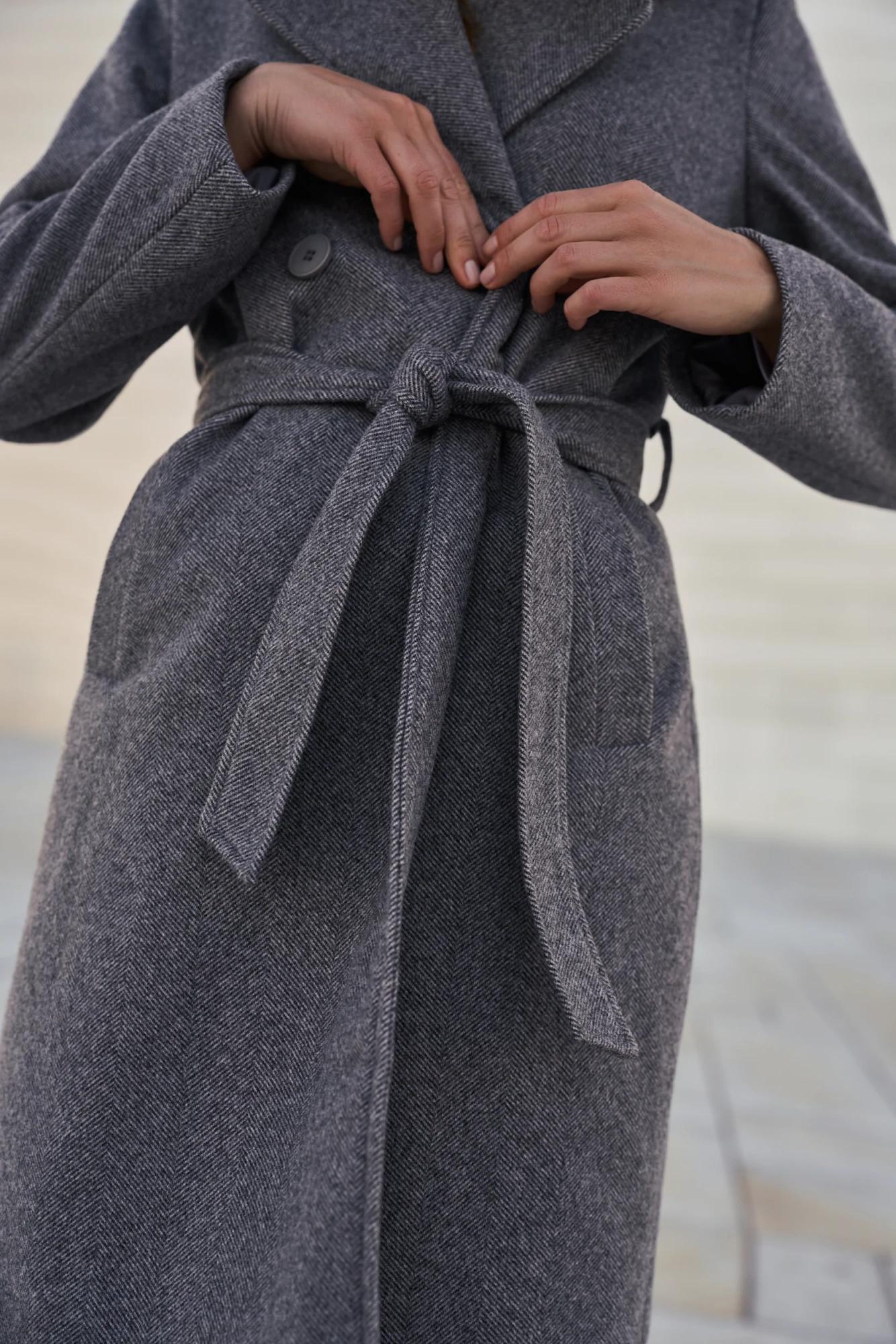100%POLIESTER, PODSZEWKA:: 100% POLIESTER Szary płaszcz dwurzędowy w jodełkę to propozycja dla miłośniczek ponadczasowej elegancji. Modny krój do połowy łydki w połączeniu z klasycznym kołnierzykiem i paskiem pięknie podkreśla sylwetkę, a praktyczne kieszenie oraz długi rękaw gwarantują komfort noszenia. Zapięcie na guziki dodaje całości stylowego charakteru, podszewka zapewnia wygodę nawet w chłodniejsze dni. Lekka, a zarazem trwała tkanina na bazie poliestru sprawia, że płaszcz zachowuje swój kształt i prezentuje się nienagannie przez długi czas. Idealny wybór na formalne spotkania, biznesowe wyjścia czy rodzinne uroczystości. Fenomenalnie komponuje się zarówno z klasycznymi spodniami materiałowymi, sukienką midi, jak i eleganckimi botkami. Sprawdzi się również w codziennych stylizacjach miejskich, tworząc zgrany duet z jeansami i swetrem.
