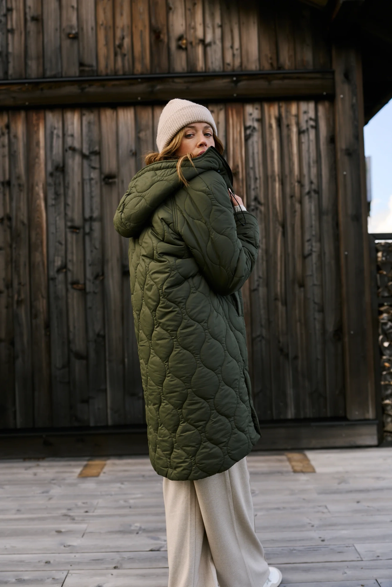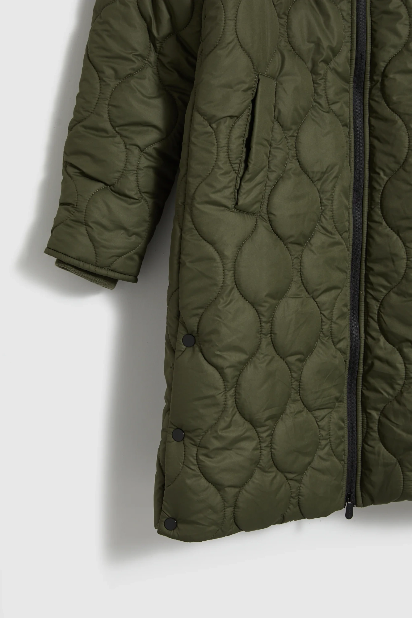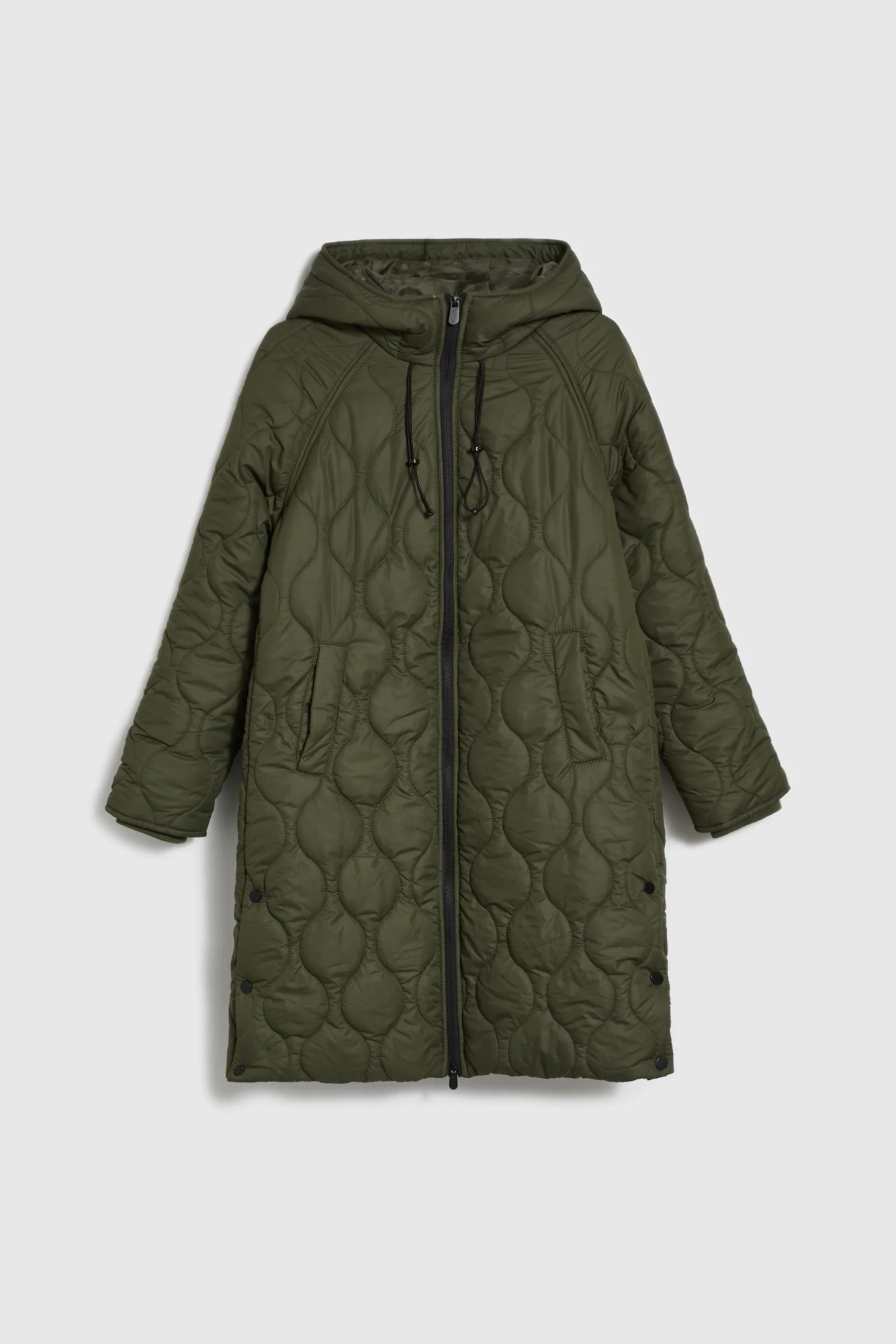 100%POLIESTER, PODSZEWKA:: 100% POLIESTER Pikowana zielona kurtka damska z kapturem zachwyca nowoczesnym krojem oraz wygodą użytkowania. Gładka tkanina podkreśla uniwersalny charakter, a klasyczne stębnowania dodają elegancji codziennym stylizacjom. Naszywane kieszenie zapewniają praktyczne miejsce na drobiazgi, a długość przed kolana skutecznie chroni przed chłodem. Model ocieplany, wyposażony w podszewkę, gwarantuje komfort nawet w najzimniejsze dni. Kurtka posiada wygodny zamek ułatwiający szybkie zakładanie oraz długi rękaw. Wykonana z trwałego poliestru, odpornego na codzienne użytkowanie. Idealna na jesienne i zimowe spacery, wypad na miasto, do pracy czy na weekendowe wyjazdy. Doskonale komponuje się z jeansami, legginsami, sportowymi butami oraz botkami. Świetnie pasuje do casualowych swetrów i bluz, dopełniając miejskie stylizacje.