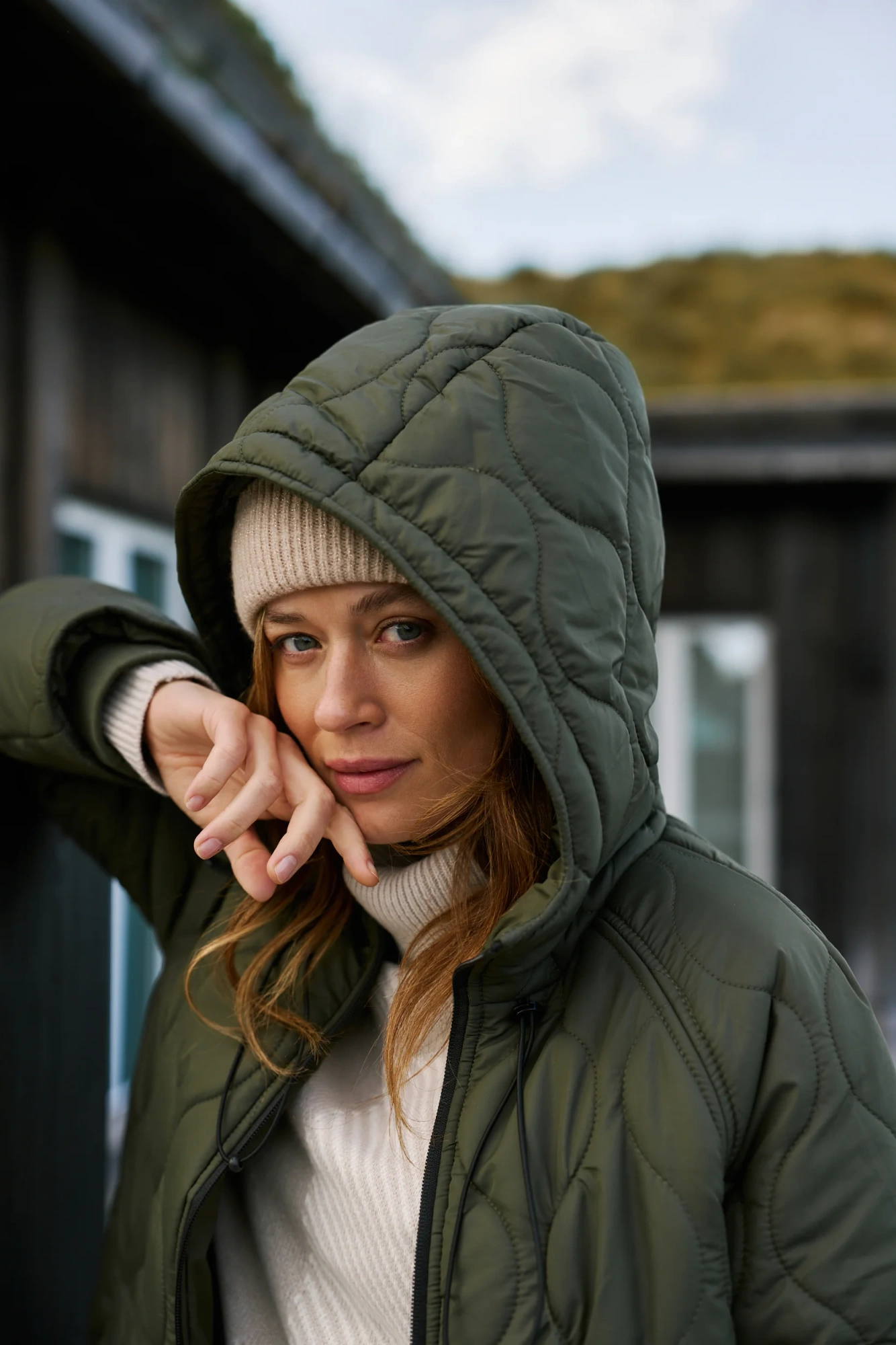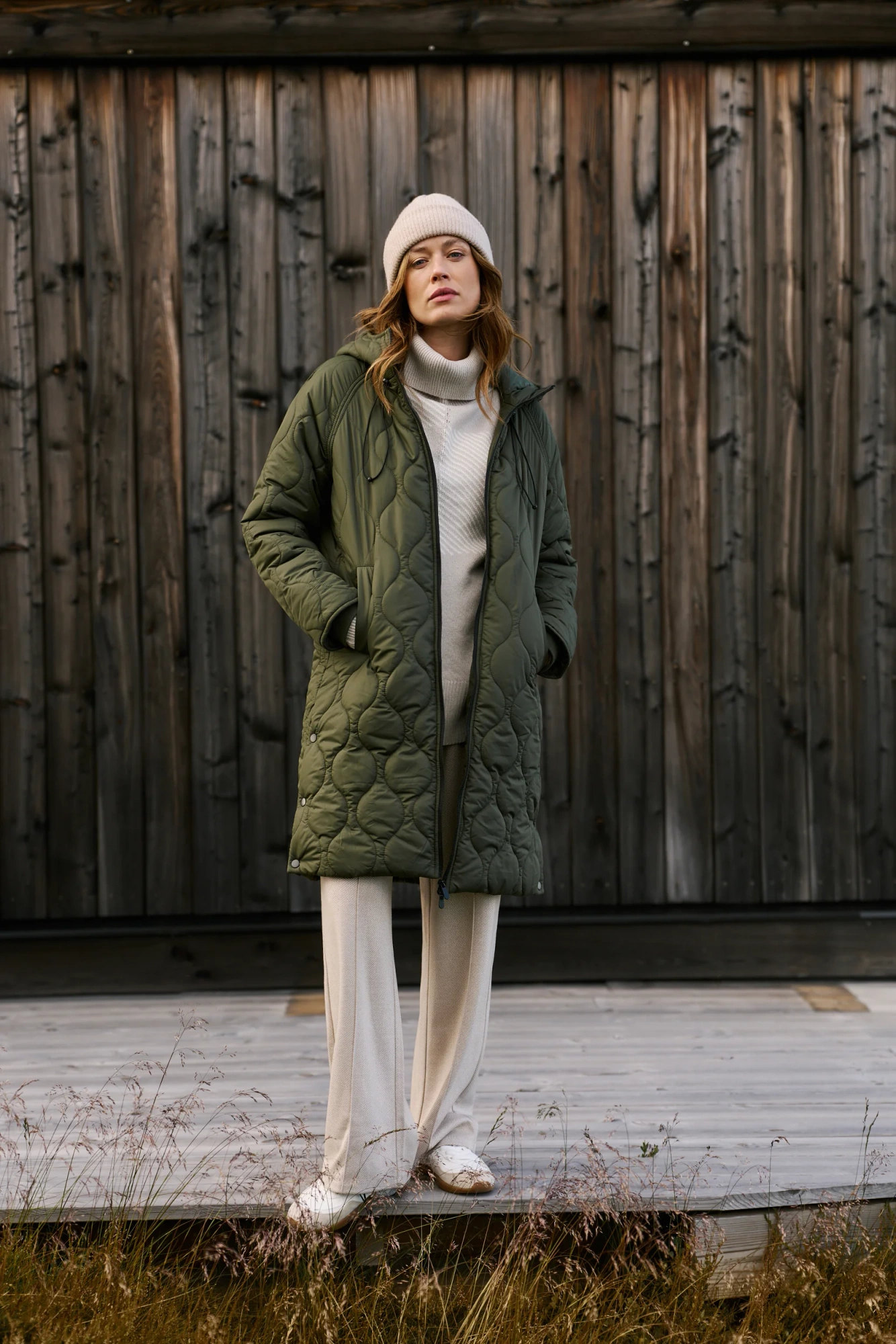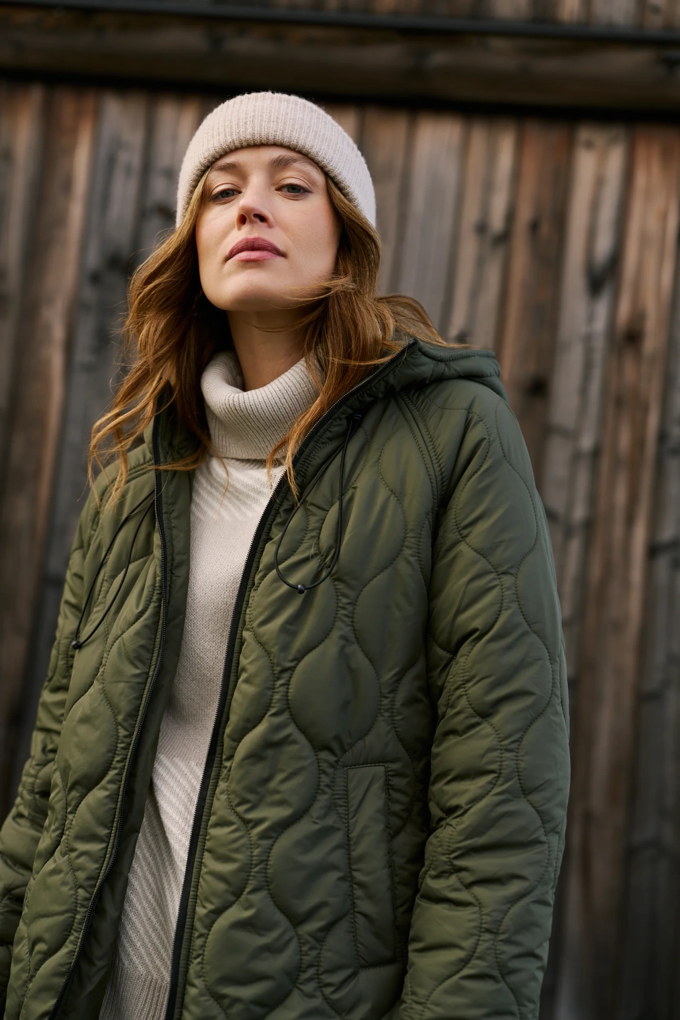100%POLIESTER, PODSZEWKA:: 100% POLIESTER Pikowana zielona kurtka damska z kapturem zachwyca nowoczesnym krojem oraz wygodą użytkowania. Gładka tkanina podkreśla uniwersalny charakter, a klasyczne stębnowania dodają elegancji codziennym stylizacjom. Naszywane kieszenie zapewniają praktyczne miejsce na drobiazgi, a długość przed kolana skutecznie chroni przed chłodem. Model ocieplany, wyposażony w podszewkę, gwarantuje komfort nawet w najzimniejsze dni. Kurtka posiada wygodny zamek ułatwiający szybkie zakładanie oraz długi rękaw. Wykonana z trwałego poliestru, odpornego na codzienne użytkowanie. Idealna na jesienne i zimowe spacery, wypad na miasto, do pracy czy na weekendowe wyjazdy. Doskonale komponuje się z jeansami, legginsami, sportowymi butami oraz botkami. Świetnie pasuje do casualowych swetrów i bluz, dopełniając miejskie stylizacje.