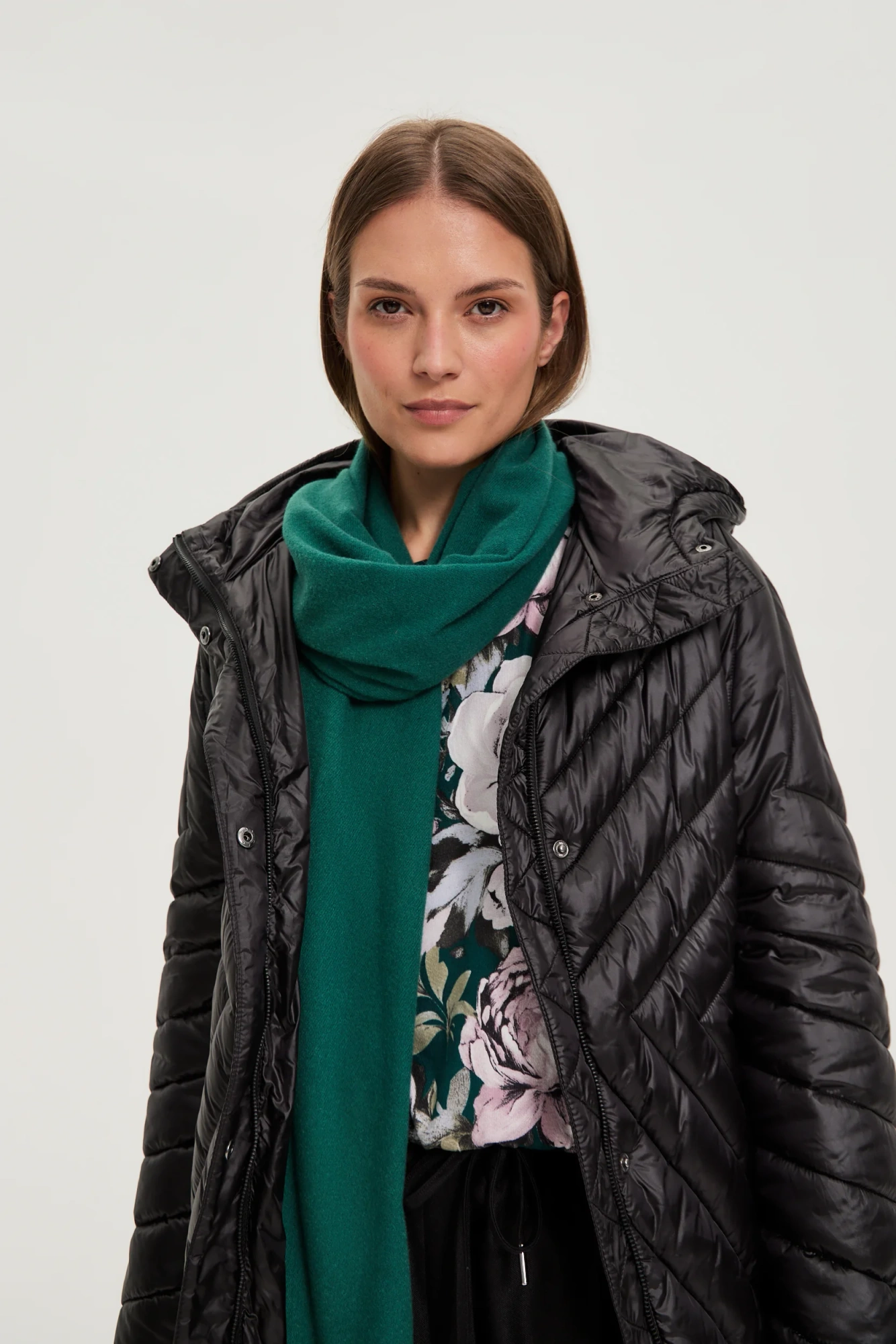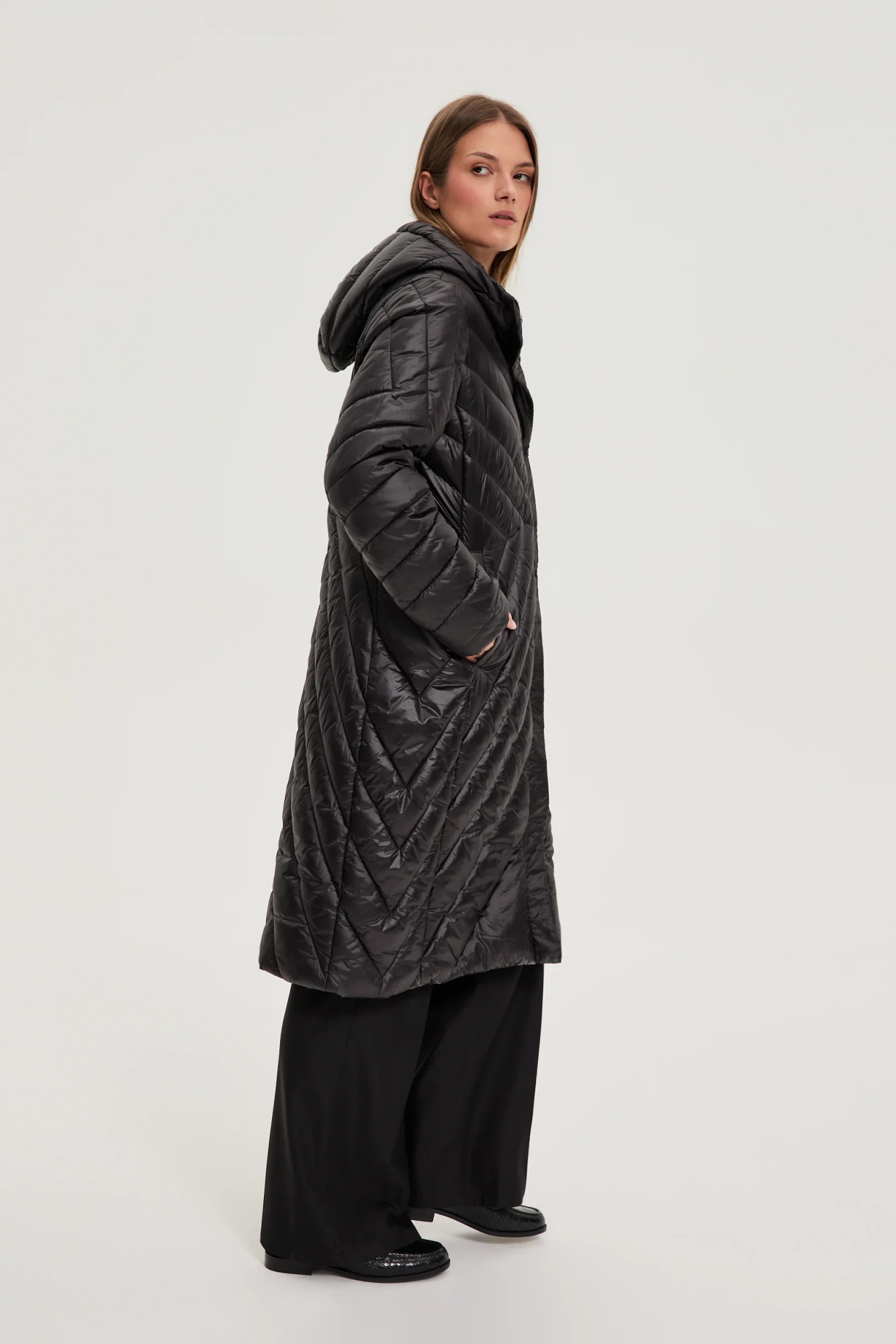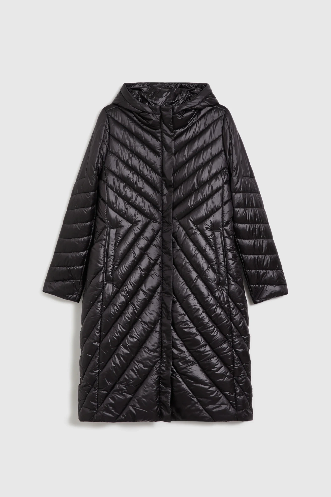 100%POLIAMID, PODSZEWKA: 100% POLIESTER Czarna, pikowana kurtka zimowa do kolan zachwyca klasycznym, gładkim wykończeniem oraz funkcjonalnym designem. Charakterystyczne stębnowania oraz modne pikowanie nadają całości stylowego wyglądu. Długi rękaw, praktyczny kaptur oraz zamek błyskawiczny chronią przed wiatrem i śniegiem, a wygodne kieszenie pozwalają bezpiecznie przechować drobiazgi. Pasek z wiązaniem pięknie podkreśla talię, zapewniając kobiecą sylwetkę każdego dnia. Model idealny na zimowe spacery, miejskie wyjścia czy codzienną drogę do pracy. Doskonale komponuje się z klasycznymi jeansami, ciepłym swetrem, wysokimi kozakami czy botkami na obcasie. Kurtka zimowa z kapturem sprawdzi się również w połączeniu z dzianinową sukienką i grubymi rajstopami, tworząc komfortową i elegancką stylizację na chłodne dni.