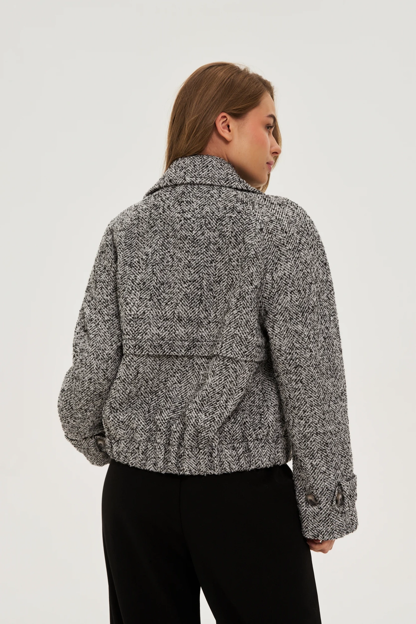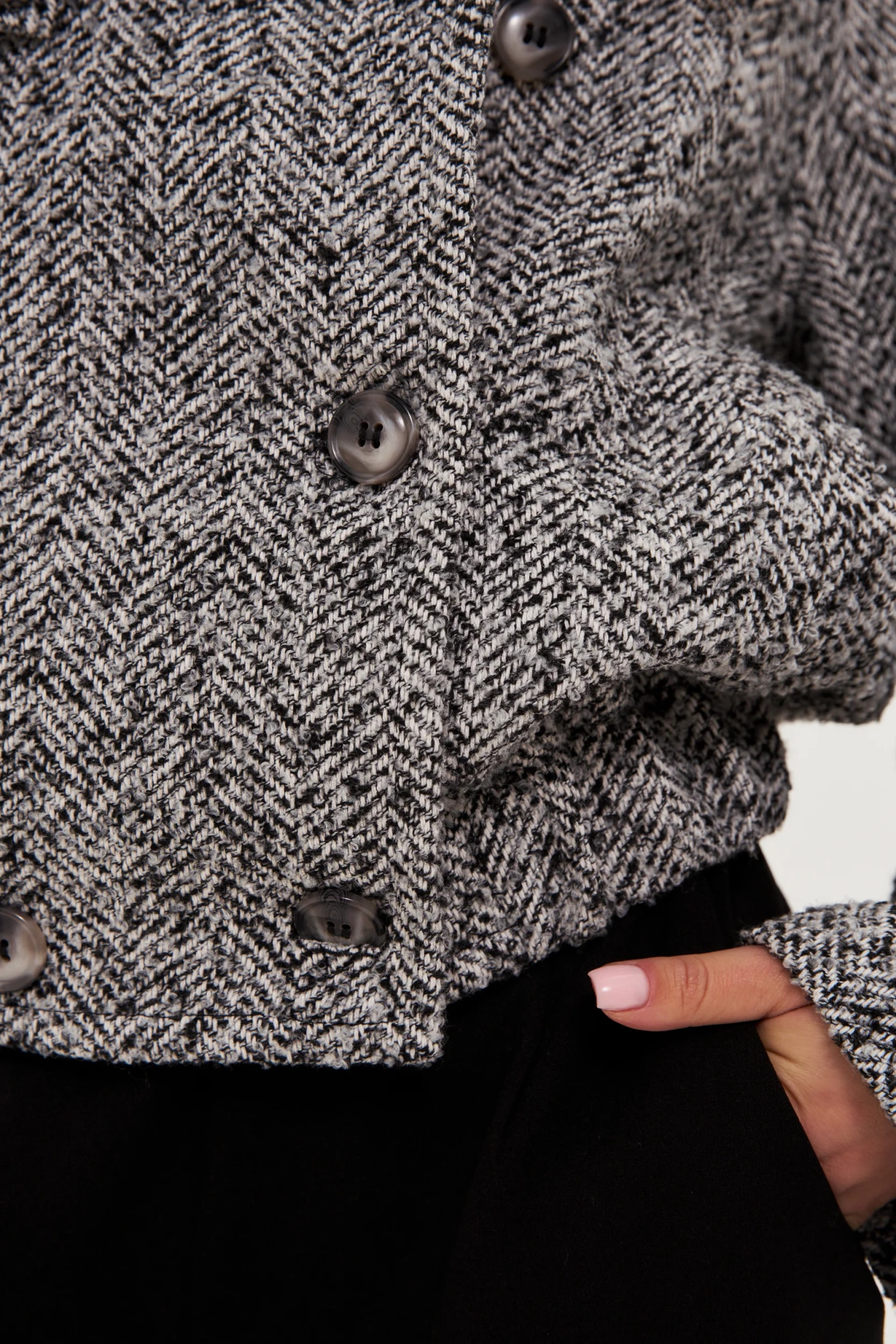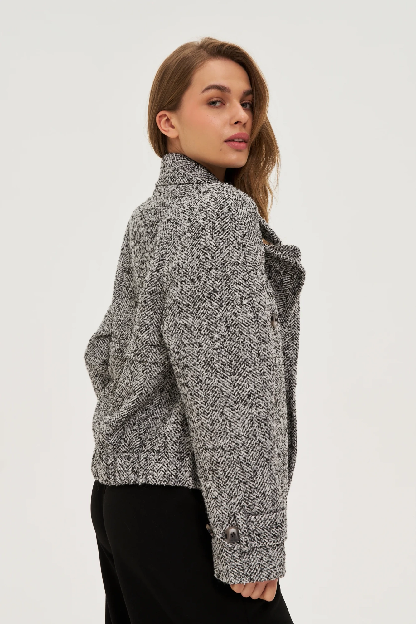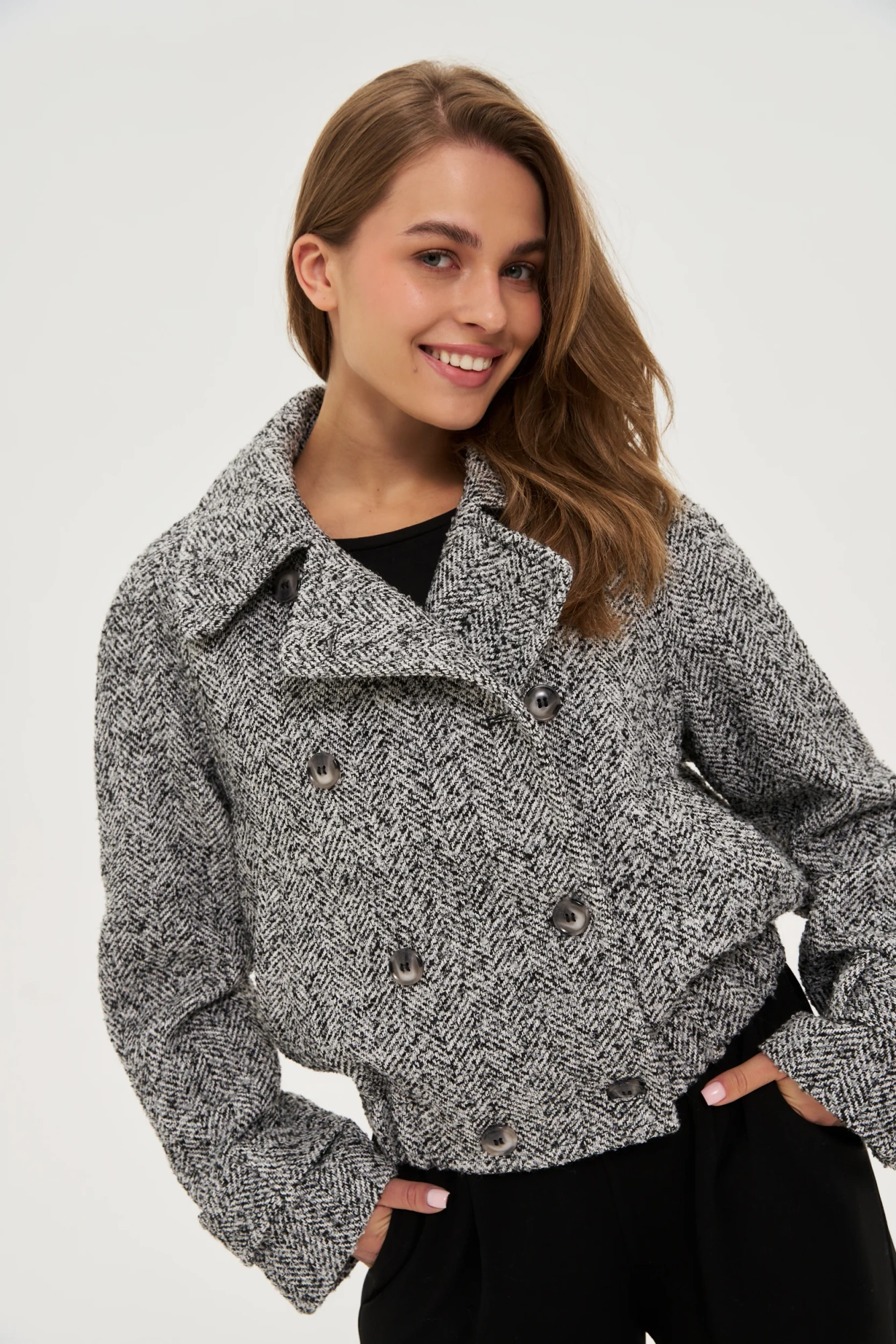 100% POLIESTER, PODSZEWKA:: 100% POLIESTER Dwurzędowa kurtka damska zachwyca modnym wzorem jodełki, łącząc odcienie szarości, bieli i czerni. Luźny krój zapewnia wygodę i swobodę ruchów, a długość do pasa podkreśla atuty sylwetki. Wyposażona w elegancki kołnierzyk i praktyczne kieszenie, idealnie sprawdzi się w codziennych stylizacjach. Guziki dodają całości wyrafinowanego charakteru, a długie rękawy gwarantują komfort nawet w chłodniejsze dni. Kurtka została uszyta z miękkiej tkaniny płaszczowej z dodatkiem poliestru, posiada podszewkę zwiększającą trwałość i wygodę noszenia. Brak kaptura podkreśla minimalistyczny design. Idealna na spotkania biznesowe, spacery po mieście i wieczorne wyjścia. Świetnie komponuje się zarówno z klasycznymi jeansami, spodniami materiałowymi, jak i ołówkową spódnicą czy sukienką. Doskonały wybór do casualowych oraz bardziej eleganckich zestawień, w których liczy się styl i wygoda.