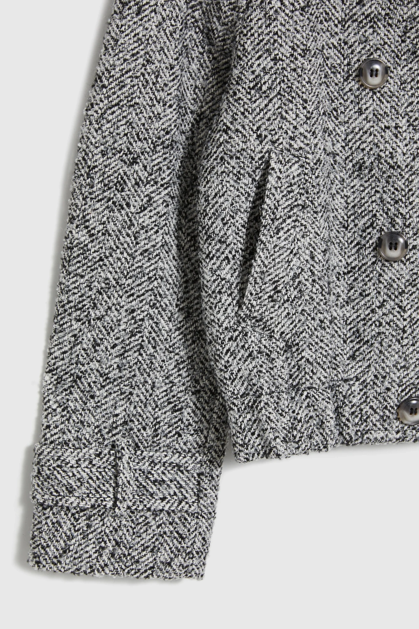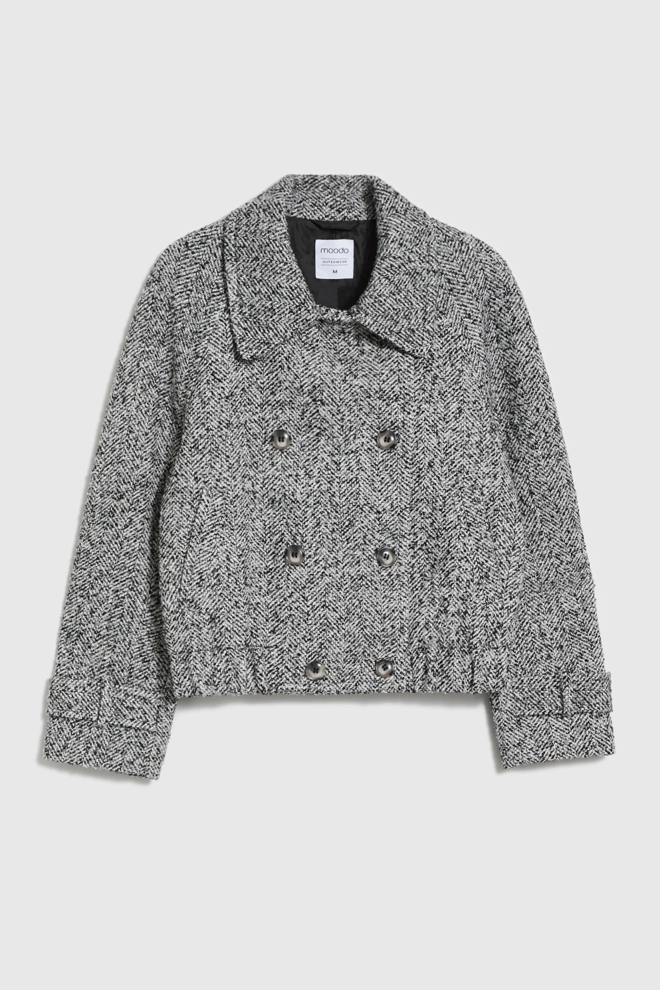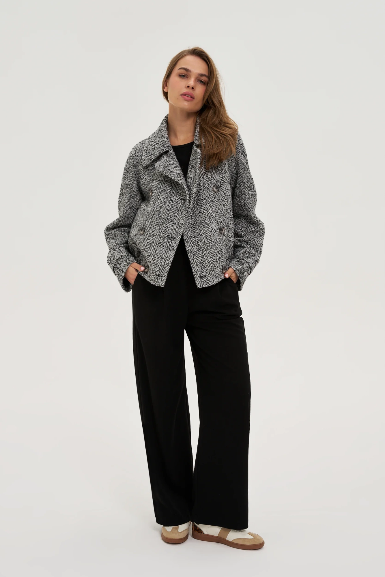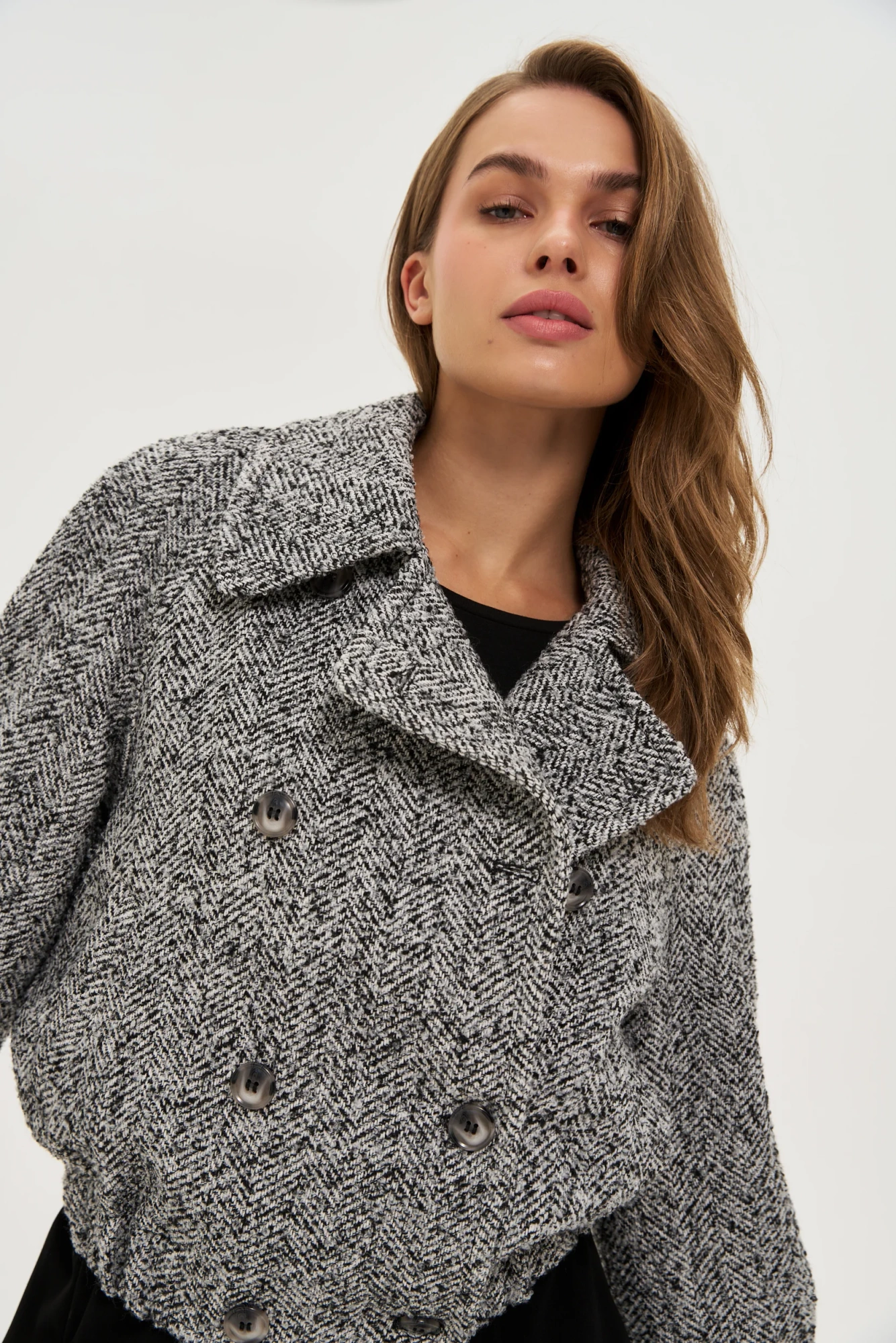 100% POLIESTER, PODSZEWKA:: 100% POLIESTER Dwurzędowa kurtka damska zachwyca modnym wzorem jodełki, łącząc odcienie szarości, bieli i czerni. Luźny krój zapewnia wygodę i swobodę ruchów, a długość do pasa podkreśla atuty sylwetki. Wyposażona w elegancki kołnierzyk i praktyczne kieszenie, idealnie sprawdzi się w codziennych stylizacjach. Guziki dodają całości wyrafinowanego charakteru, a długie rękawy gwarantują komfort nawet w chłodniejsze dni. Kurtka została uszyta z miękkiej tkaniny płaszczowej z dodatkiem poliestru, posiada podszewkę zwiększającą trwałość i wygodę noszenia. Brak kaptura podkreśla minimalistyczny design. Idealna na spotkania biznesowe, spacery po mieście i wieczorne wyjścia. Świetnie komponuje się zarówno z klasycznymi jeansami, spodniami materiałowymi, jak i ołówkową spódnicą czy sukienką. Doskonały wybór do casualowych oraz bardziej eleganckich zestawień, w których liczy się styl i wygoda.
