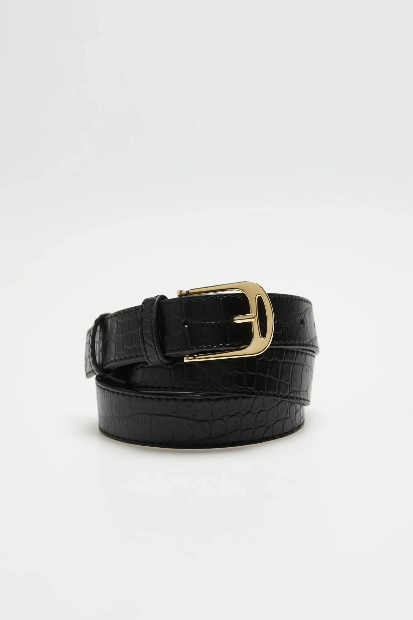 100% POLIURETAN Czarny pasek damski z motywem zwierzęcym i ozdobną, złotą klamrą to doskonały sposób, by dodać stylizacji niepowtarzalnego charakteru. Modny wzór na powierzchni oraz eleganckie akcenty w postaci połyskującej klamry przyciągają wzrok i podkreślają indywidualny styl. Materiał wykonania – ekologiczna skóra z domieszką poliuretanu – zapewnia trwałość oraz wygodę noszenia, a precyzyjne wykończenie gwarantuje efektowny wygląd na długo.