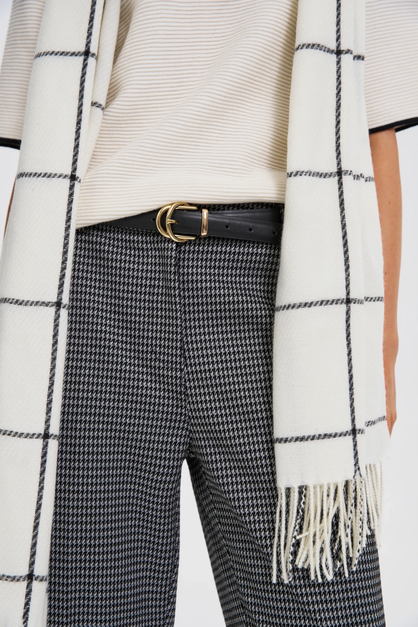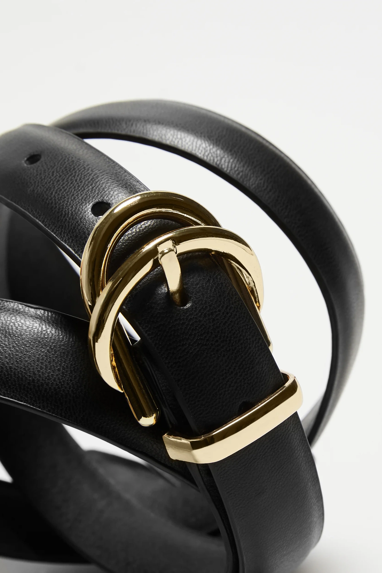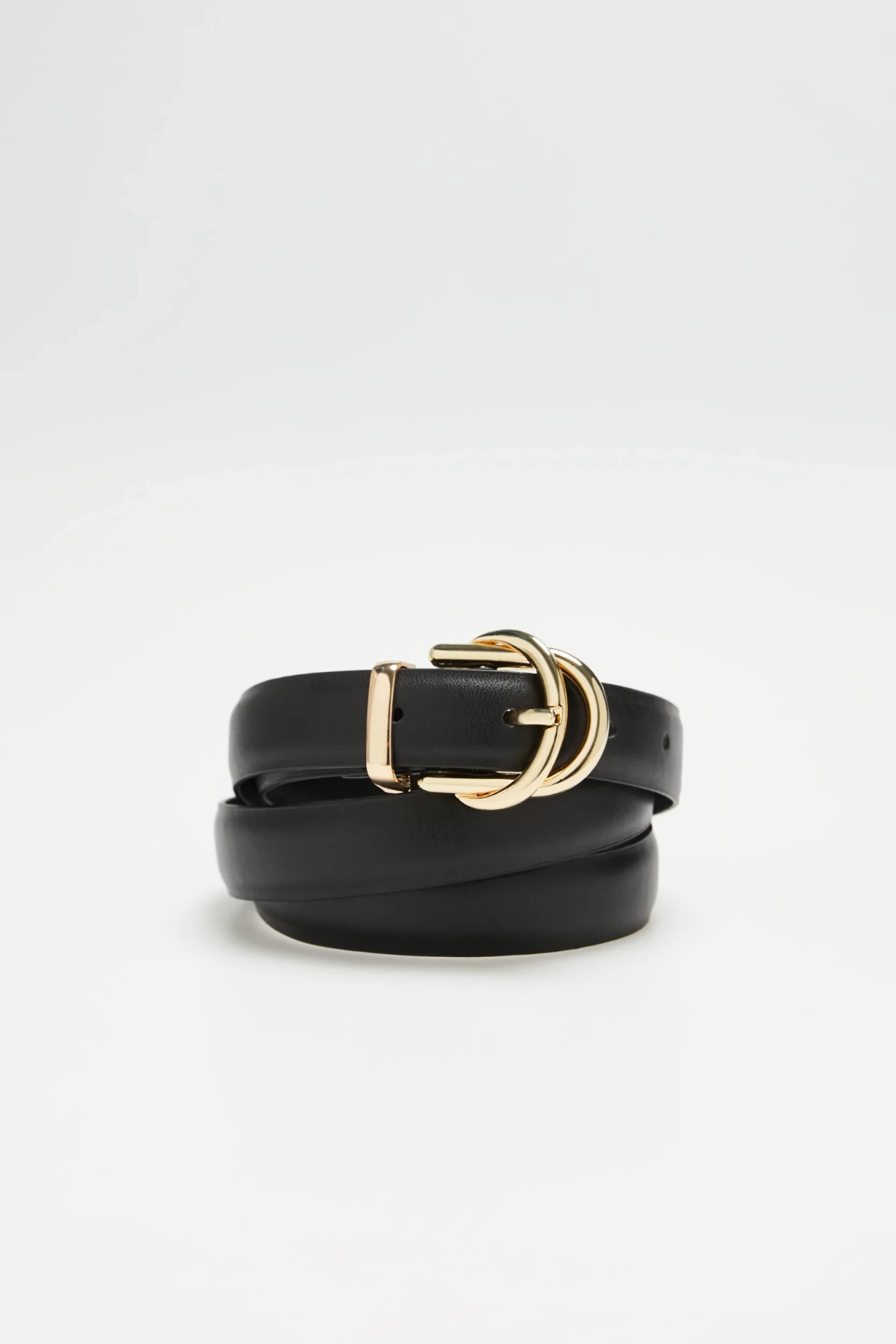 100% POLIURETAN Czarny pasek damski wykonany z trwałej skóry ekologicznej zachwyca ponadczasową elegancją. Gładka powierzchnia bez wzoru doskonale komponuje się z ozdobną złotą klamrą i efektowną szlufką, dodając każdej stylizacji nutę luksusu. Wygodny w użytkowaniu, elastyczny i łatwy w pielęgnacji, stanowi praktyczne i stylowe akcesorium do codziennego noszenia. Idealny wybór na spotkania biznesowe, wieczorne wyjścia lub eleganckie uroczystości. Świetnie pasuje zarówno do klasycznych spodni materiałowych, ołówkowej spódnicy, jak i sukienki midi, tworząc spójny i modny look. Ten czarny pasek z ozdobną złotą klamrą podkreśli styl każdej kobiety oraz dopełni garderobę, stając się modnym dodatkiem na wiele okazji.