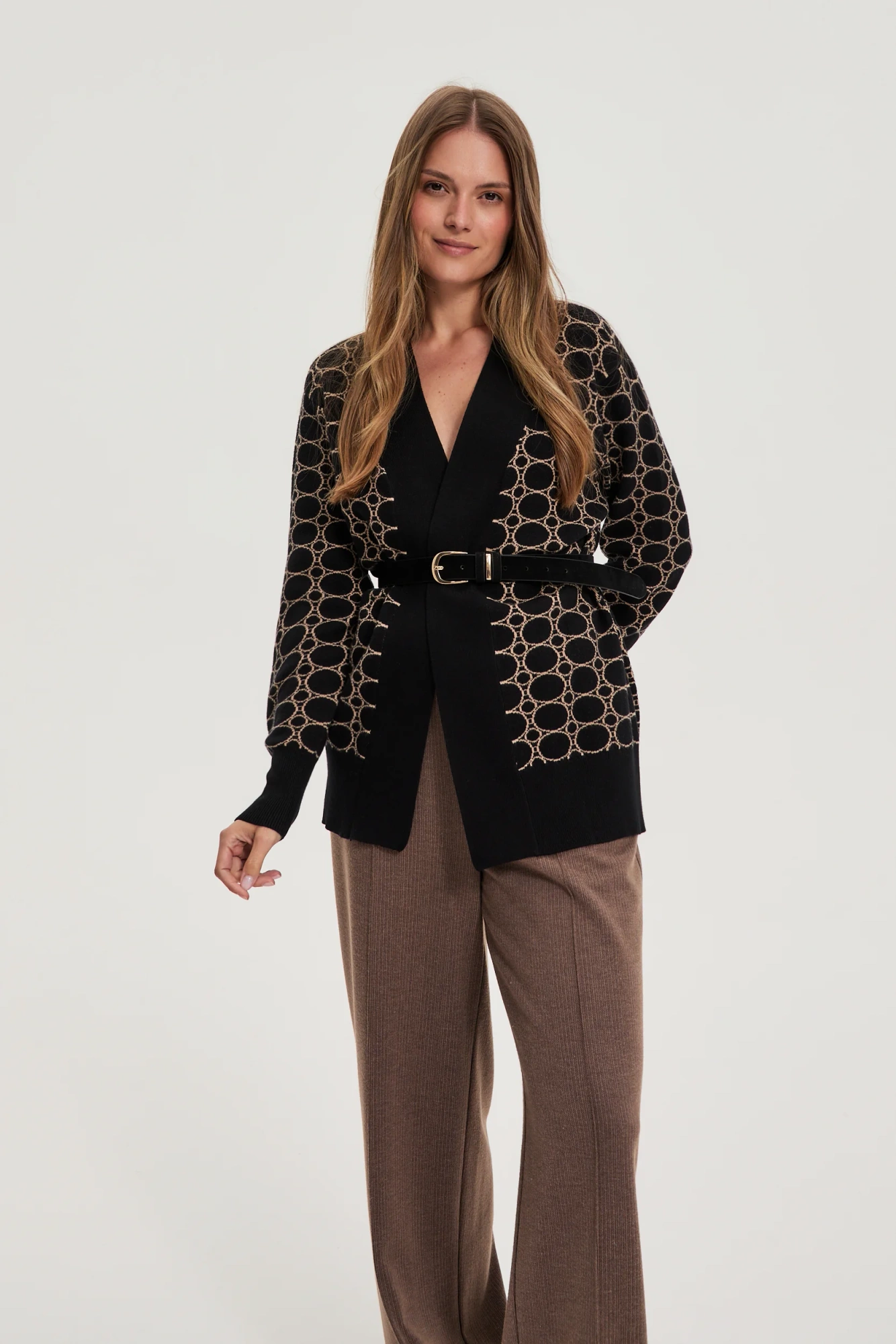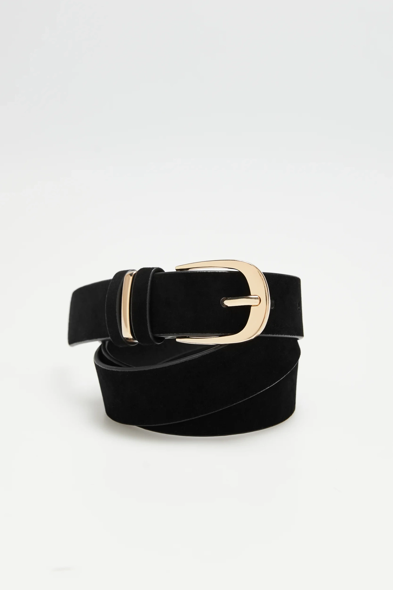 50% POLIURETAN 50% POLIESTER Czarny pasek damski wykonany z trwałego poliuretanu z dodatkiem zamszowych elementów doskonale podkreśla styl każdej stylizacji. Gładka faktura i brak wzoru nadają mu ponadczasowy charakter, dzięki czemu sprawdzi się zarówno w codziennych, jak i bardziej eleganckich zestawieniach. Ozdobna, złota klamra w połączeniu z dekoracyjną szlufką przyciąga wzrok i stanowi modny akcent, który podkreśla indywidualny styl. Idealny wybór na spotkanie biznesowe, rodzinny obiad czy wieczorne wyjście ze znajomymi. Świetnie komponuje się z klasycznymi jeansami, cygaretkami, sukienką lub spódnicą, tworząc spójną i stylową całość. Niezawodny dodatek, który uzupełni każdą garderobę, podkreślając kobiecość i nowoczesny charakter stylizacji.