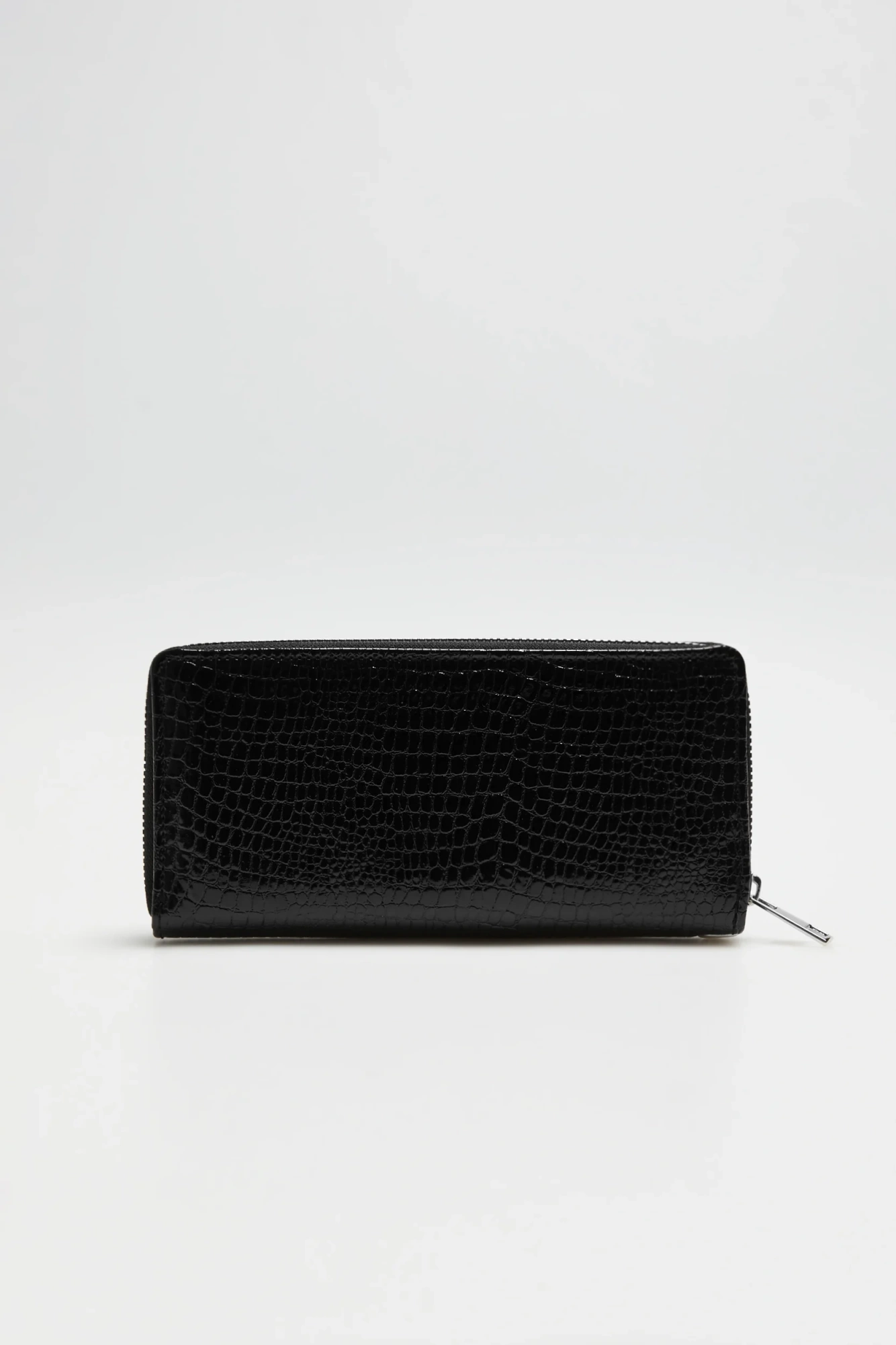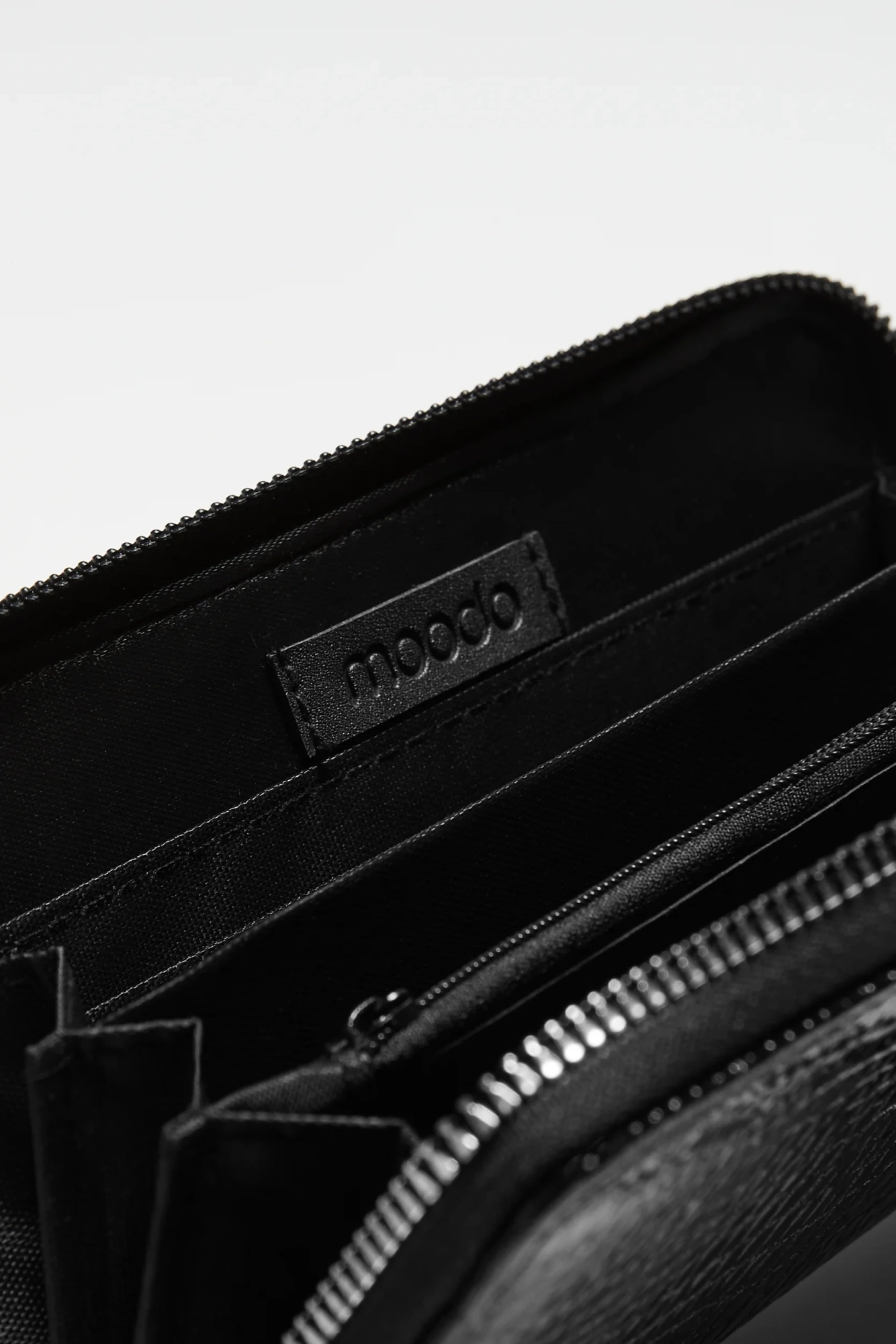 100%POLIURETAN, PODSZEWKA:: 100% POLIESTER  Czarny portfel damski bez wzoru zachwyca elegancją i funkcjonalnością. Gładka powierzchnia oraz duży rozmiar sprawiają, że pomieści niezbędne dokumenty, karty oraz bilon w specjalnym miejscu na monety. Srebrna zawieszka dodaje szykownego akcentu i ułatwia codzienne użytkowanie. Wykonany z trwałego poliuretanu, zapewnia odporność na codzienne użytkowanie oraz łatwość w utrzymaniu czystości.