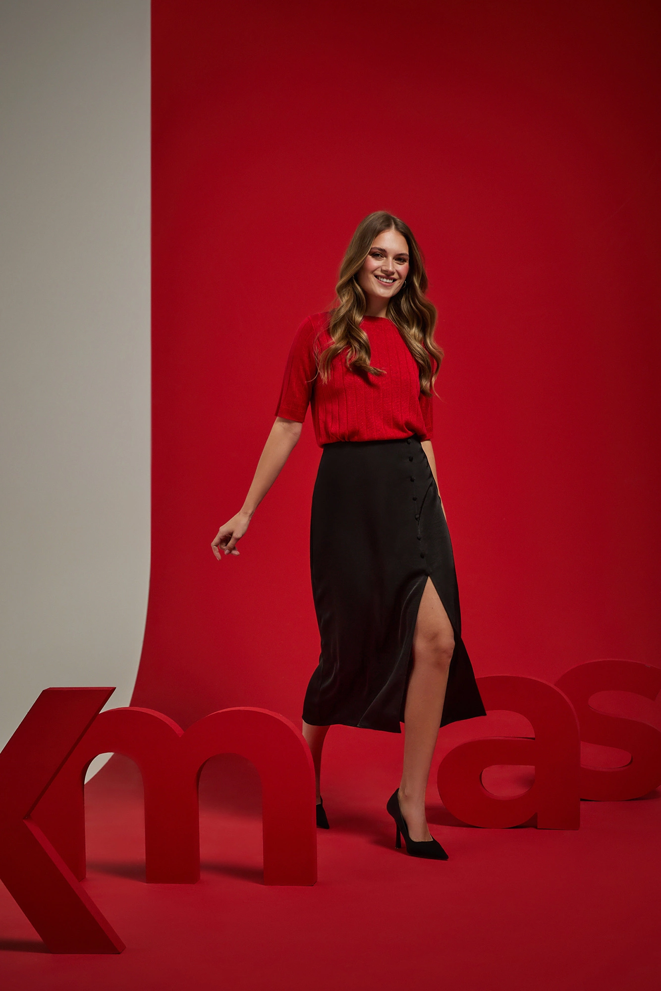 100% POLIESTER Spódnica rozkloszowana w klasycznej czerni to propozycja, która dodaje pewności siebie i subtelnie podkreśla kobiecy styl. Gładka, delikatnie lejąca się tkanina przyjemnie układa się na sylwetce, zapewniając swobodę ruchów i komfort przez cały dzień. Trapezowy fason z ozdobnymi guzikami wprowadza nutę nowoczesnej elegancji, natomiast praktyczny zamek ułatwia codzienne użytkowanie. Spódnica midi do połowy łydki doskonale sprawdza się zarówno w pracy, jak i podczas popołudniowego spaceru czy niezobowiązującego spotkania z przyjaciółmi. Czarna spóca to uniwersalna baza do tworzenia stylizacji na różne okazje. Zestawiona z klasyczną koszulą i marynarką zyskuje biznesowy sznyt, a połączona z miękkim swetrem lubdni basicowym t-shirtem tworzy lekki, codzienny look. Świetnie komponuje się zarówno z botkami, jak i sportowymi sneakersami. Rozkloszowany krój dodaje lekkości i pozwala poczuć się wyjątkowo, niezależnie od sytuacji.