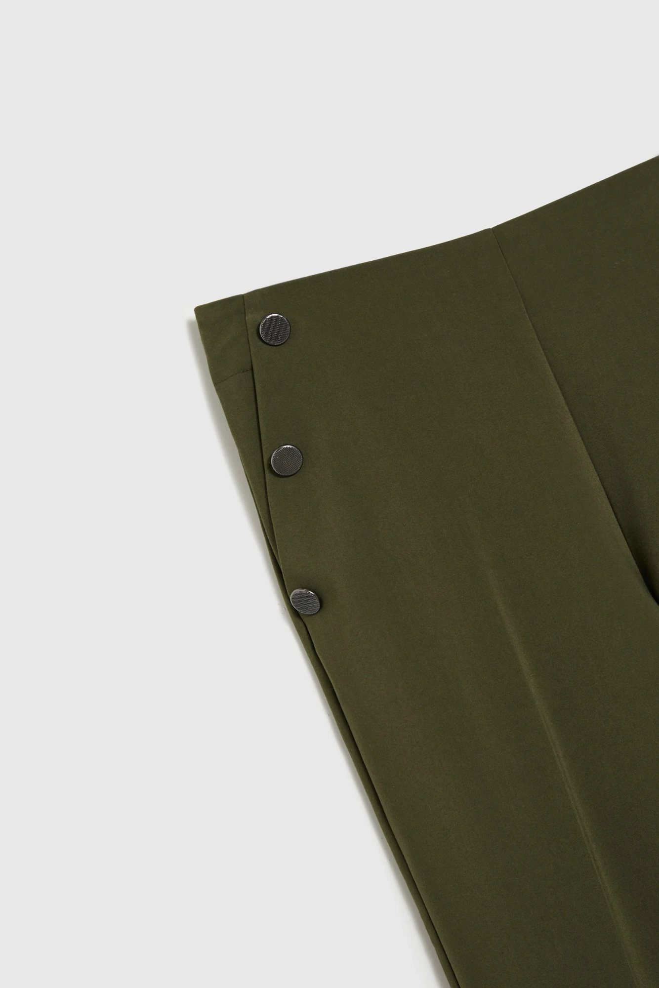 56% BAWEŁNA, 42% POLIESTER, 2% ELASTAN Oliwkowe spodnie cygaretki to połączenie ponadczasowej elegancji i wygodnego fasonu. Gładka tkanina bez wzoru podkreśla uniwersalność modelu, a ozdobne guziki dodają charakteru oraz subtelnej oryginalności. Wygodna guma w talii zapewnia komfort noszenia przez cały dzień, a praktyczne kieszenie pozwalają na swobodne przechowywanie drobnych przedmiotów. Spodnie z kantem optycznie wysmuklają sylwetkę, a długość do kostek sprawia, że nogi wyglądają na smuklejsze. Przyjemna w dotyku mieszanka bawełny i elastycznego materiału gwarantuje swobodę ruchów i trwałość. Model idealny na spotkania biznesowe, do biura, a także na eleganckie wyjścia czy rodzinne uroczystości. Oliwkowe cygaretki świetnie komponują się z białą koszulą, klasycznym żakietem, lekkim swetrem lub modnym topem. Doskonały wybór zarówno do butów na obcasie, jak i sportowych sneakersów, co pozwala na stworzenie wielu stylowych stylizacji na różne okazje.