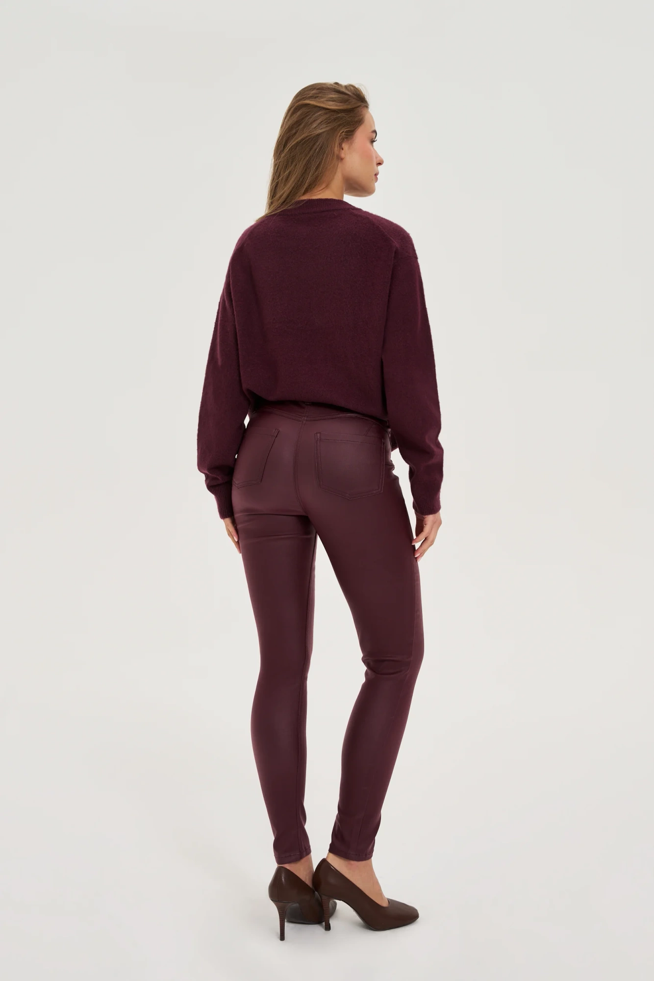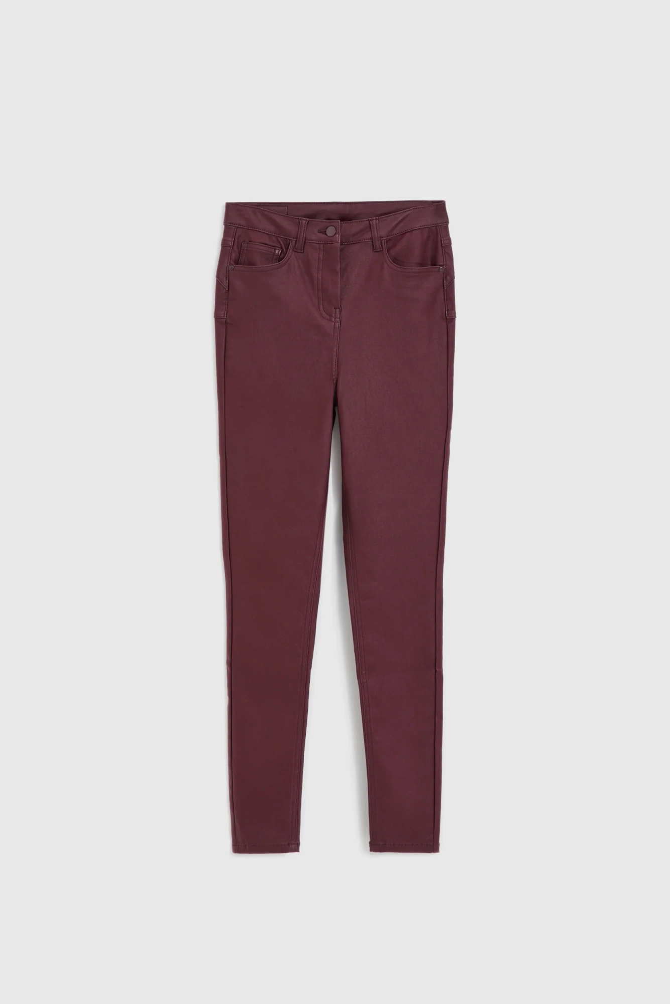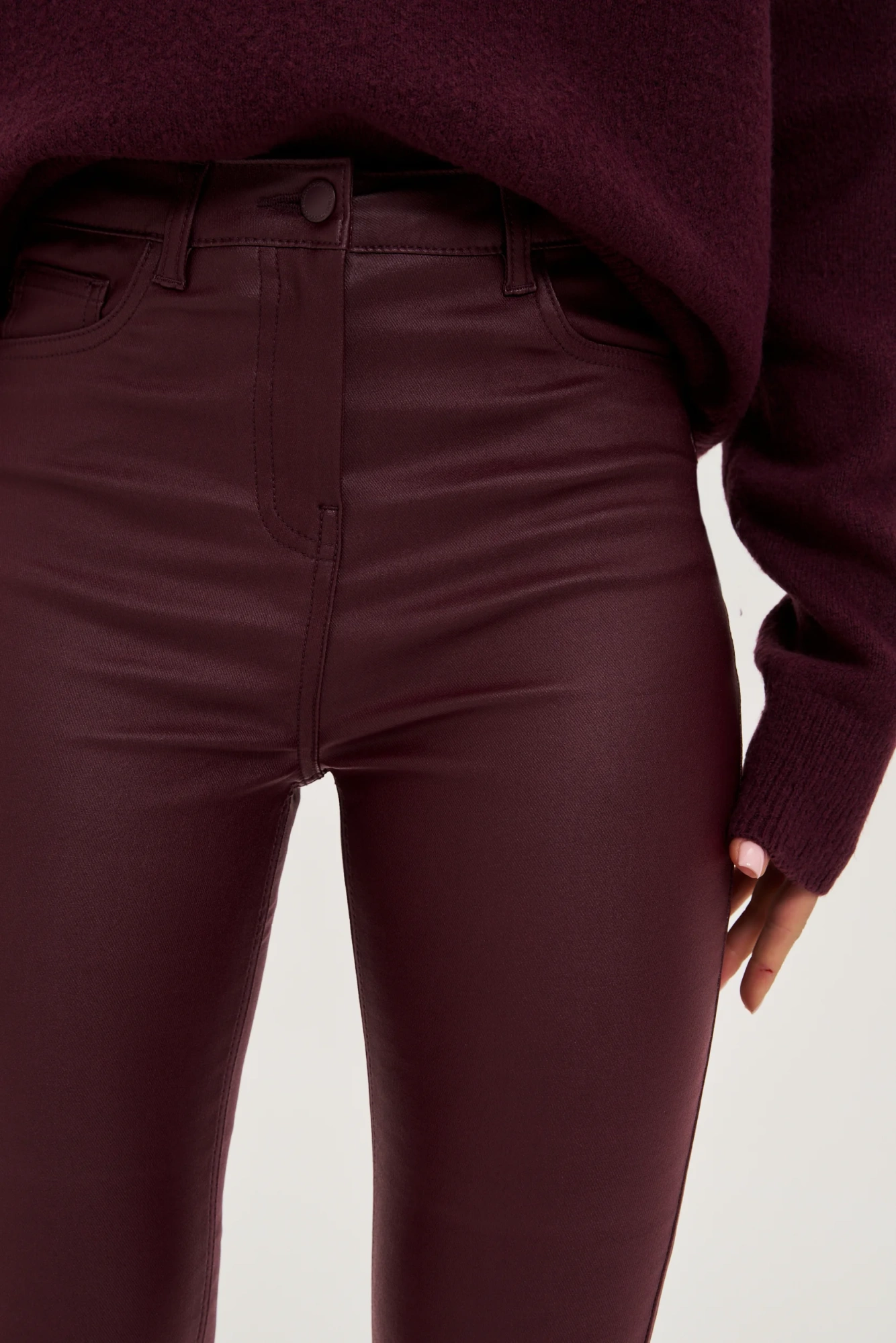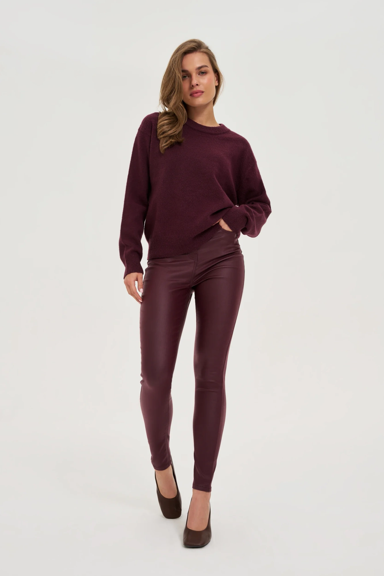 71%WISKOZA, 25%POLIESTER, 4%ELASTAN Burgundowe spodnie rurki woskowane bez wzoru to doskonały wybór dla miłośniczek modnych rozwiązań. Gładka faktura podkreśla elegancję, a funkcjonalne kieszenie dodają praktyczności na co dzień. Model ze średnim stanem oraz długimi nogawkami idealnie modeluje sylwetkę. Zamek błyskawiczny ułatwia szybkie zakładanie i zdejmowanie, zapewniając jednocześnie komfort noszenia. Spodnie zostały wykonane z przewiewnej wiskozy i trwałego materiału, dzięki czemu są wygodne i przyjemne w dotyku. Idealne na wieczorne wyjścia, spotkania towarzyskie czy do pracy w biurze. Burgundowy kolor świetnie komponuje się z białą koszulą, klasycznym swetrem, elegancką marynarką lub luźnym t-shirtem. Doskonale pasują zarówno do szpilek, jak i sportowych sneakersów, tworząc stylowy look na każdą okazję.