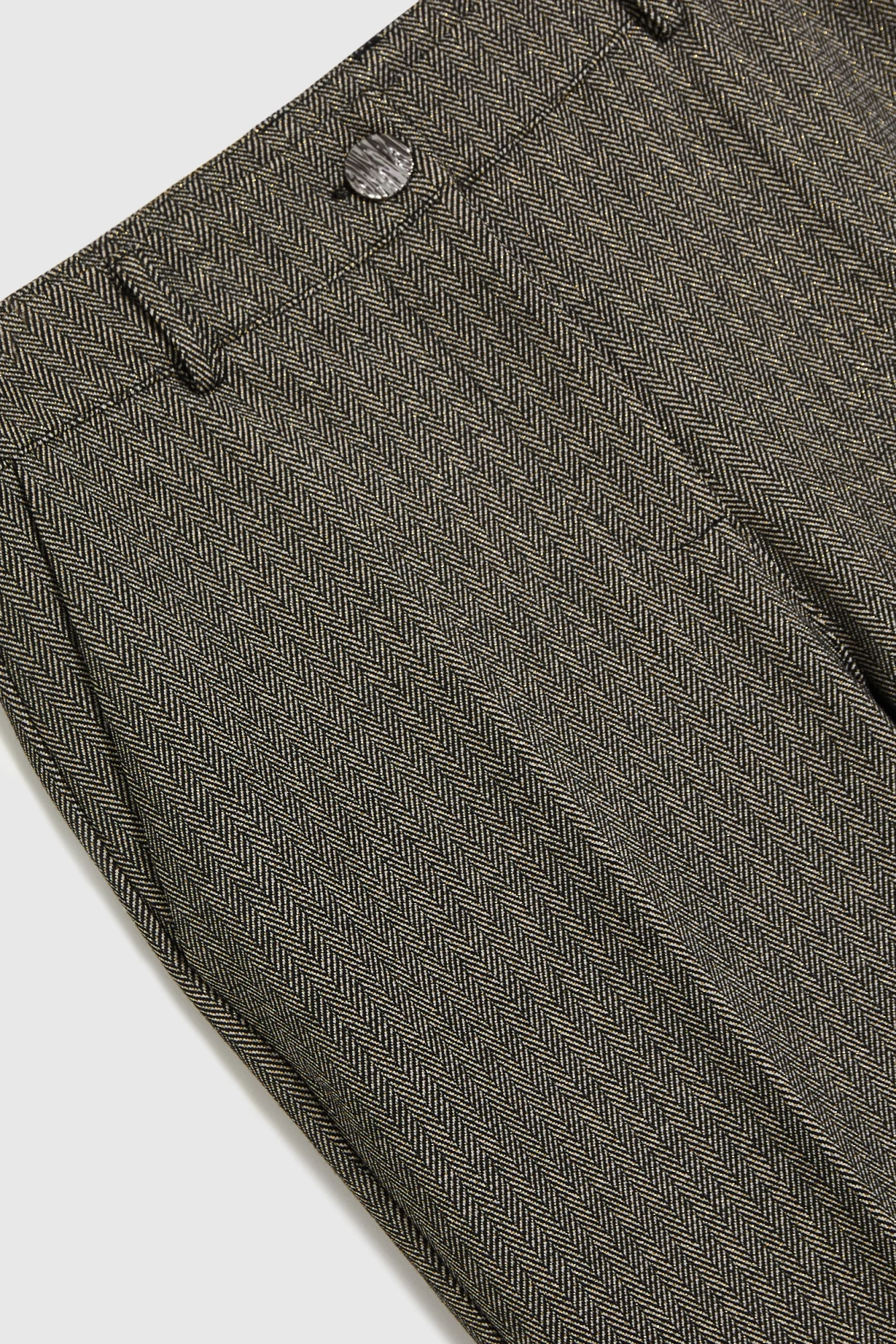 68.3% POLIESTER, 20.7% WISKOZA, 8% METALIZOWANA NITKA, 3% ELASTAN Beżowe spodnie cygaretki w jodełkę zachwycają elegancją i ponadczasowym stylem. Starannie zaprojektowany kant wysmukla sylwetkę, a praktyczne kieszenie podkreślają funkcjonalność modelu. Długi, lekko zwężany fason sprawia, że nogi prezentują się zgrabnie i nowocześnie, a klasyczne zapięcie na zamek i guziki gwarantuje wygodę noszenia. Lekka, przyjemna w dotyku tkanina poliestrowa zapewnia komfort przez cały dzień. Idealne na spotkania biznesowe, wyjścia do pracy czy eleganckie uroczystości. Doskonale komponują się z koszulą, dopasowanym żakietem lub swetrem. Efektownie uzupełnią stylizację z klasycznymi szpilkami lub mokasynami, tworząc zawsze modny i kobiecy look.