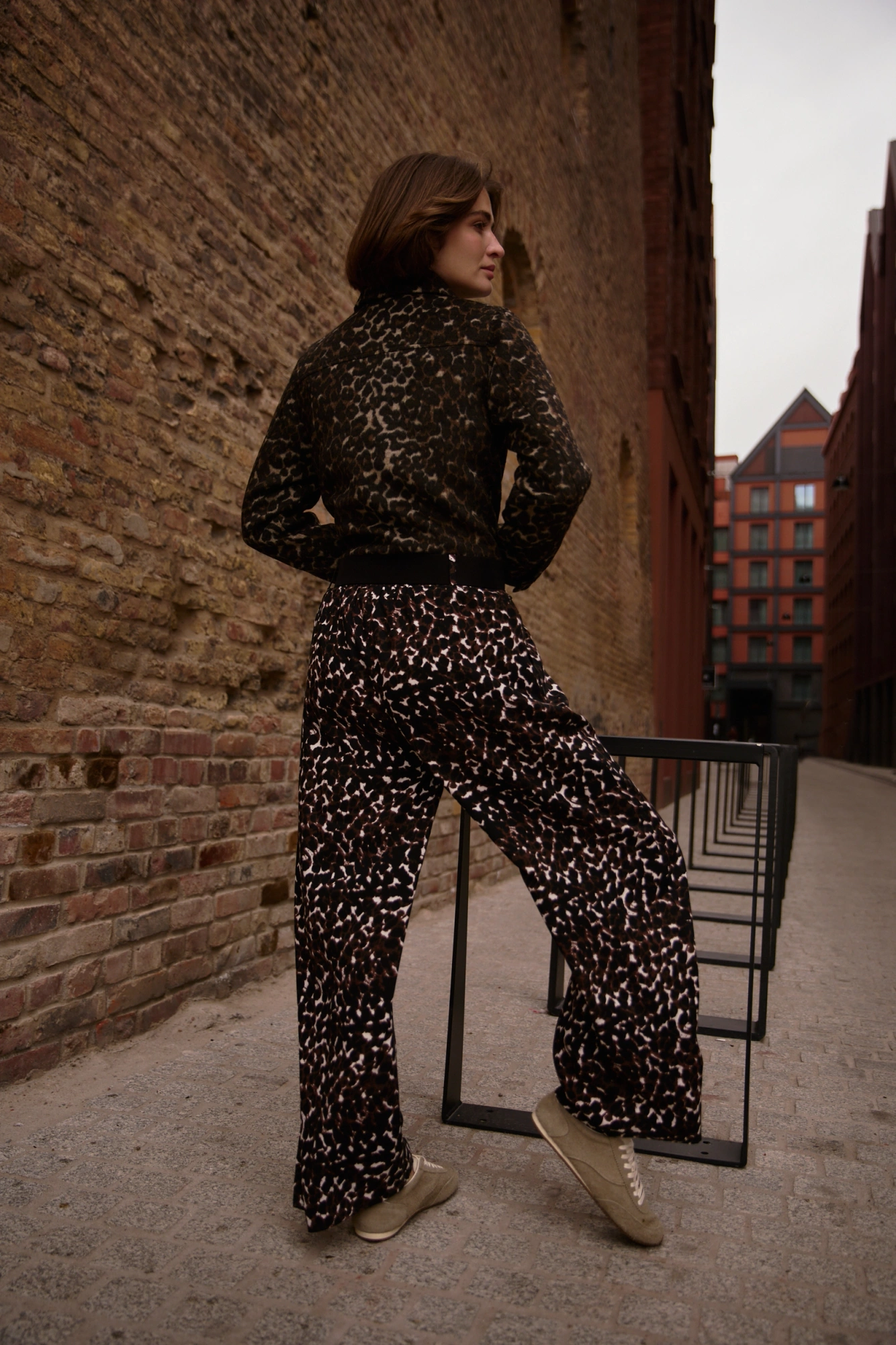 100% WISKOZA Brązowe spodnie damskie z motywem zwierzęcym to propozycja dla miłośniczek oryginalnych rozwiązań i wygody. Zwierzęcy print nadaje całości niepowtarzalnego charakteru, przyciągając wzrok i podkreślając indywidualny styl. Prosty fason oraz długość do kostek gwarantują komfort noszenia przez cały dzień. Ozdobny pasek subtelnie akcentuje talię, a elastyczna guma w pasie zapewnia idealne dopasowanie do sylwetki. Miękka wiskoza w składzie sprawia, że spodnie są przewiewne i przyjemne dla skóry. Model idealny na wyjścia ze znajomymi, casualowe spotkania czy niezobowiązujące uroczystości. Doskonale komponuje się z klasycznym T-shirtem, elegancką koszulą lub lekkim swetrem. Świetny wybór zarówno do sportowych sneakersów, jak i stylowych botków.