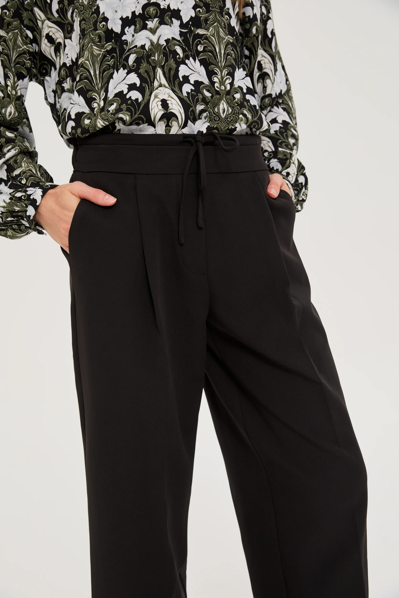 95% POLIESTER, 5% ELASTAN Czarne proste spodnie damskie to doskonały wybór dla kobiet ceniących wygodę i elegancję. Klasyczny, gładki fason bez wzoru sprawia, że spodnie wpisują się w ponadczasowe trendy i podkreślają styl. Praktyczne zaszewki oraz gumka w talii zapewniają idealne dopasowanie do sylwetki, gwarantując komfort noszenia przez cały dzień. Zastosowane kieszenie oraz ozdobne wiązanie dodają funkcjonalności i subtelnej ozdoby, a długie nogawki nadają sylwetce smukłości. Lekka tkanina z poliestru sprawia, że materiał jest trwały, łatwy w pielęgnacji i przyjemny w dotyku. Spodnie sprawdzą się zarówno na co dzień, jak i podczas spotkań biznesowych czy rodzinnych uroczystości. Idealnie pasują do klasycznej koszuli, eleganckiego topu lub swetra.