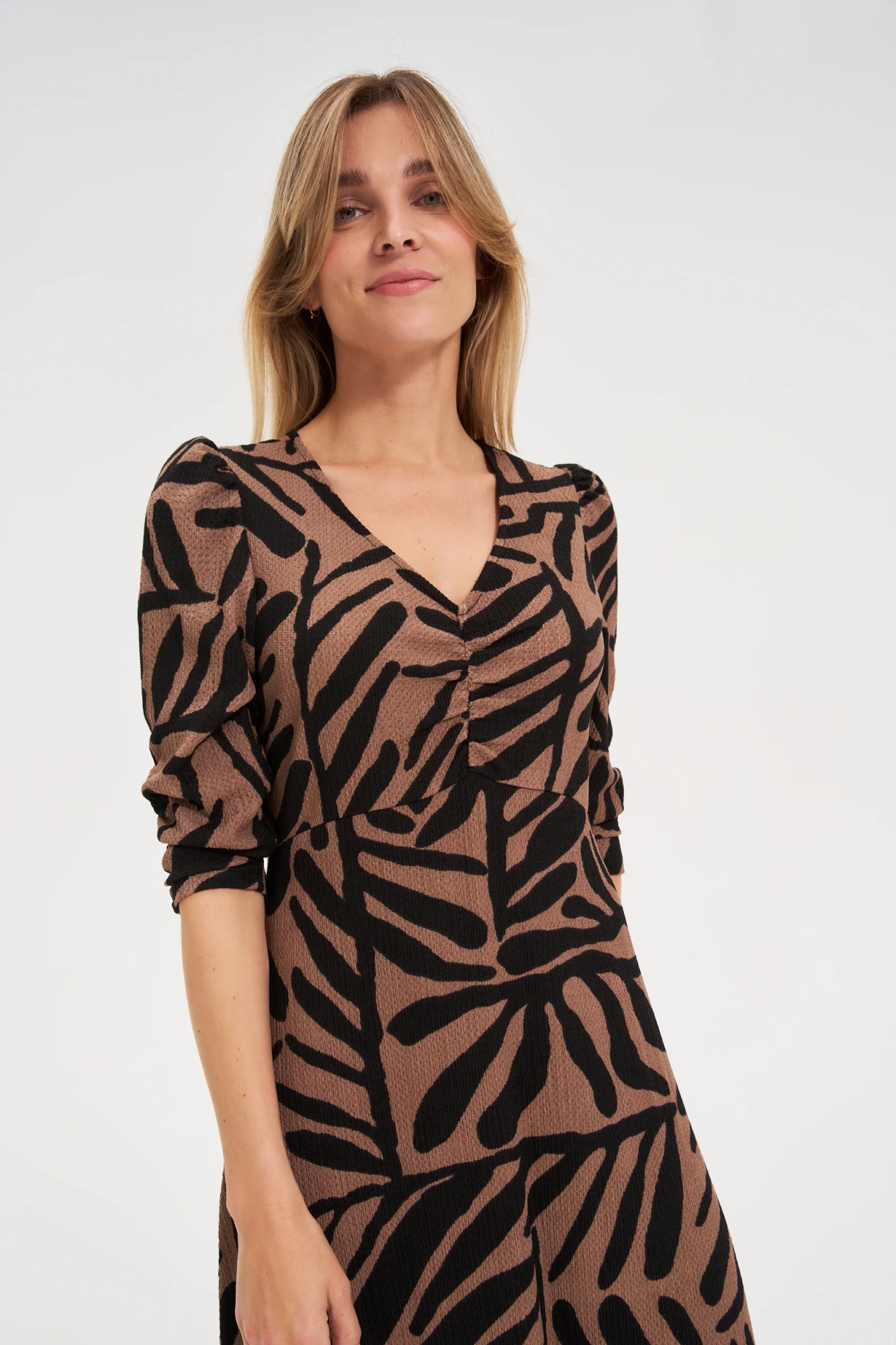 97% POLIESTER, 3% ELASTAN Sukienka damska w geometryczny wzór to połączenie klasycznego stylu i modnego retro charakteru. Czarna i brązowa kolorystyka podkreśla uniwersalność, a subtelne marszczenia oraz bufki nadają elegancji i lekkości. Model w kształcie trapezu pięknie podkreśla sylwetkę i zapewnia komfort noszenia przez cały dzień. Dzianinowy materiał z dodatkiem poliestru gwarantuje wygodę, miękkość i trwałość. Sukienka sięga do połowy łydki, a dekolt w serek dodaje kobiecego wdzięku. Idealna propozycja na wyjątkowe okazje, spotkania rodzinne, eleganckie wyjścia, jak i do pracy czy na co dzień. Doskonale komponuje się z klasycznymi czółenkami, botkami czy sandałami na obcasie.