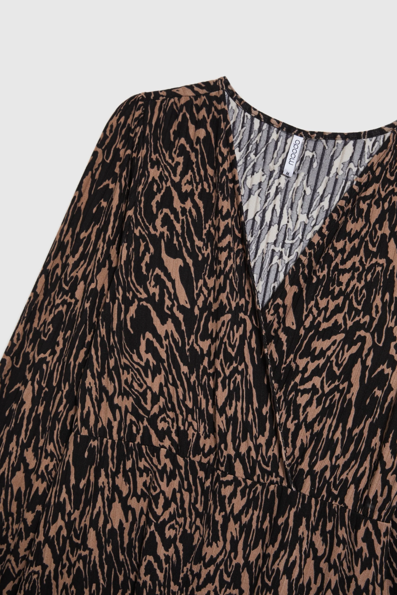 95%POLIESTER,5%ELASTANSukienka damska o trapezowym fasonie w klasycznym, eleganckim stylu przyciąga uwagę niebanalnym połączeniem czerni i brązu oraz unikalnym miksem wzorów. Bufiaste rękawy i efektowne marszczenia subtelnie podkreślają sylwetkę, a gumka w pasie zapewnia wygodę i idealne dopasowanie. Kopertowy dekolt w serek wydłuża szyję, a długość do połowy łydki sprawia, że sukienka prezentuje się wyjątkowo szykownie. Idealny wybór zarówno na specjalną okazję, spotkania rodzinne czy eleganckie wyjście, jak i jako stylowa propozycja do pracy lub na co dzień. Świetnie współgra z klasycznymi szpilkami, botkami na obcasie lub modnymi sneakersami.