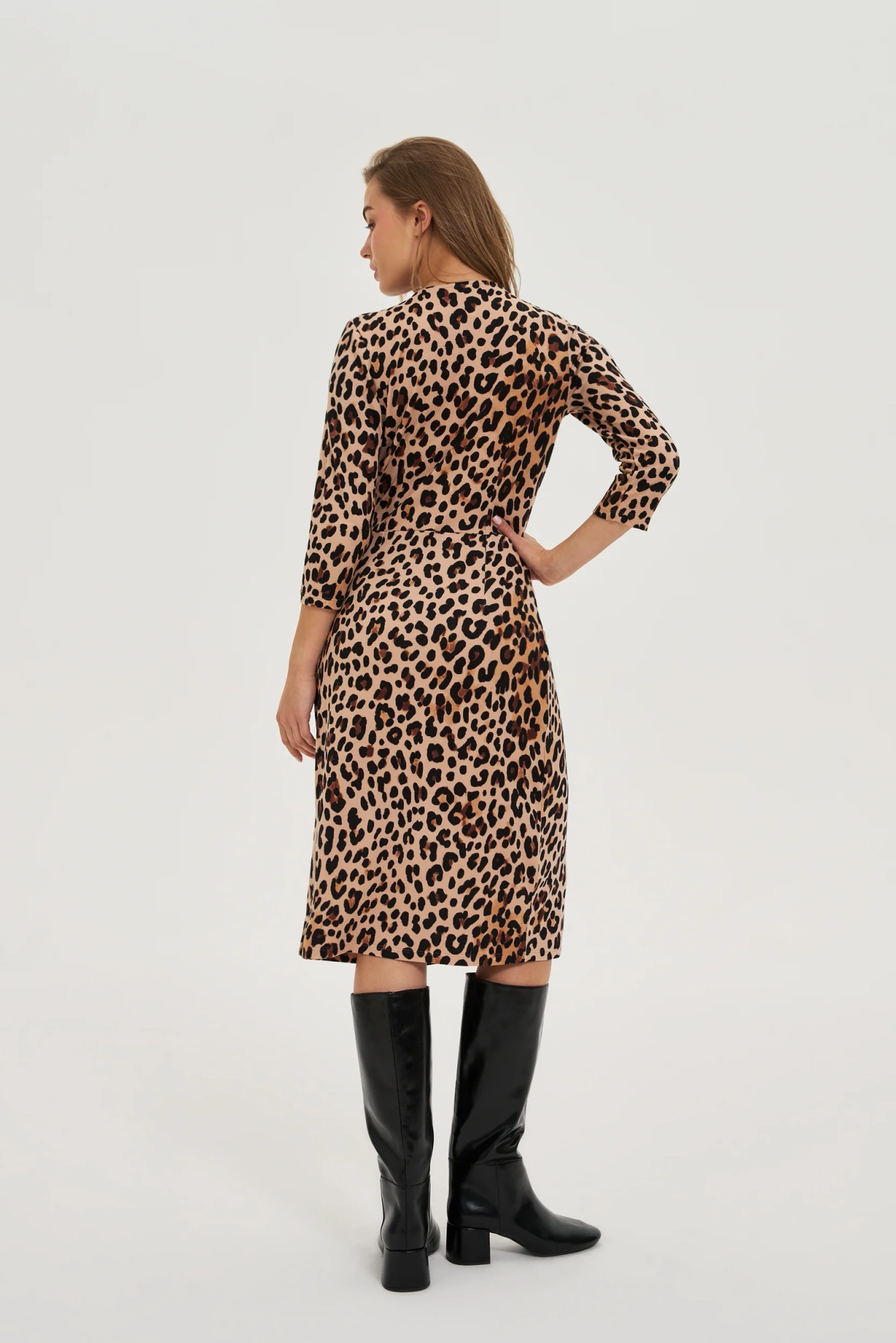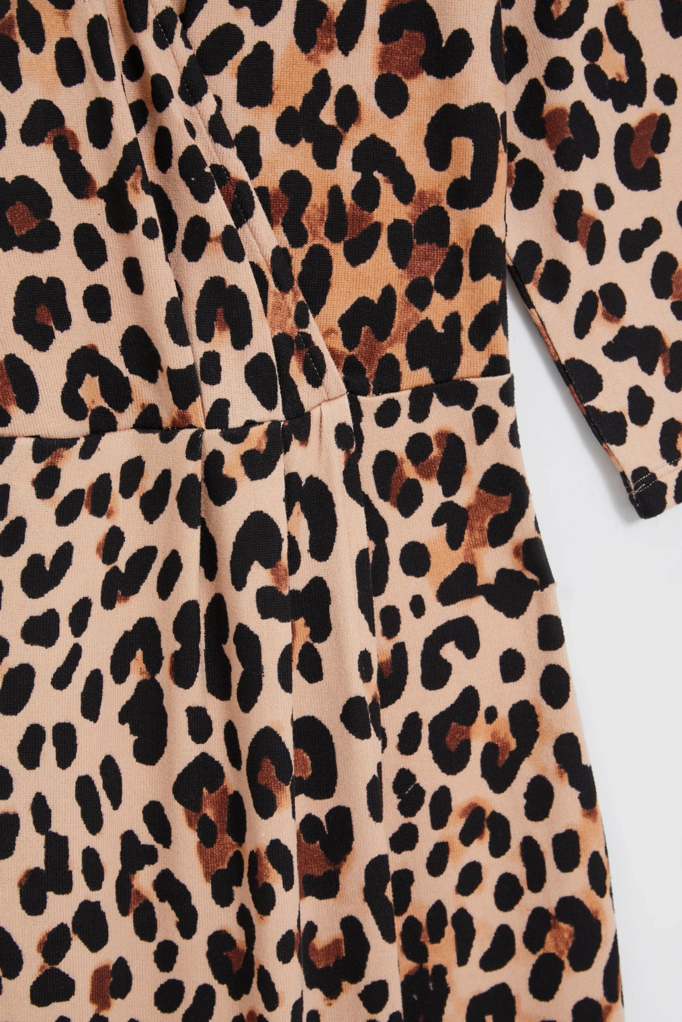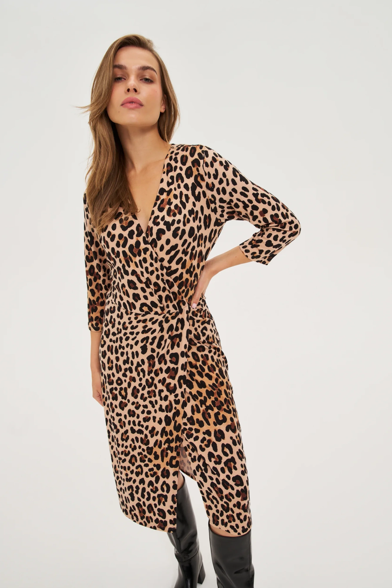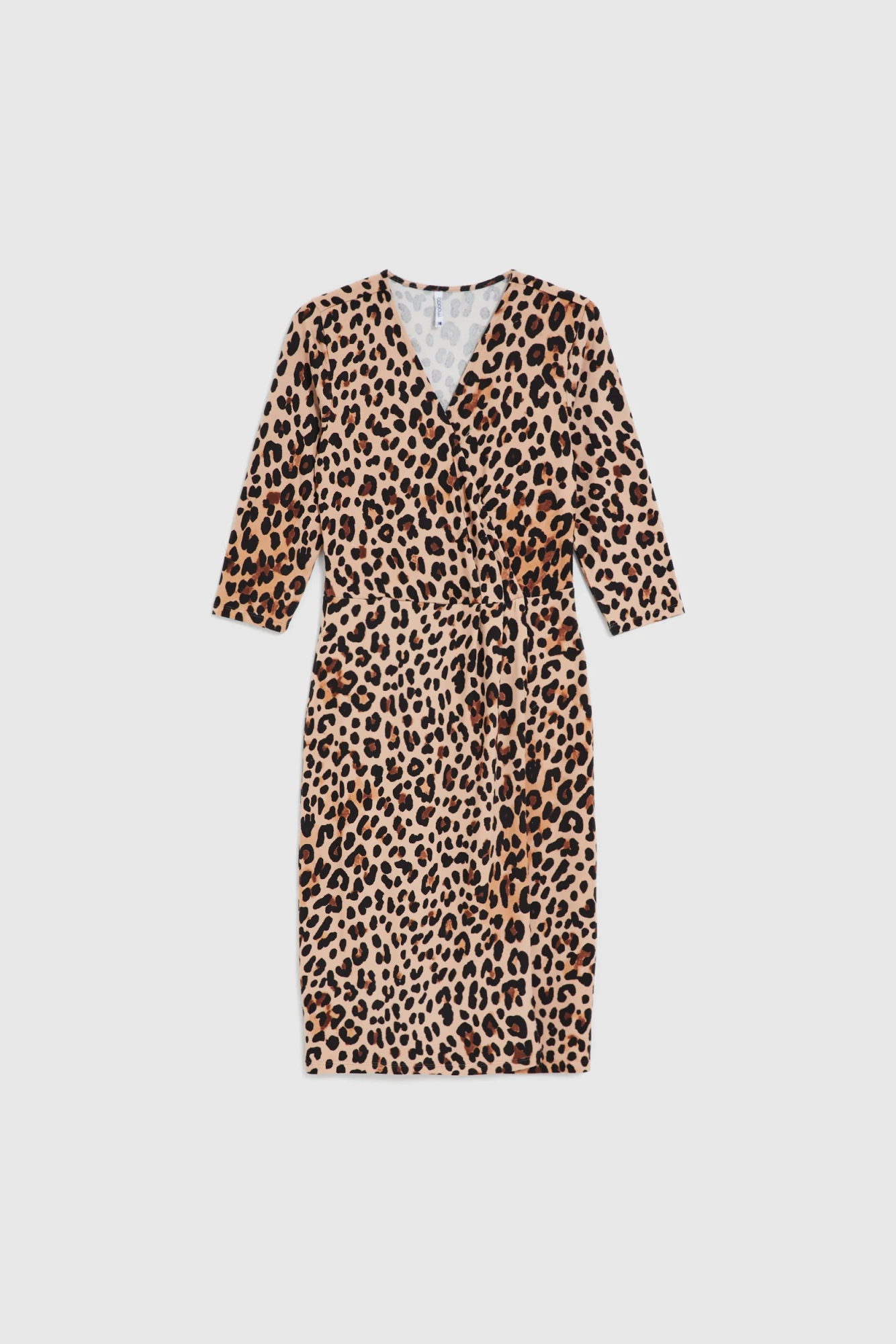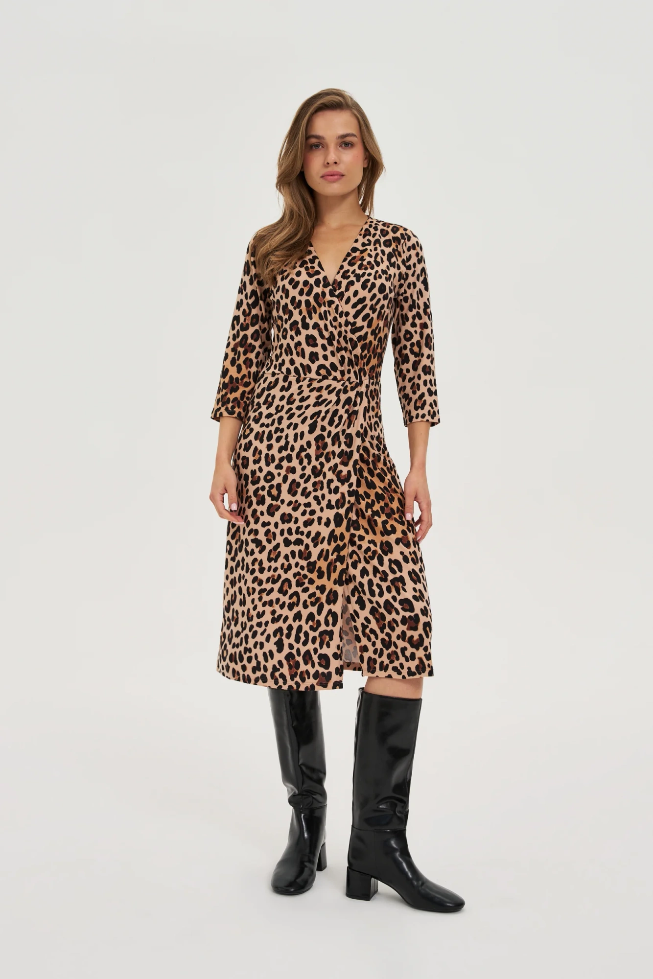 95%POLIESTER,5%ELASTAN Sukienka damska w modnym, zwierzęcym wzorze zachwyca wyjątkowym połączeniem beżowego, czarnego. Kopertowy krój z dekoltem w serek podkreśla sylwetkę, a delikatne marszczenia dodają subtelnej elegancji. Dopasowana, dzianinowa tkanina zapewnia wygodę przez cały dzień, a długość za kolano sprawia, że kreacja pozostaje klasyczna i uniwersalna. Sukienka łączy styl casual z elegancją, oferując niebanalny design na każdą porę roku. Idealny wybór na specjalne okazje, spotkania biznesowe, a także codzienne wyjścia. Doskonale komponuje się z klasycznymi szpilkami, botkami, lekką marynarką lub ramoneską. Sprawdzi się zarówno w pracy, jak i podczas wieczornego spotkania czy rodzinnej uroczystości, podkreślając indywidualny styl i wyczucie trendów.