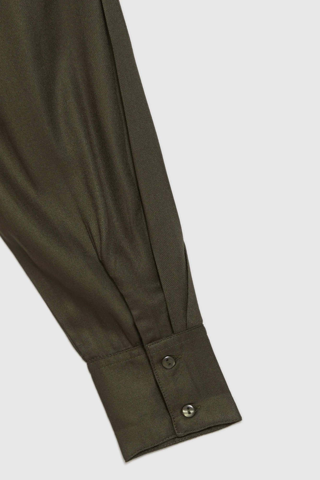 100% WISKOZA Sukienka szmizjerka w odcieniu oliwki to idealna propozycja dla kobiet ceniących klasykę z nutą elegancji. Gładka, bez wzoru, wykonana z przewiewnej wiskozy, zapewnia komfort użytkowania przez cały dzień. Taliowany fason trapezowy podkreśla sylwetkę, a długość do połowy łydki dodaje szyku. Praktyczne kieszenie oraz subtelne marszczenia przy dekolcie w serek nadają całości lekkości. Guziki na całej długości i eleganckie mankiety podkreślają ponadczasowy charakter sukienki. Idealna na specjalne okazje, do pracy czy na co dzień. Doskonale komponuje się z klasycznymi szpilkami, botkami, płaszczem w stylu minimalistycznym lub skórzaną ramoneską. Świetnie wygląda z prostą torebką i delikatną biżuterią, tworząc spójną, modną stylizację na każdą porę roku.