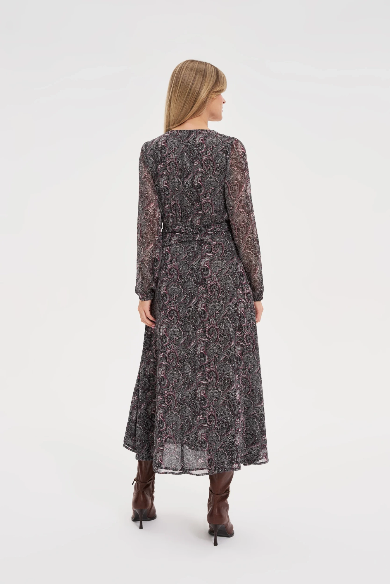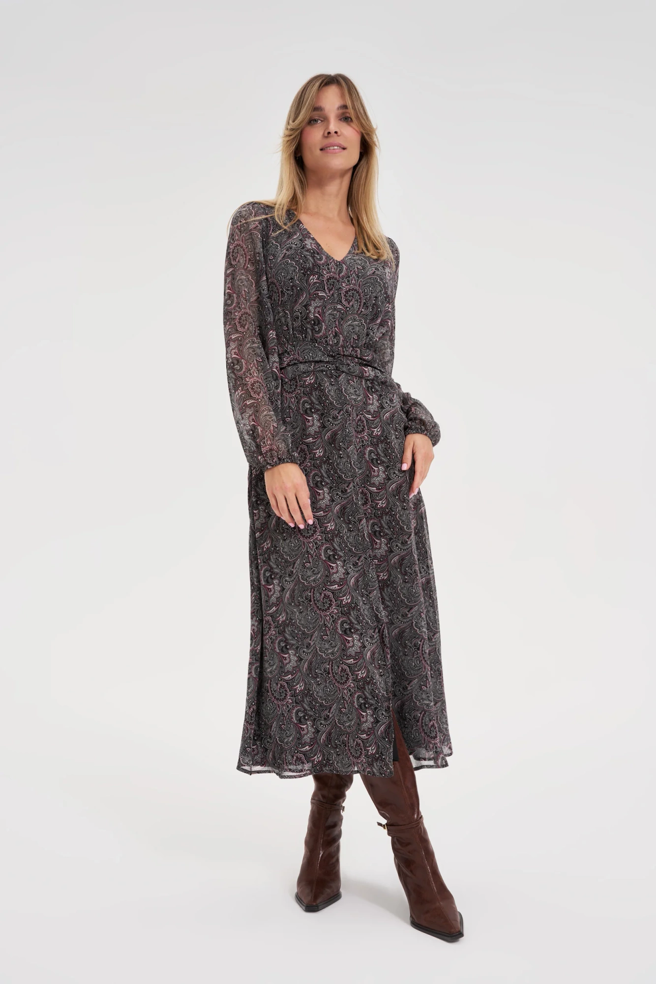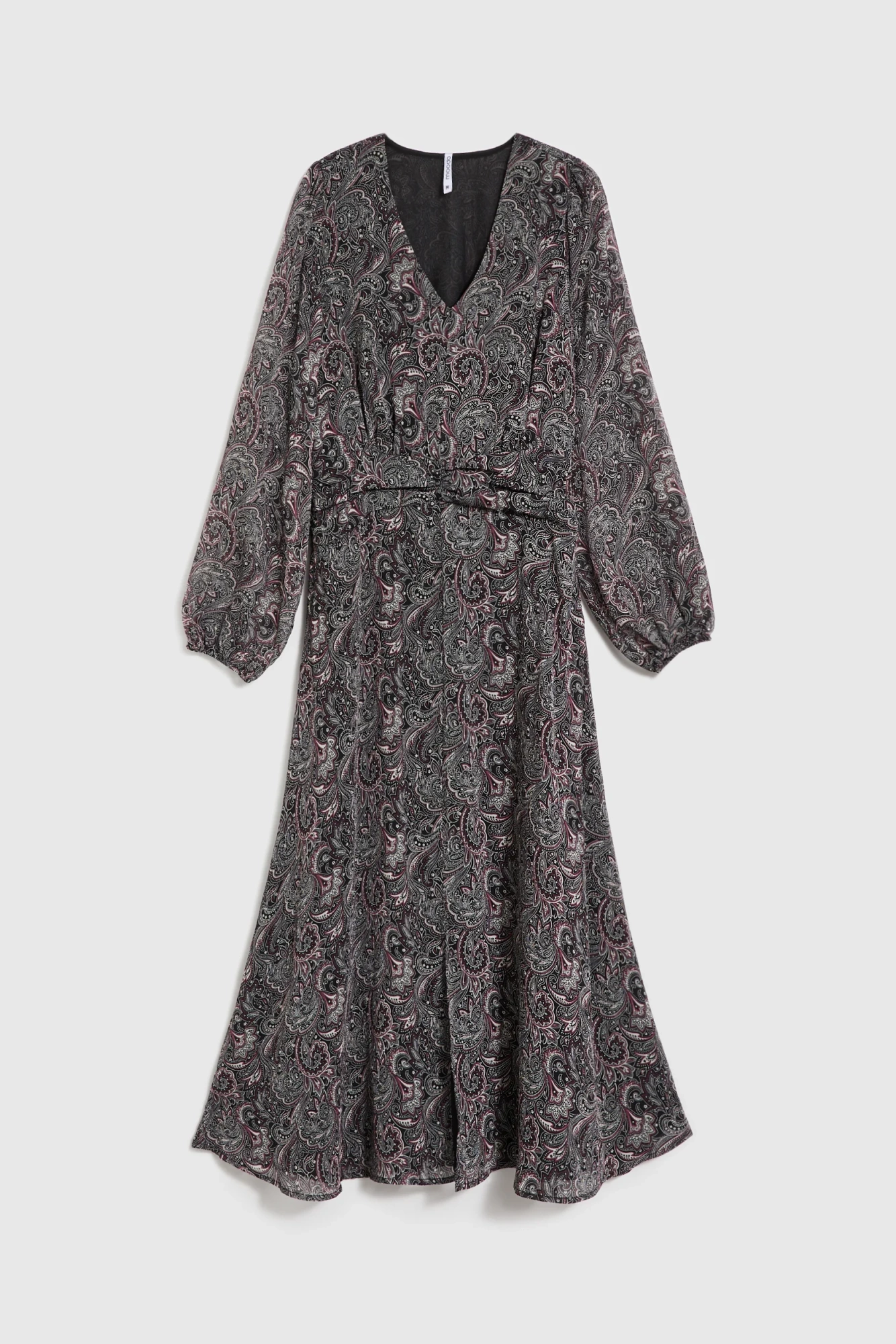 100% POLIESTER, PODSZEWKA:: 100% POLIESTER Sukienka midi w kolorze czarny, ozdobiona wzorem. W kolorze czarnym. Posiada długie, bufiaste rękawy i dekolt w serek. Świetnie pasuje do kozaków i marynarki.