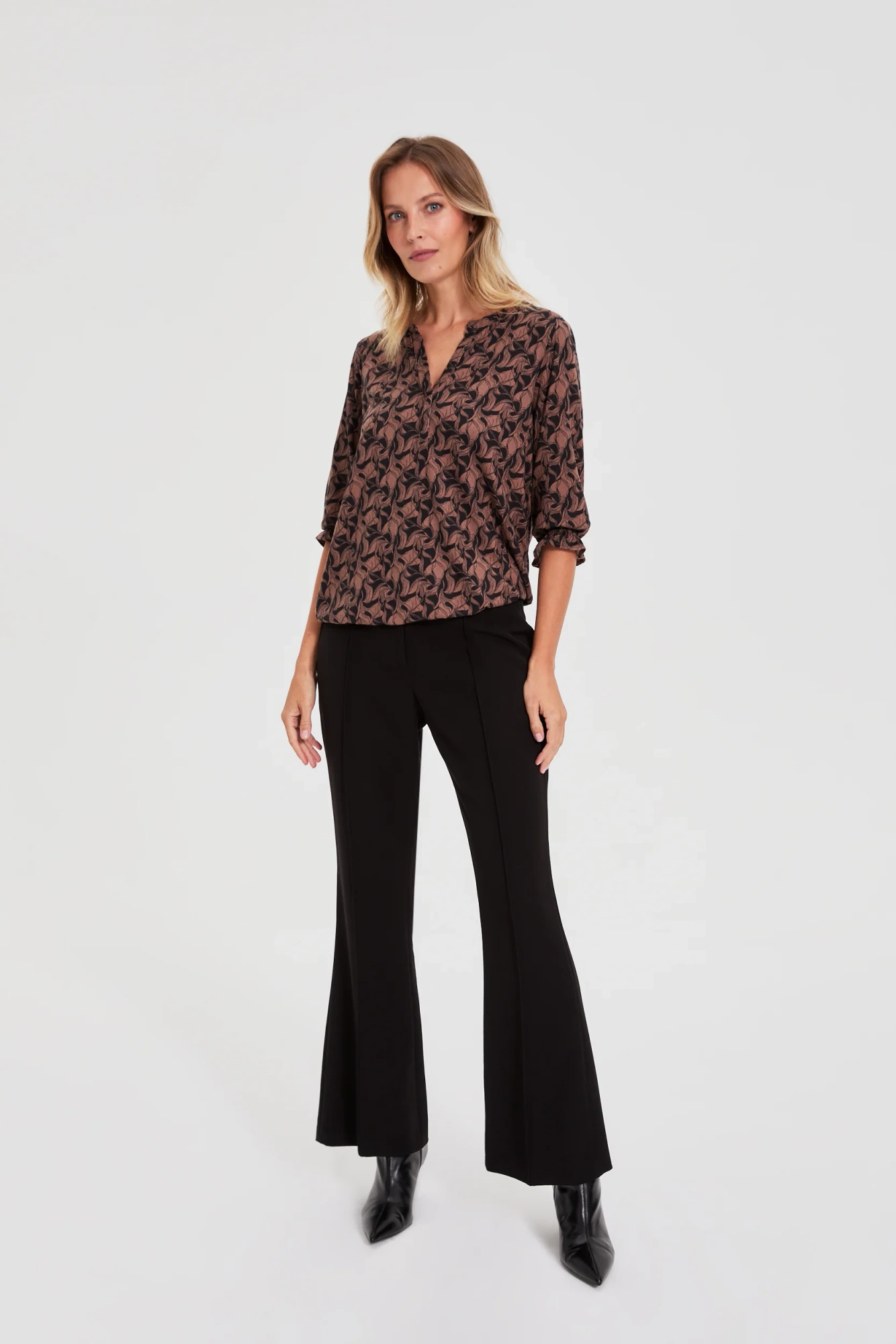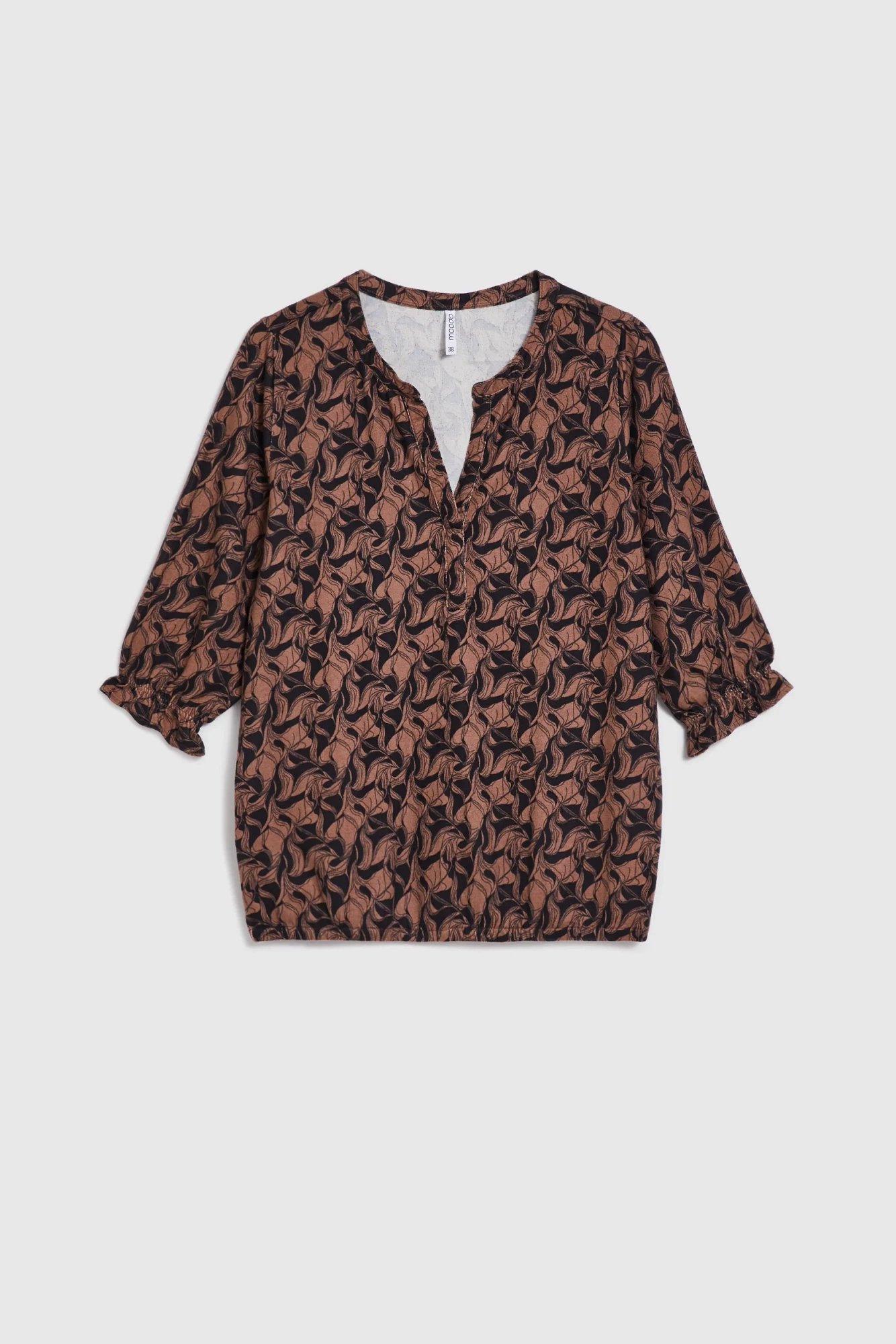 95%POLIESTER,5%ELASTAN Brązowy sweter damski z oryginalnym mixem wzorów przyciąga spojrzenia niebanalnym nadrukiem oraz subtelną falbanką na rękawie, która dodaje lekkości każdej stylizacji. Luźny fason gwarantuje komfort noszenia, a elastyczna guma u dołu i w mankietach zapewnia idealne dopasowanie do sylwetki. Rękaw 3/4  oraz dekolt w serek podkreślają nowoczesny charakter produktu. Materiał z dodatkiem poliestru sprawia, że sweter jest trwały, przyjemny w dotyku i łatwy w pielęgnacji. Idealny na spotkania z przyjaciółmi, do pracy lub na weekendowe wyjścia. Doskonale komponuje się z jeansami, dopasowanymi spodniami, a także spódnicami w jednolitych kolorach. Świetnie sprawdzi się zarówno w casualowych, jak i eleganckich stylizacjach, tworząc modny look na każdą okazję.