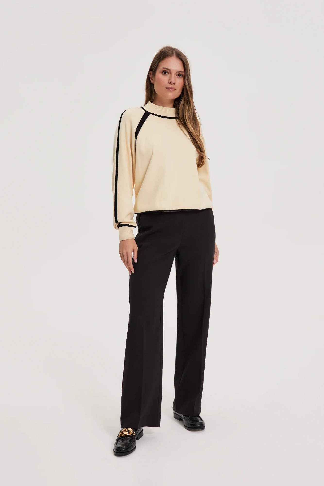 50% WISKOZA, 28% POLIESTER, 22% POLIAMID Kremowy sweter damski w odcieniu ecru to połączenie uniwersalnego stylu i wygody. Gładka faktura bez wzoru sprawia, że model zachwyca ponadczasową elegancją, a półgolf dodaje subtelnego charakteru. Luźny krój swetra z rękawem typu raglan zapewnia pełną swobodę ruchów i komfort noszenia przez cały dzień. Miękka mieszanka wiskozy oraz innych włókien gwarantuje przyjemność dotyku i trwałość materiału, idealną na każdą porę roku. Ten sweter doskonale sprawdzi się w codziennych stylizacjach do pracy, na spacer czy spotkanie ze znajomymi. Świetnie komponuje się zarówno z klasycznymi jeansami, jak i eleganckimi spodniami czy plisowaną spódnicą.