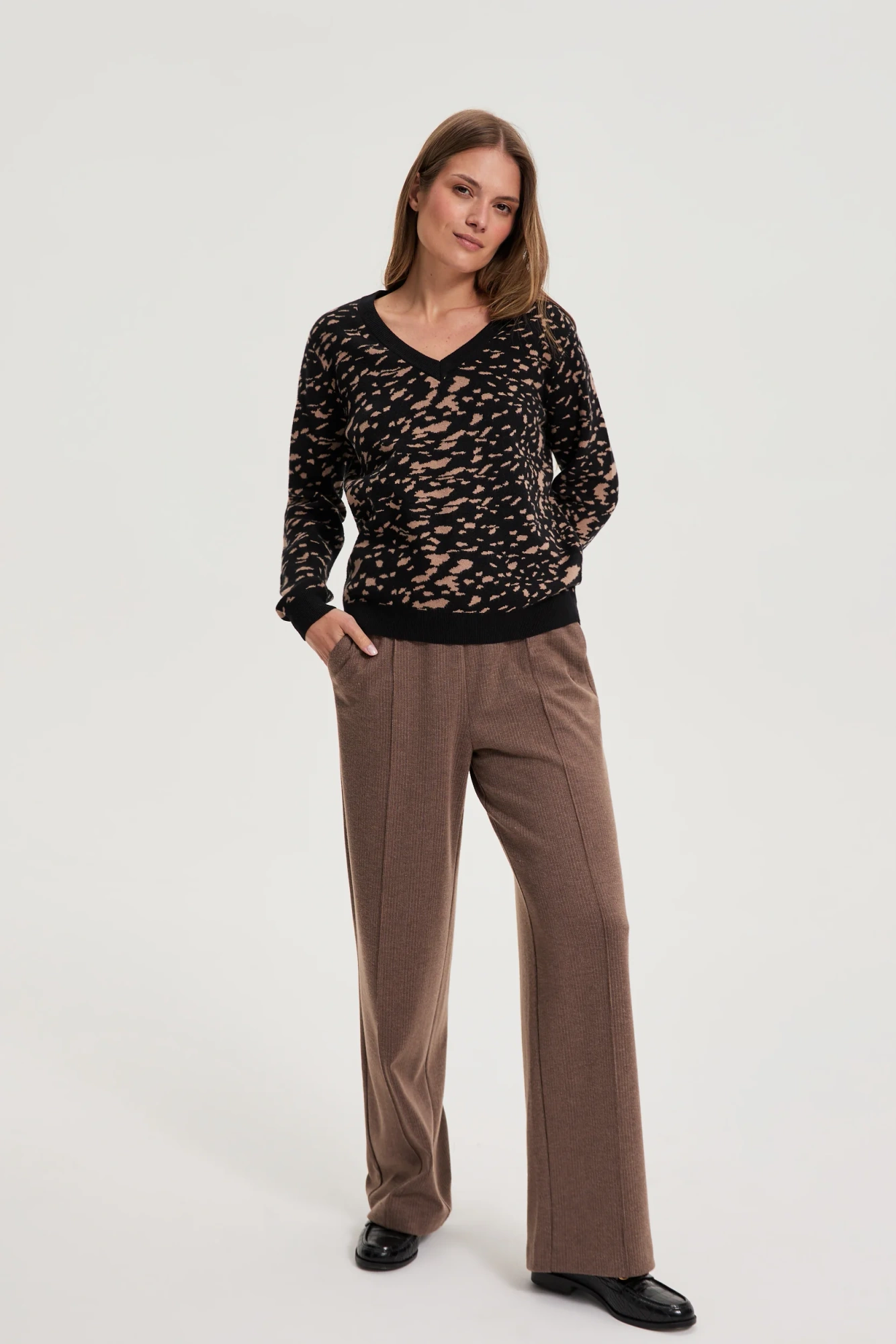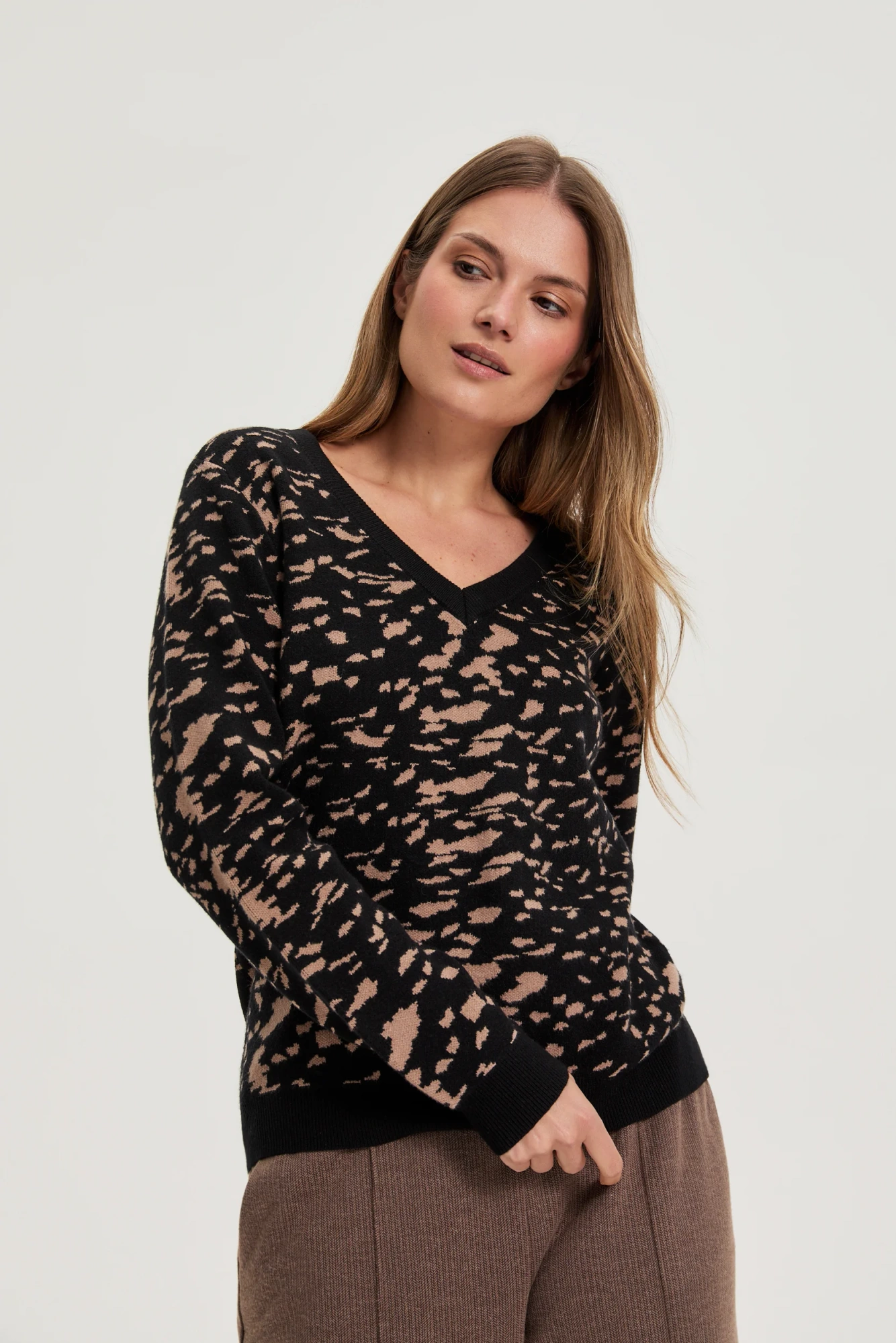 52% WISKOZA, 28% POLIESTER, 20% POLIAMID Czarny sweter damski z oryginalnym wzorem w klasycznym wydaniu to propozycja, która wyznacza nowe trendy w codziennym stylu. Model z długim rękawem oraz modnym dekoltem w serek doskonale podkreśla sylwetkę i zapewnia komfort przez cały dzień. Miękka wiskoza sprawia, że noszenie staje się wyjątkowo przyjemne. Idealny wybór na spotkania biznesowe, rodzinne uroczystości, randkę czy wyjście na miasto. Doskonale komponuje się zarówno z eleganckimi spodniami, ołówkową spódnicą, jak i jeansami, tworząc zawsze modną stylizację na każdą okazję.