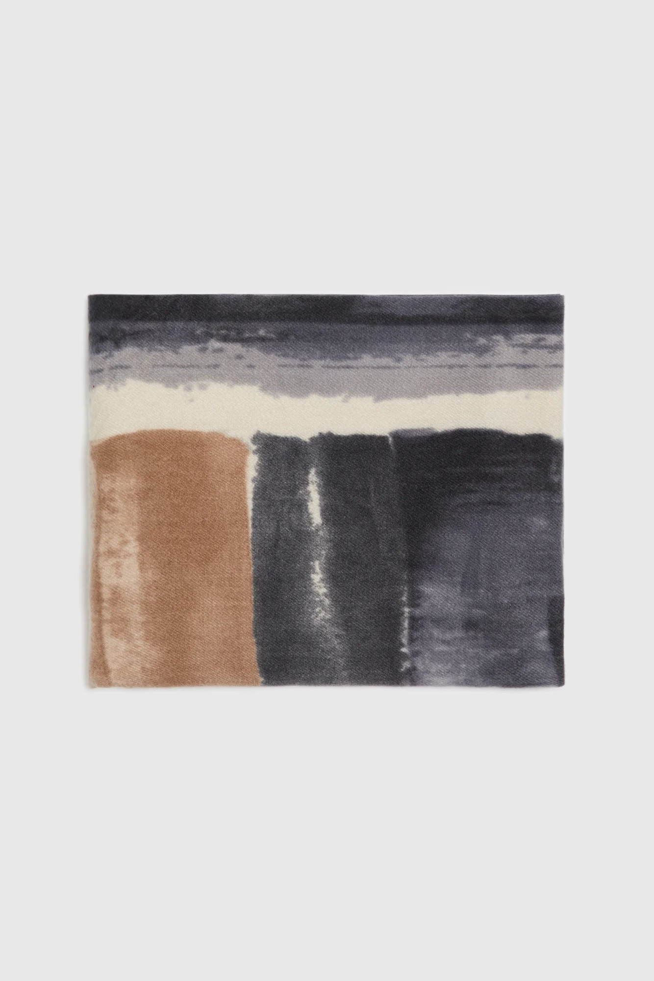 100% POLIESTER Wzorzysty szal z kolorach granatowym i beżowym. Świetnie sprawdzi się jesienią i zimą z połączeniu z eleganckim płaszczem lub kurtką.