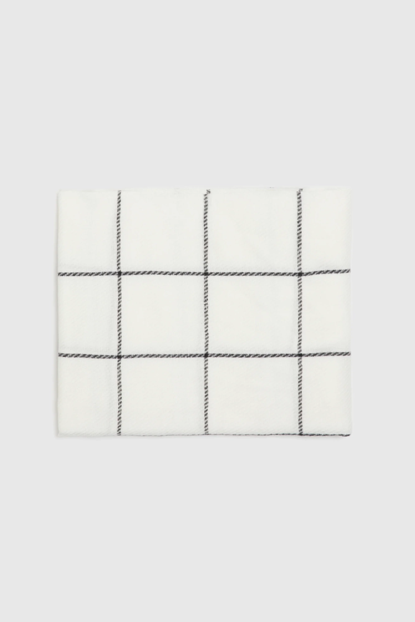 100% POLIESTER Szalik w kolorze białym, w kratę.  Zakończony frędzlami. Świetnie sprawdzi się w jesienno-zimowych stylizacjach.