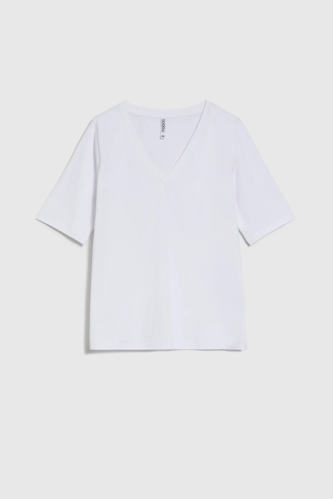 95%BAWEŁNA,5%ELASTAN Klasyczna biała bluzka z krótkim rękawem i dekoltem w serek to must-have w każdej garderobie. Gładka struktura oraz uniwersalny krój sprawiają, że stanowi doskonałą bazę do wielu stylizacji. Subtelny dekolt V neck optycznie wysmukla szyję, podkreślając delikatnie kobiecą sylwetkę. Idealny wybór na co dzień, do pracy, spacer czy spotkanie ze znajomymi. Pasuje zarówno do jeansów, spódnicy, jak i eleganckich spodni oraz marynarki, tworząc niezobowiązujący, a jednocześnie stylowy look. Biała bluzka t-shirt bez wzoru świetnie sprawdzi się w zestawieniu z kardiganem, ramoneską lub pod swetrem w chłodniejsze dni.