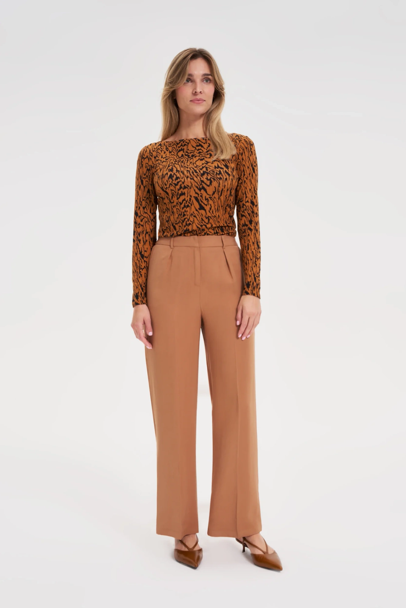 95%POLIESTER,5%ELASTAN Bluzka camelowa w zwierzęcy wzór to propozycja, która wyróżnia się modnym designem i dopracowanym krojem. Dopasowany fason podkreśla sylwetkę, a dekolt typu łódka subtelnie eksponuje linię ramion. Długi rękaw sprawia, że bluzka doskonale sprawdza się w chłodniejsze dni, zapewniając komfort noszenia. Materiał wykonania to miękki poliester, gwarantujący wygodę oraz trwałość. Model idealny na spotkania ze znajomymi, do pracy czy wieczorne wyjścia. Świetnie komponuje się z klasycznymi spodniami, ołówkową spódnicą, a także jeansami o prostym kroju. Doskonały wybór do stylizacji zarówno casualowych, jak i bardziej eleganckich.