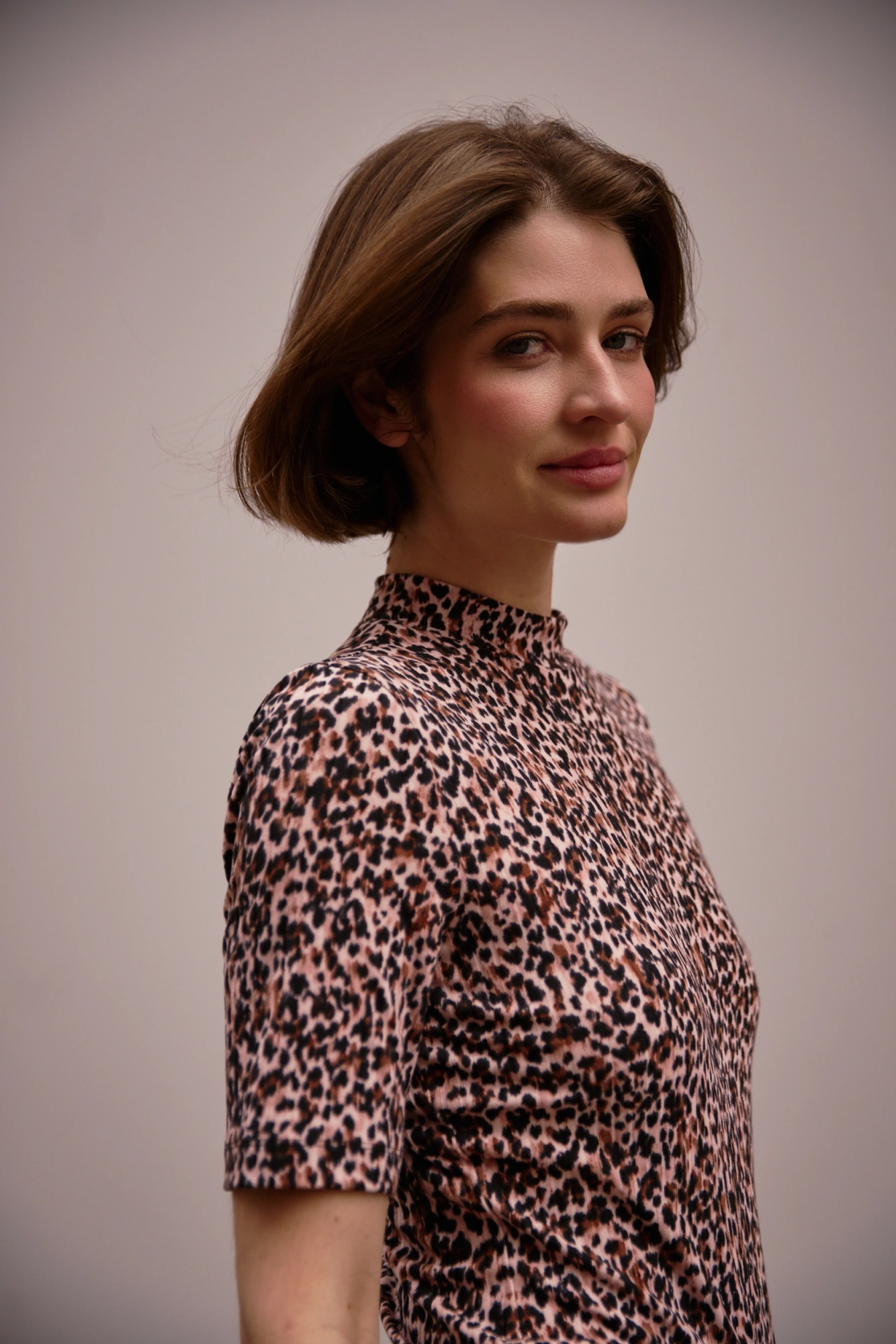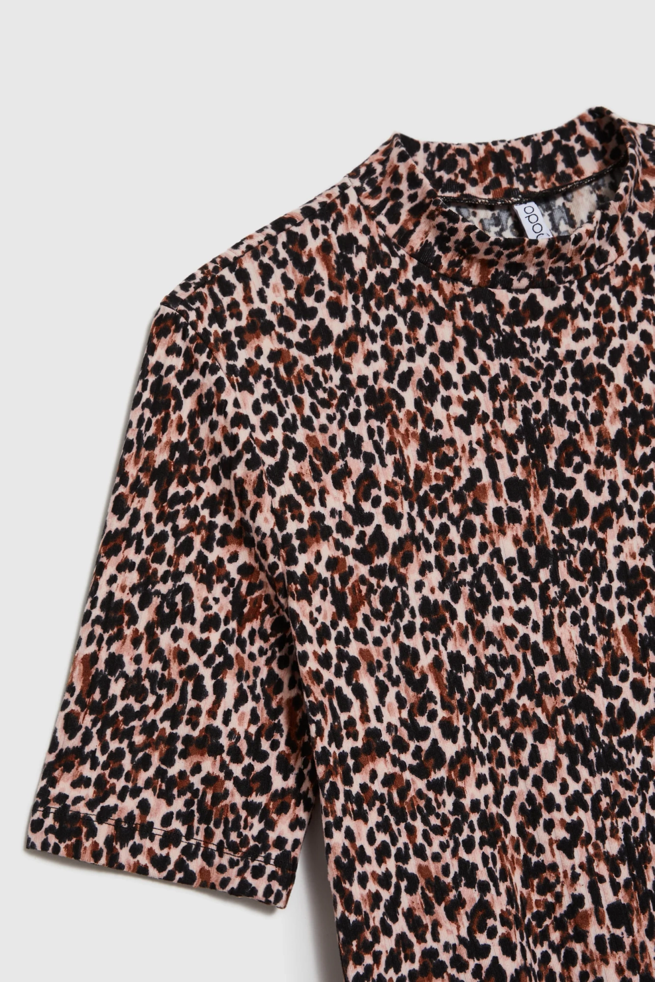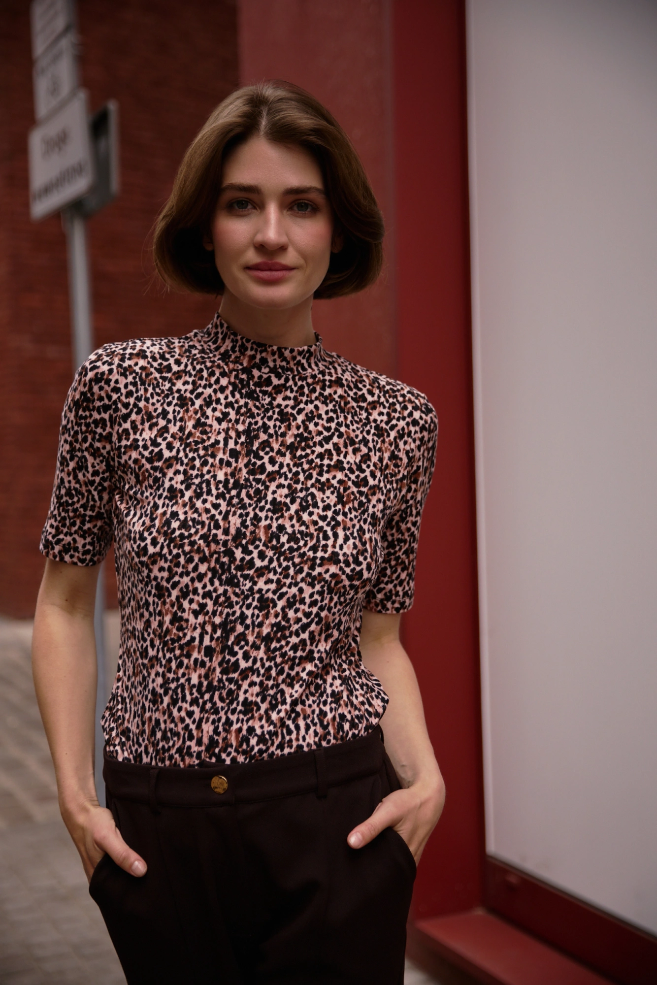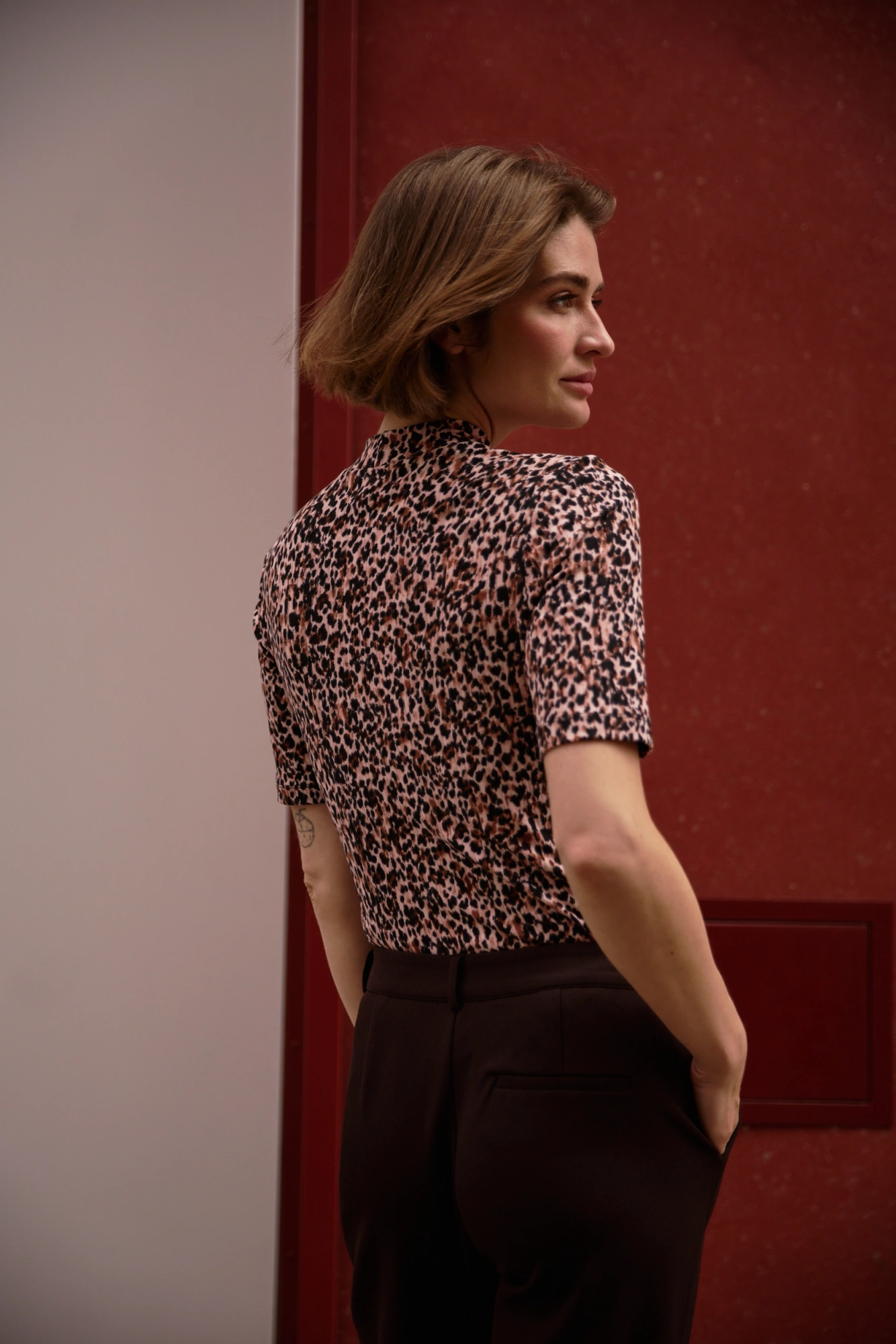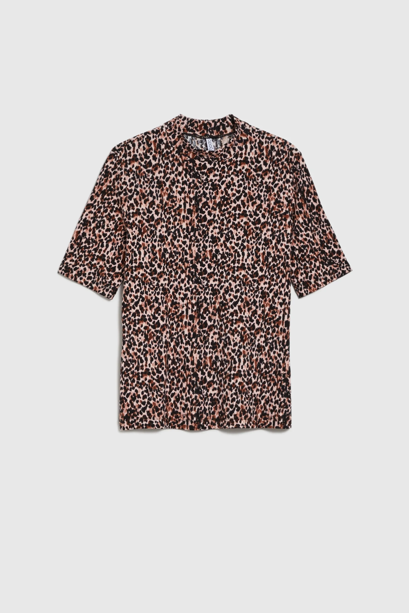 95%POLIESTER,5%ELASTAN Bluzka t-shirt o zwierzęcym wzorze w kolorach brązu to propozycja dla kobiet poszukujących oryginalnych, modnych stylizacji. Strukturalny materiał podkreśla sylwetkę, a dopasowany fason z krótkim rękawem oraz półgolfem gwarantuje nowoczesny wygląd i komfort noszenia nawet w ciągu całego dnia.  Idealna na spotkania towarzyskie, wyjścia do miasta czy casualowe dni w pracy. Znakomicie komponuje się zarówno z klasycznymi jeansami, eleganckimi spodniami, jak i spódnicami ołówkowymi czy modnymi szortami.