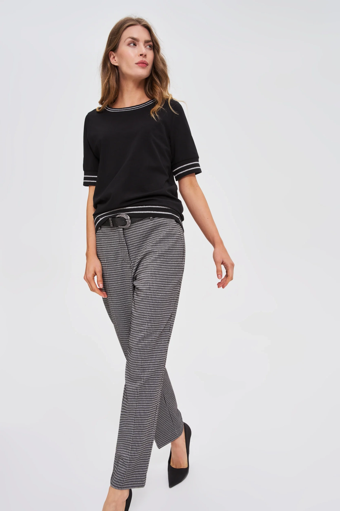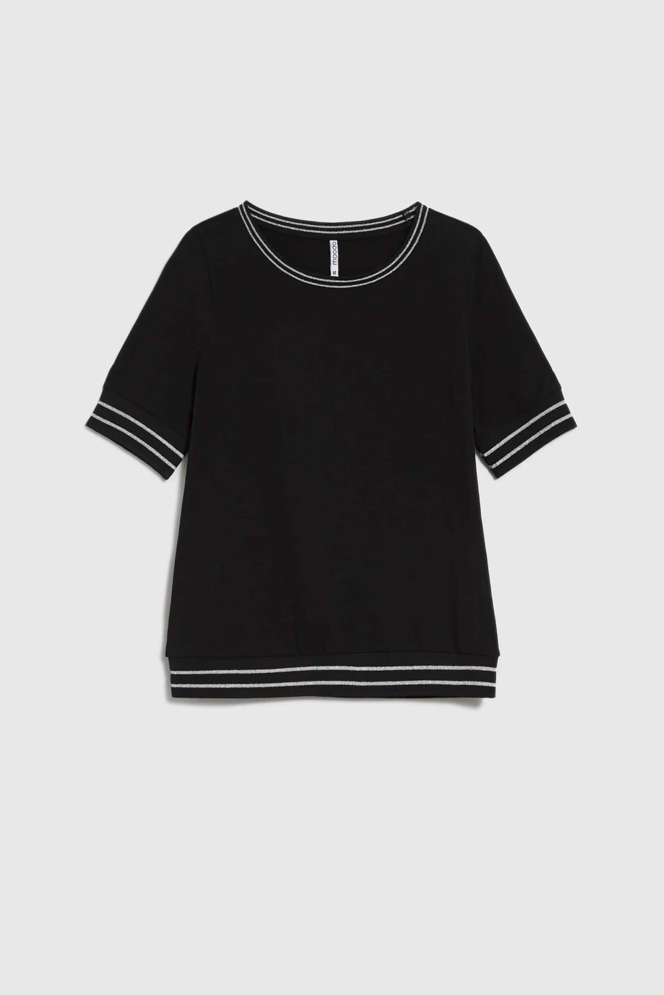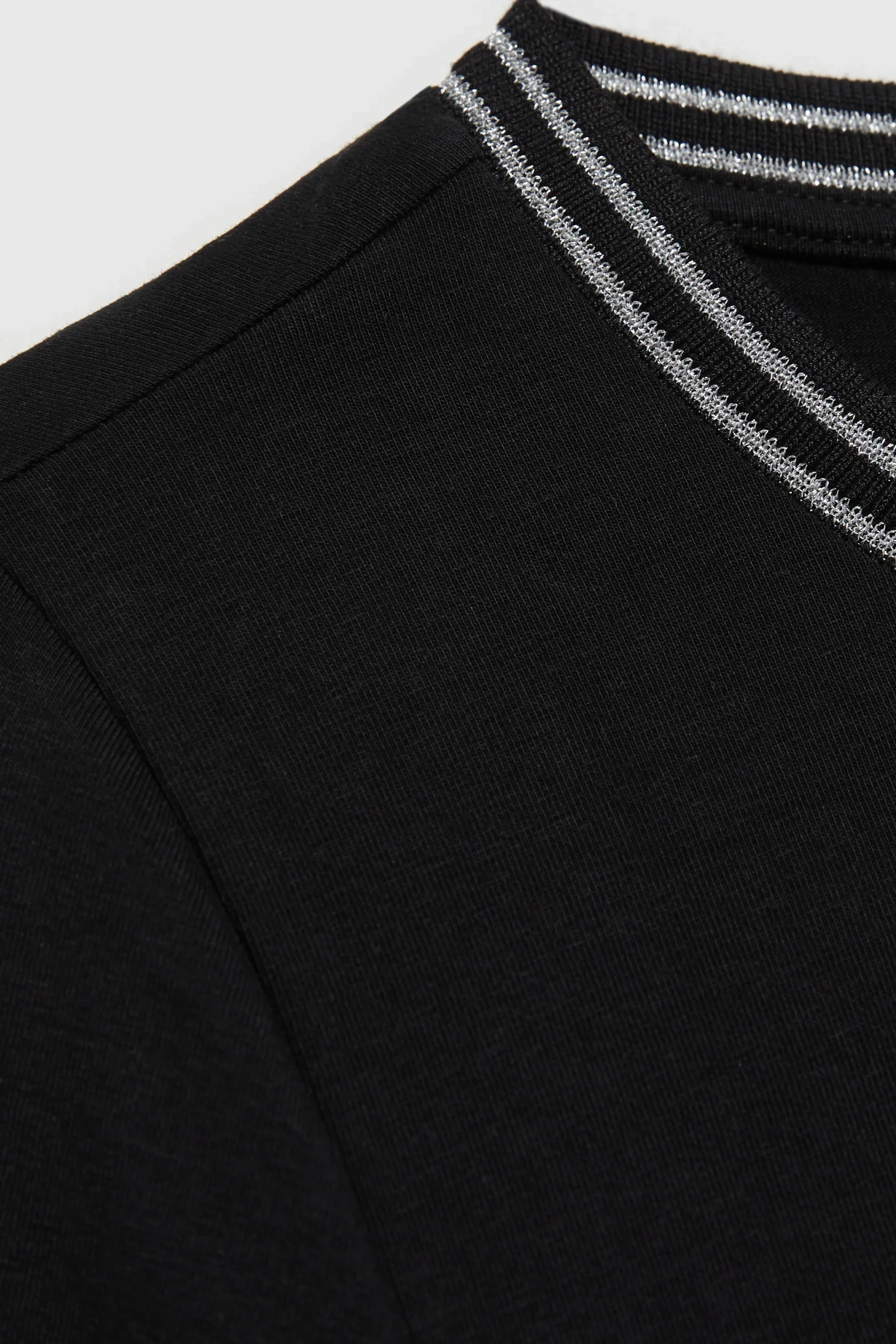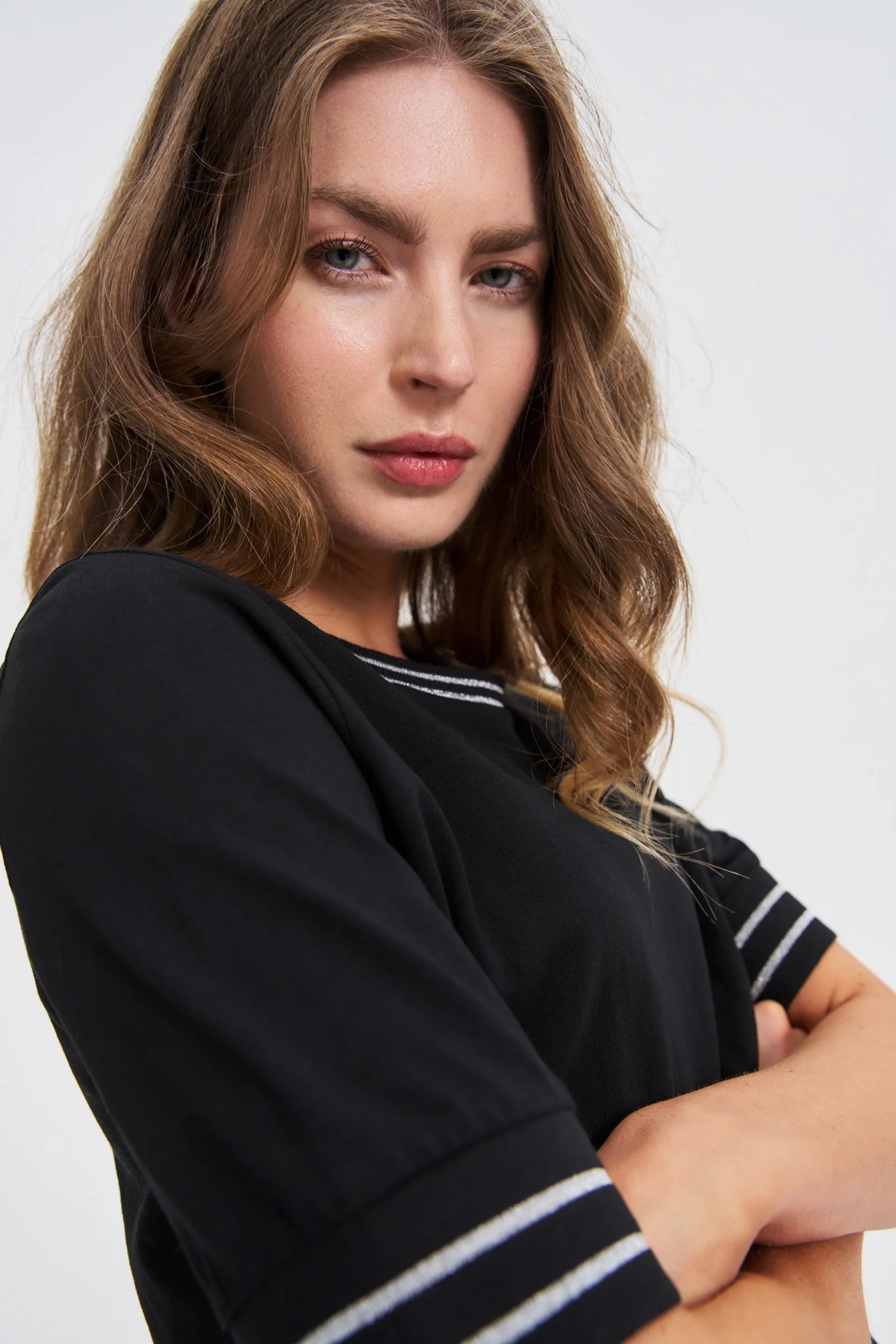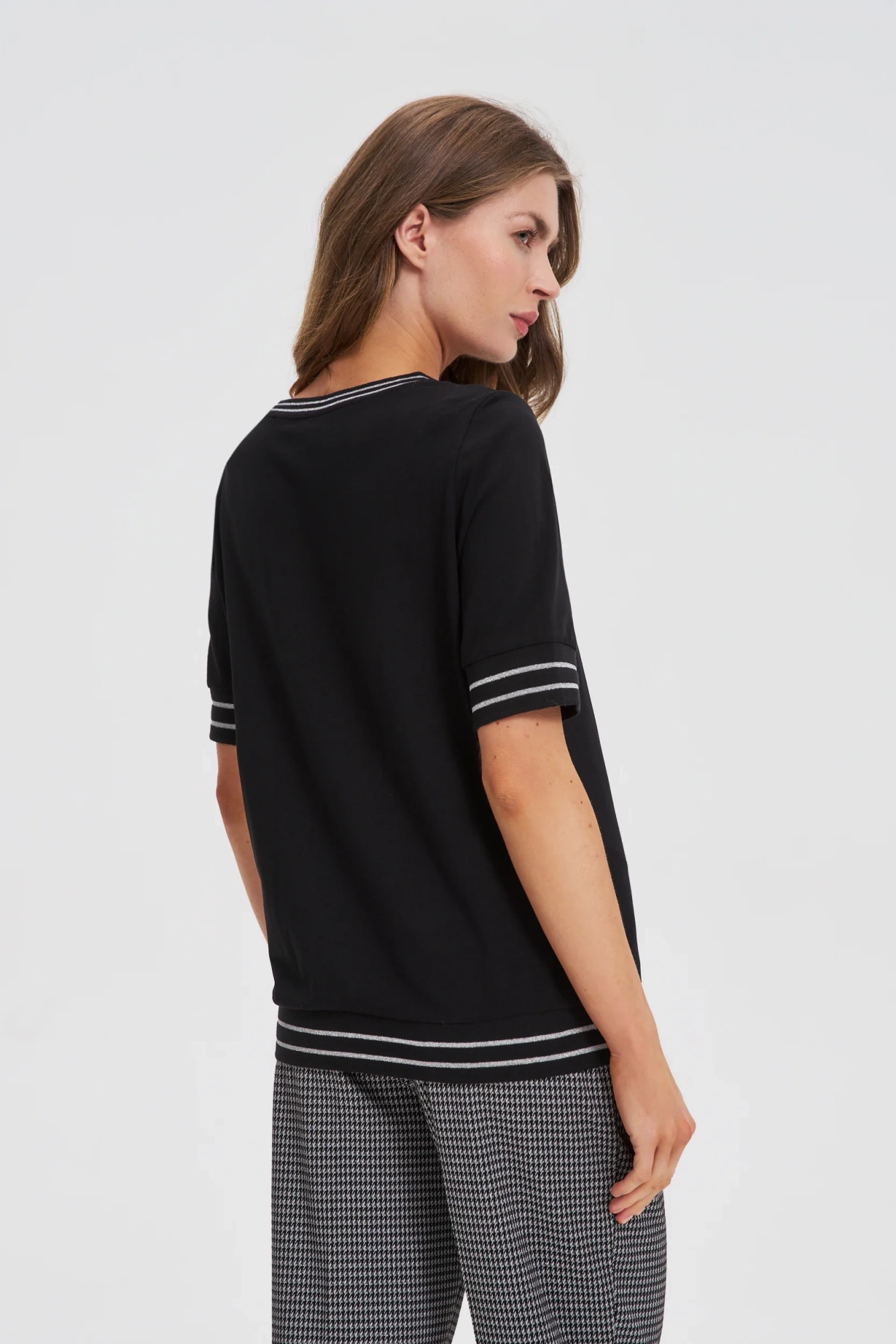 95%BAWEŁNA,5%ELASTAN Czarny t-shirt damski wyróżnia się minimalistycznym stylem i subtelną elegancją. Gładka powierzchnia bez wzoru została przełamana delikatnym akcentem w postaci metalicznej nitki oraz ozdobnej taśmy przy dekolcie. Luźny krój zapewnia swobodę ruchów i komfort przez cały dzień. Ozdobny, okrągły dekolt podkreśla szyję, dodając niepowtarzalnego charakteru każdej stylizacji. Naturalna bawełna została połączona z domieszką włókien syntetycznych, które odpowiadają za trwałość i łatwość pielęgnacji. Idealny wybór zarówno na co dzień, jak i na wyjątkowe okazje, takie jak spotkania ze znajomymi czy wyjścia do miasta.